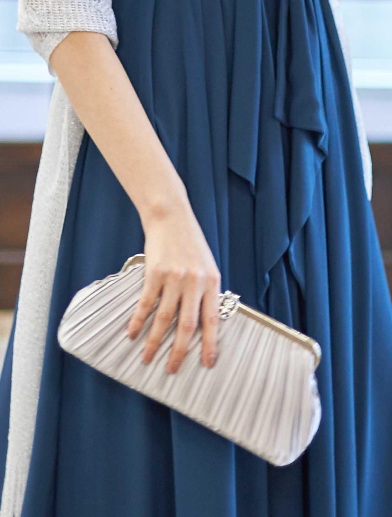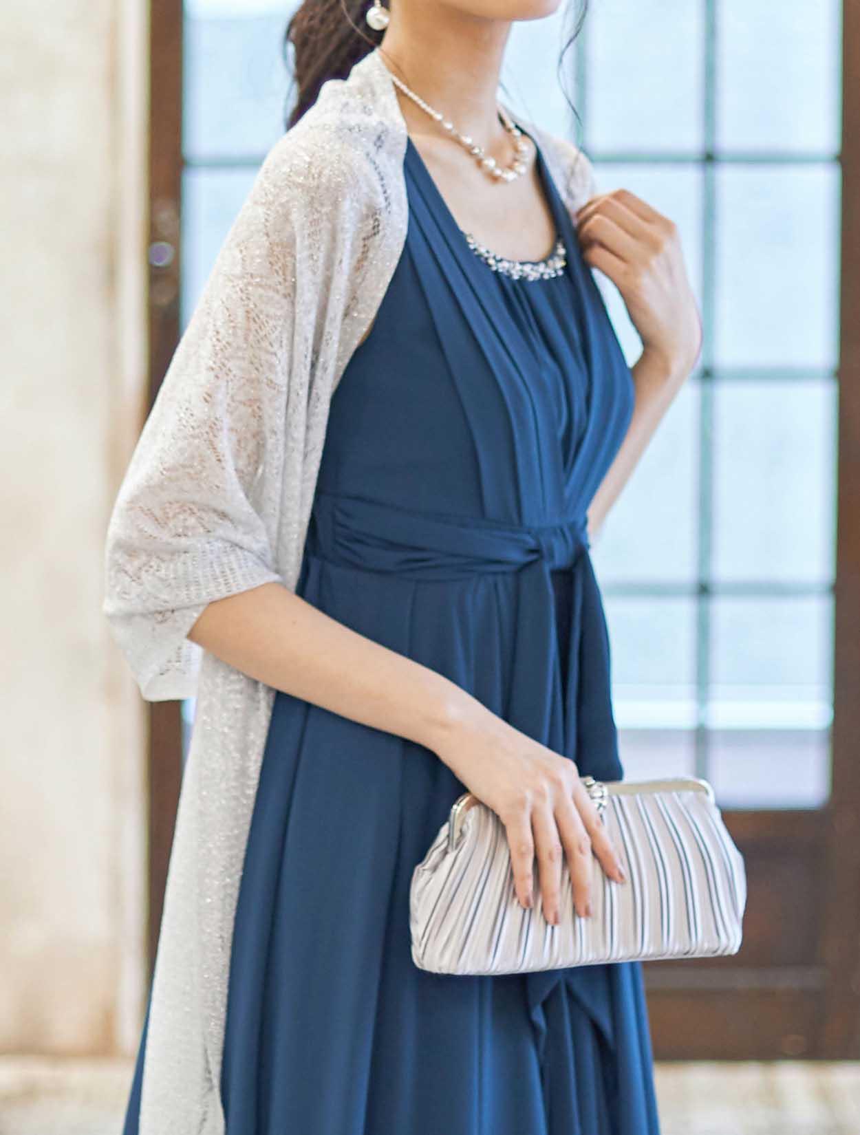 ■落ち着いた印象の深いグリーンのドレスはシルバーのストールと合わせて華やかな印象に。