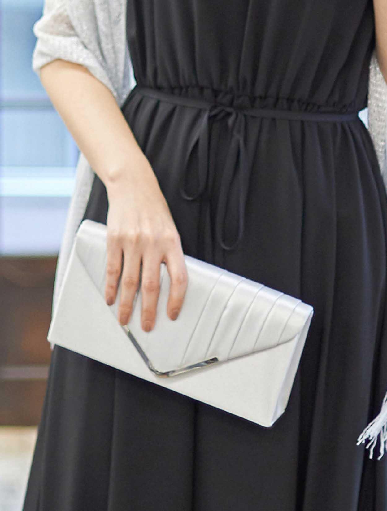 ■透け感のあるブラックドレスにシルバーのストールを合わせたクールなコーディネートです。
