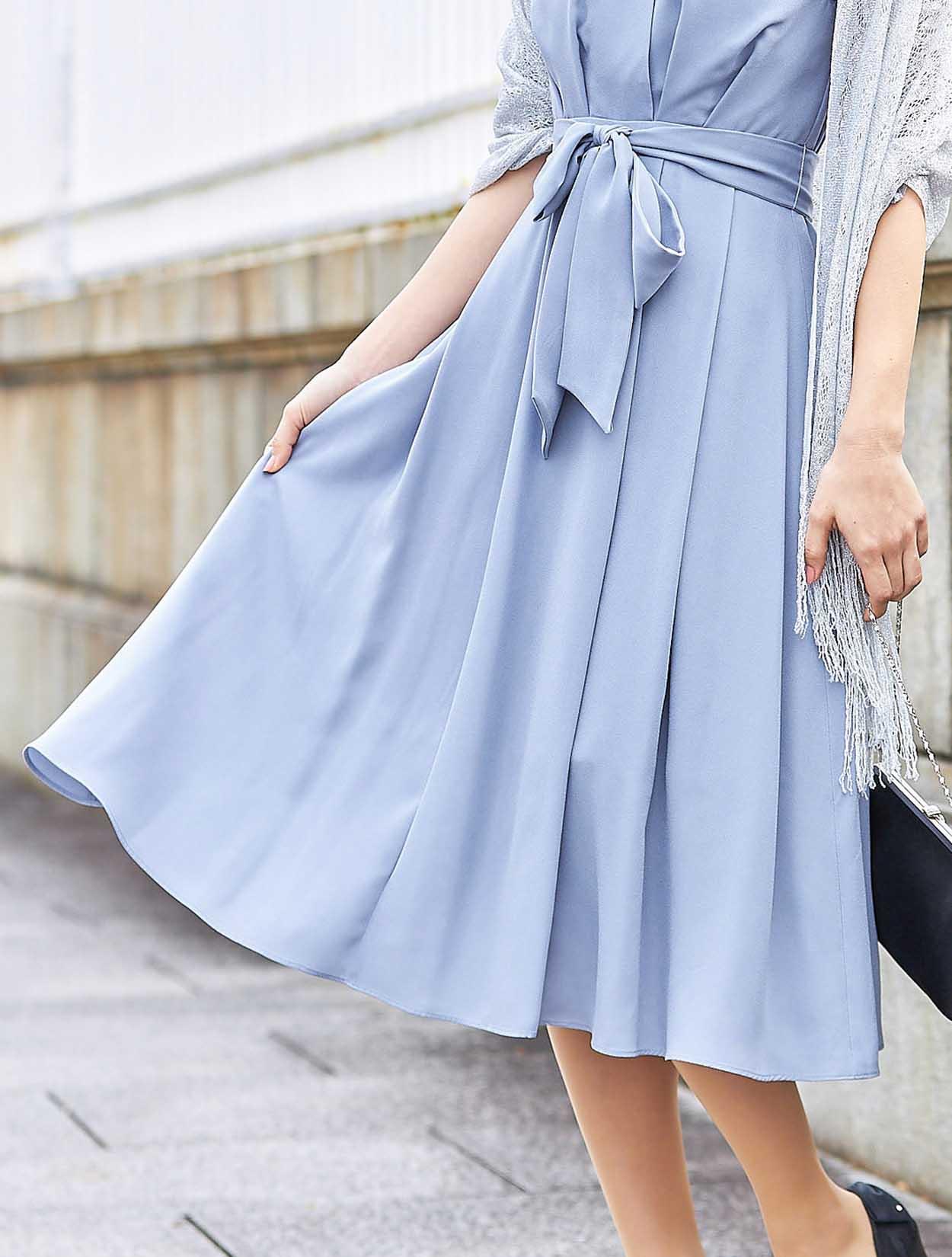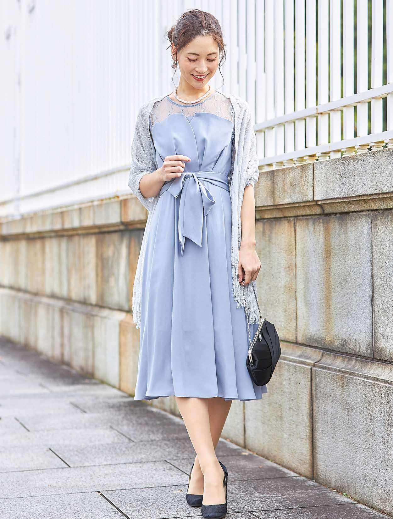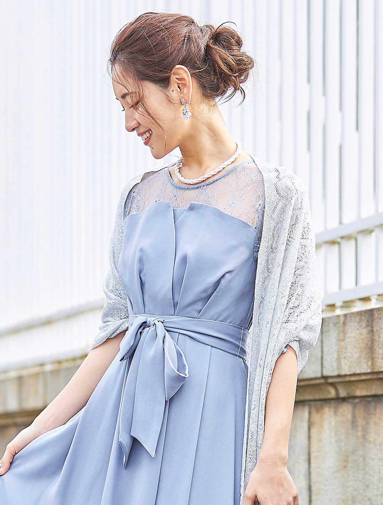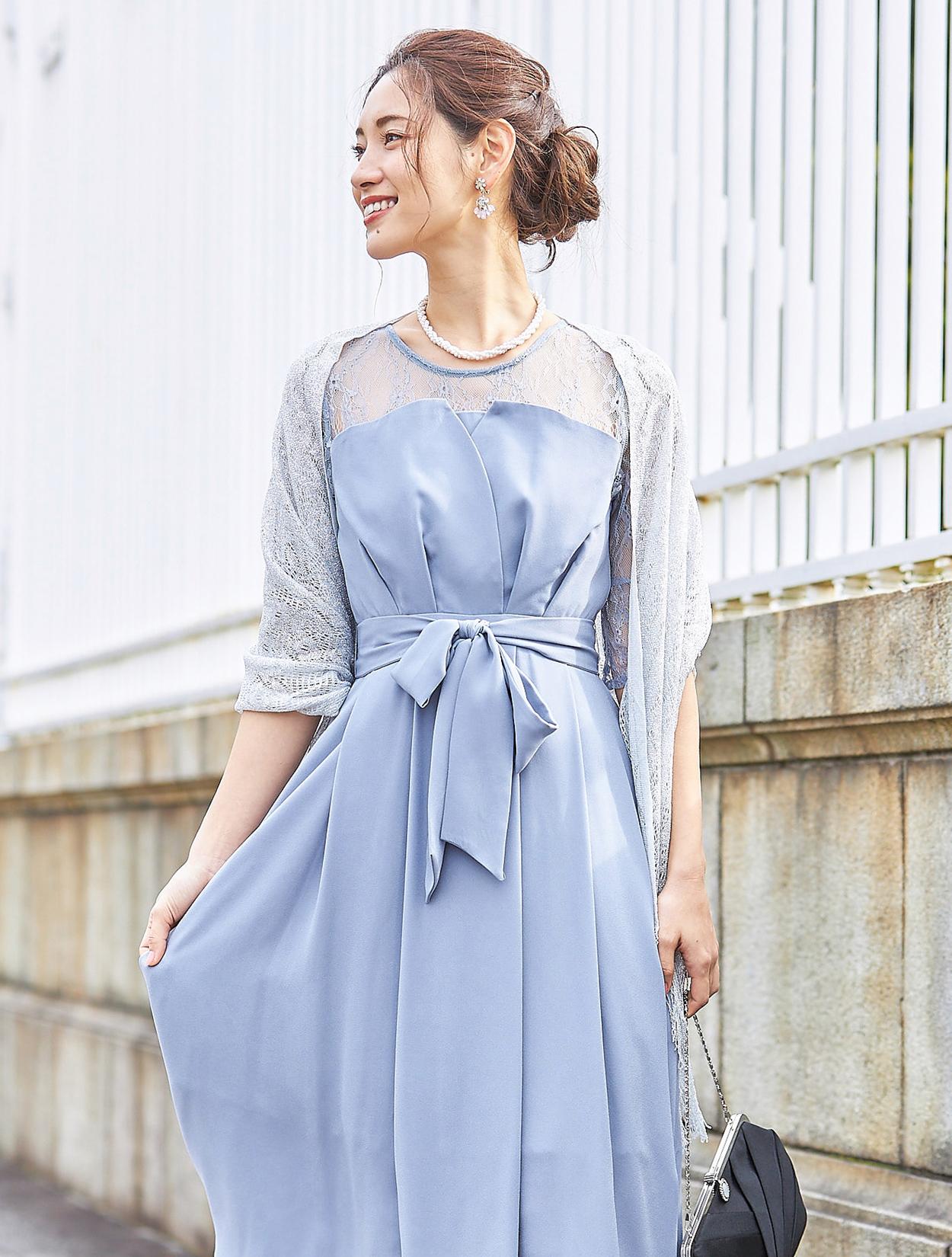 ■ビスチェ風に切替のあるミモレ丈のドレスです。デコルテや袖部分はレース素材で、華やかなデザイン。