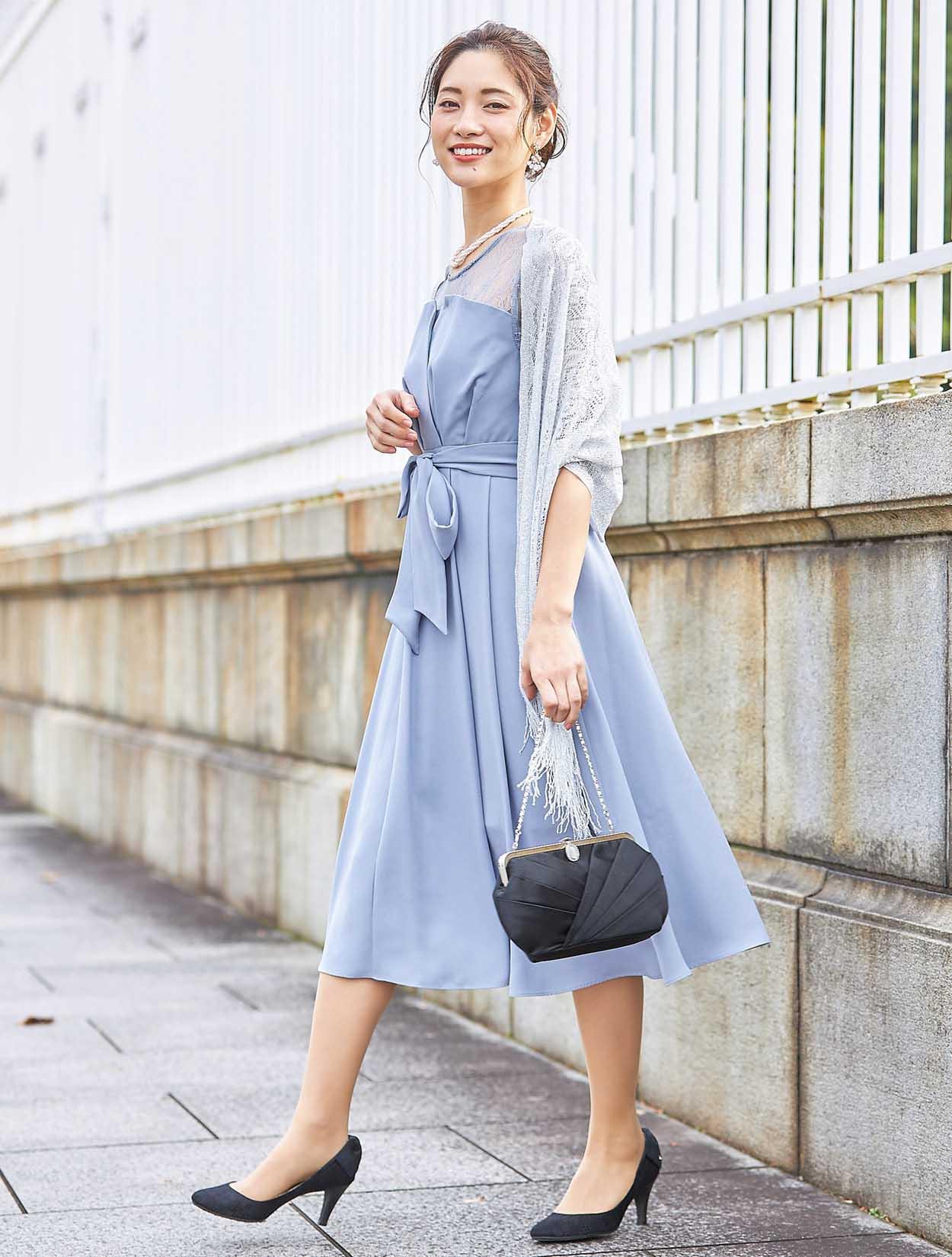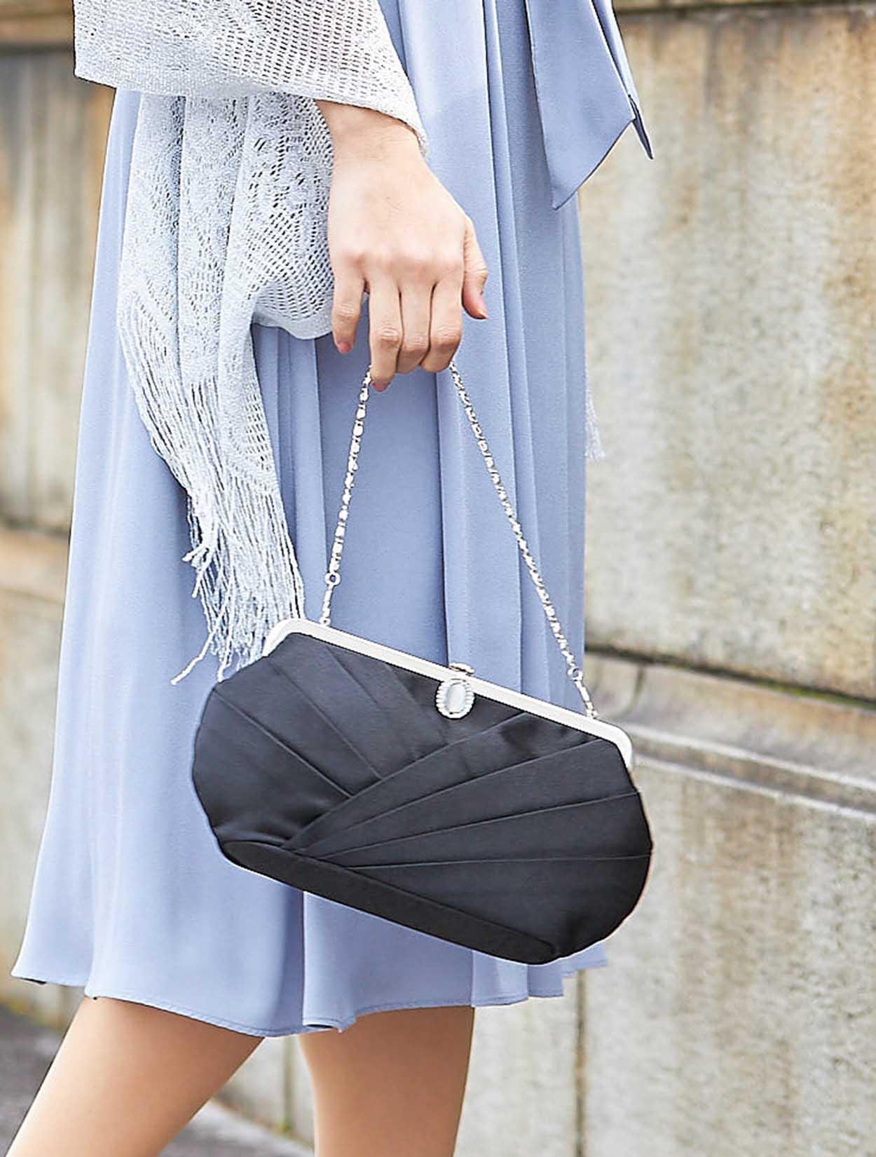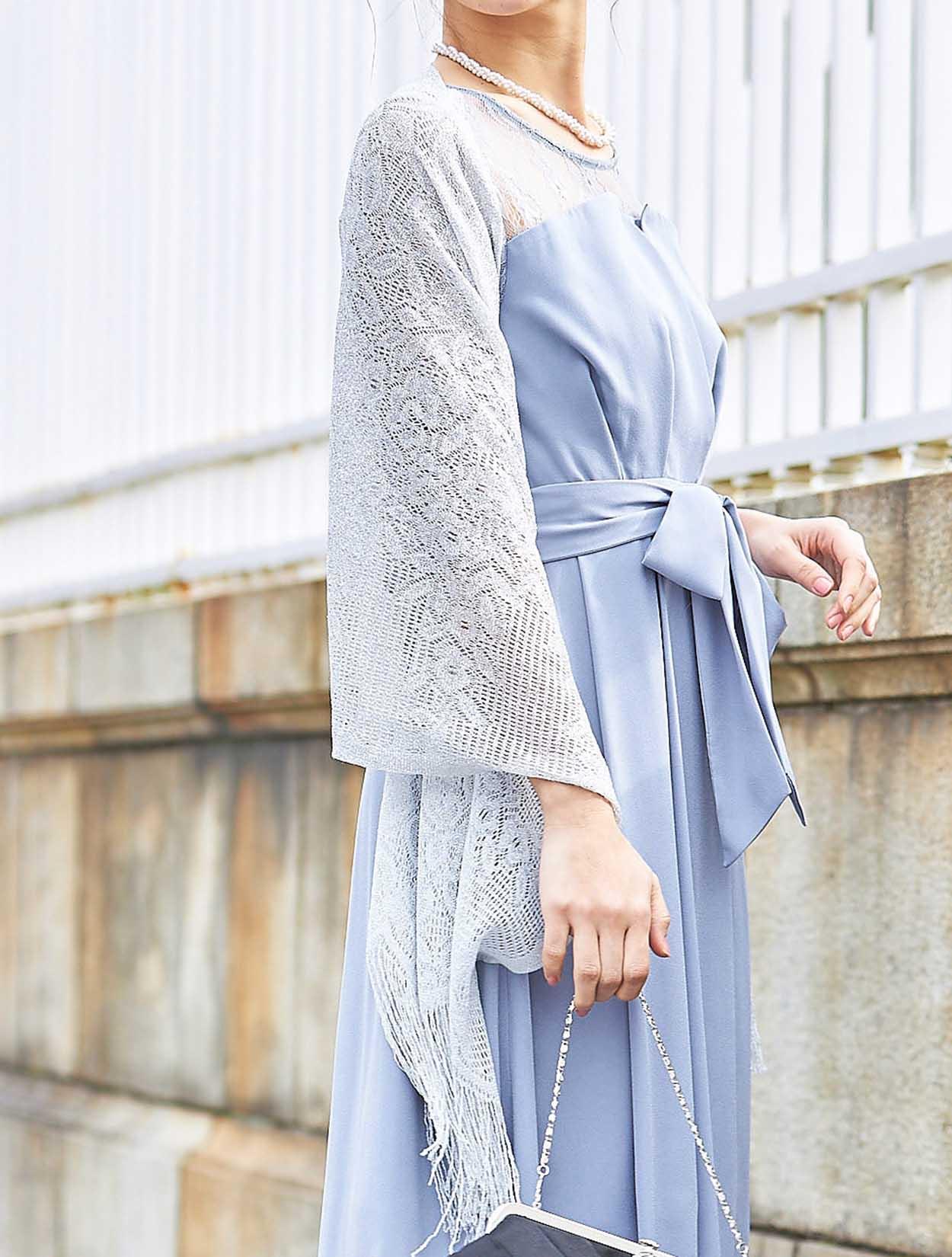 ■ラメストールを羽織ればお袖付きのドレスもより華やかなパーティー仕様に。ストールはたたんでもシワになりにくいので、持ち運びにも◎!ブラックのバッグが全体を引き締めるポイントです。