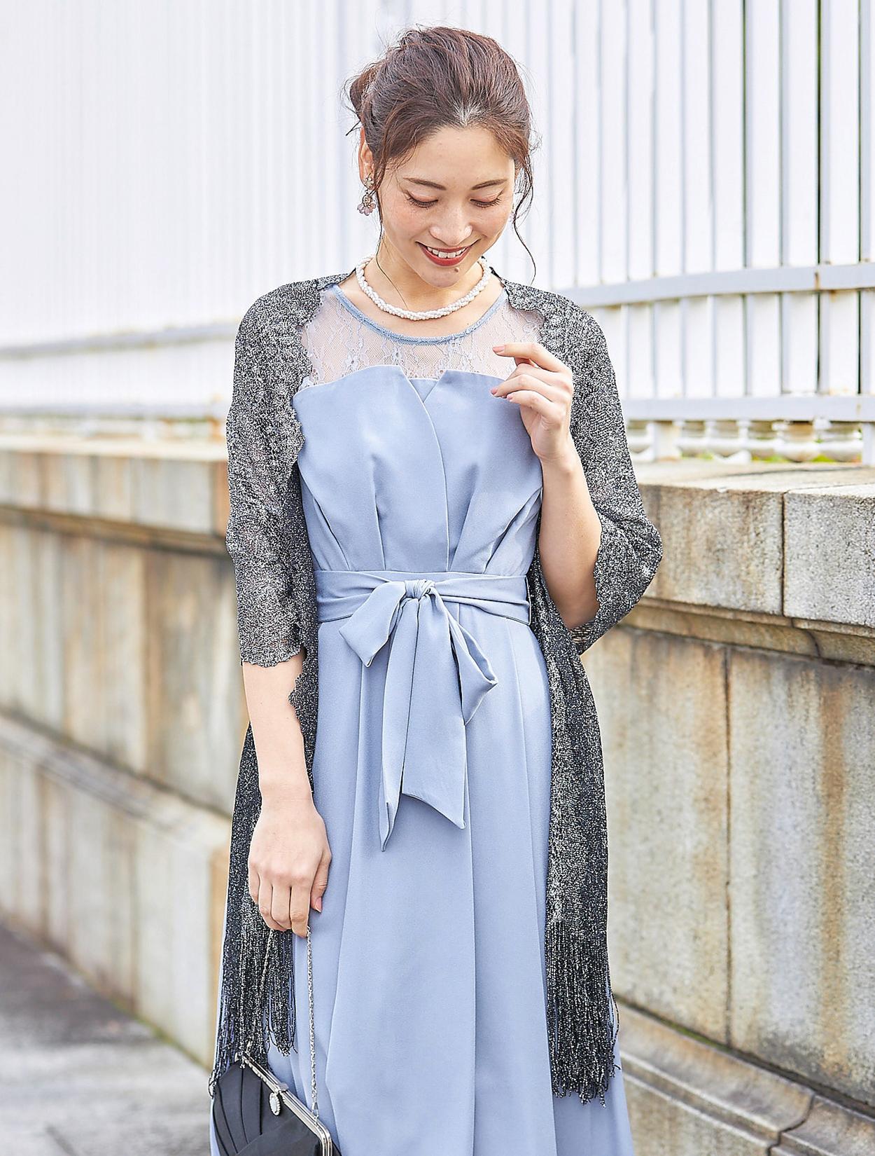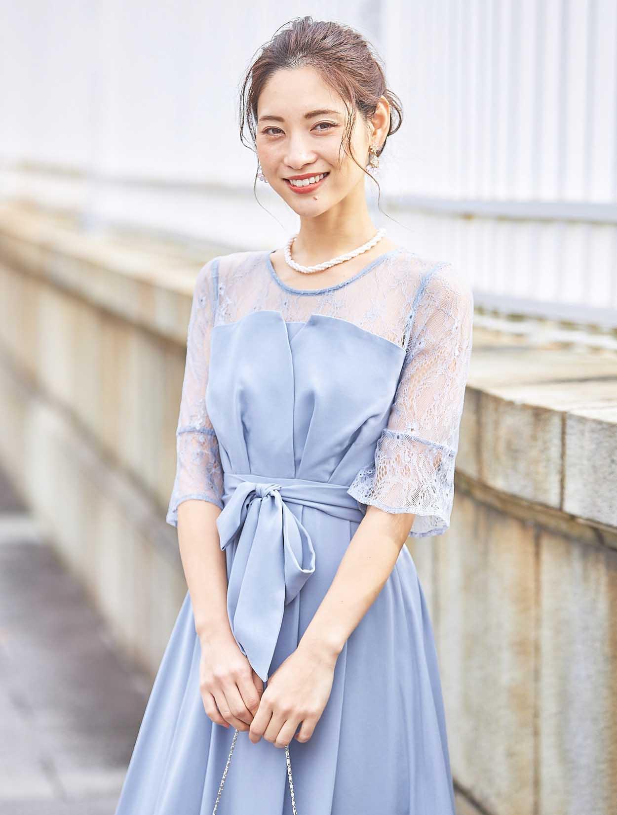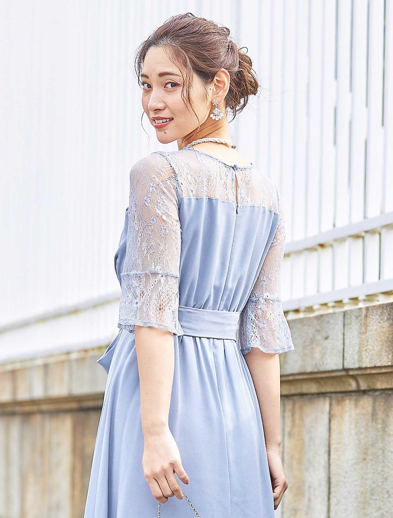 ■ビスチェ風に切替のあるミモレ丈のドレスです。デコルテや袖部分はレース素材で、華やかなデザイン。