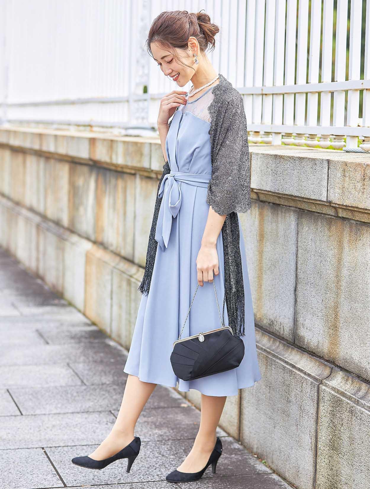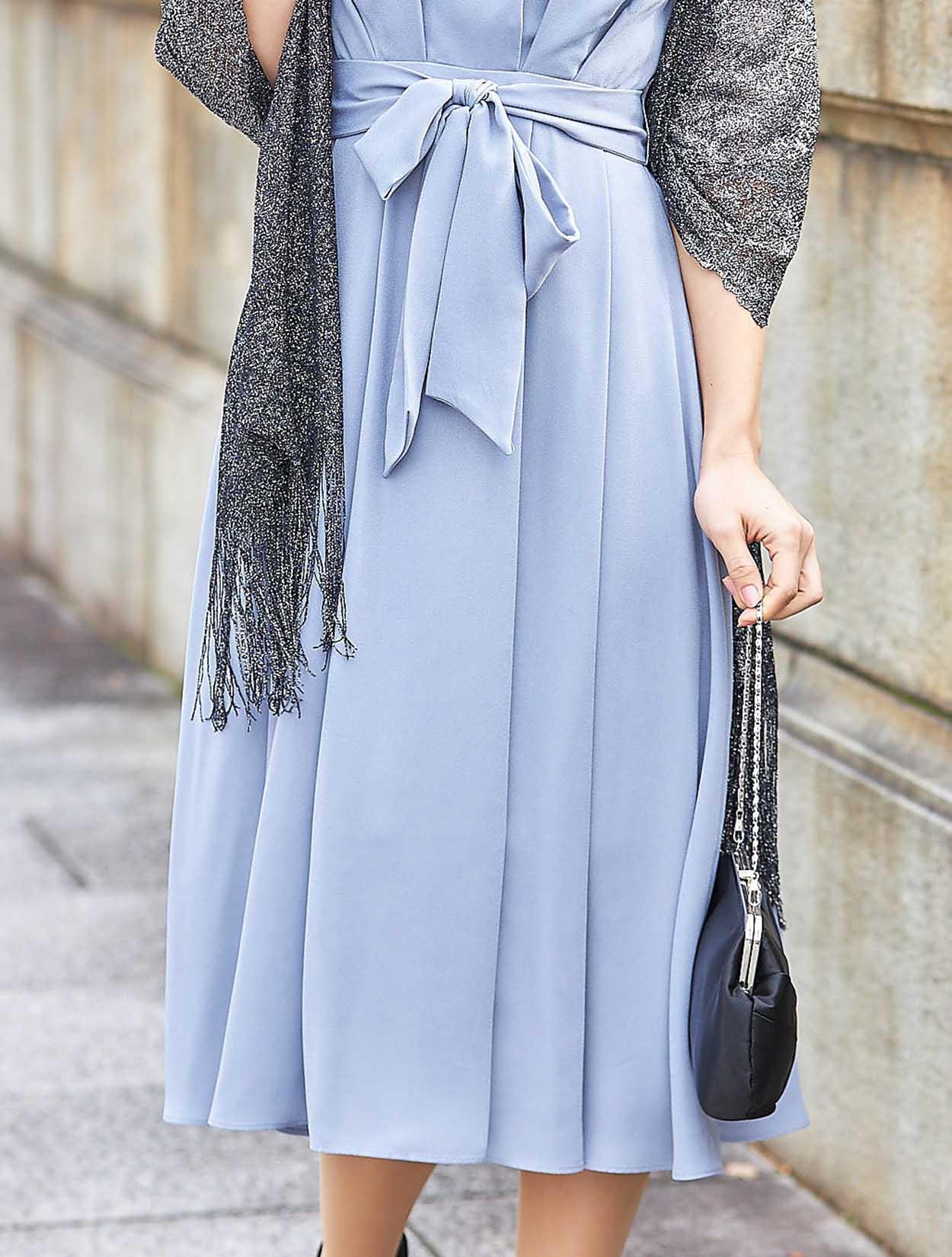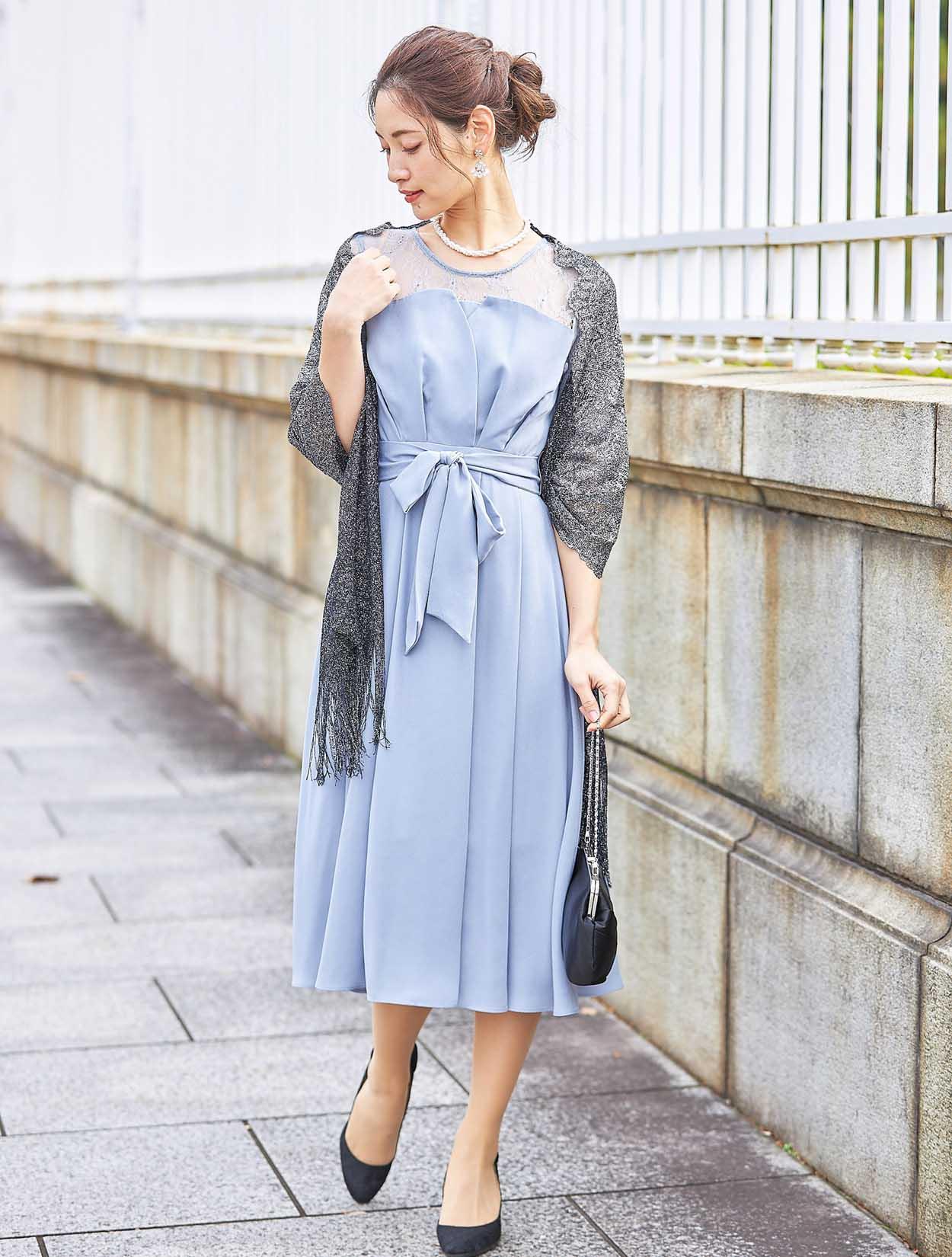 ■ビスチェ風に切替のあるミモレ丈のドレスです。デコルテや袖部分はレース素材で、華やかなデザイン。