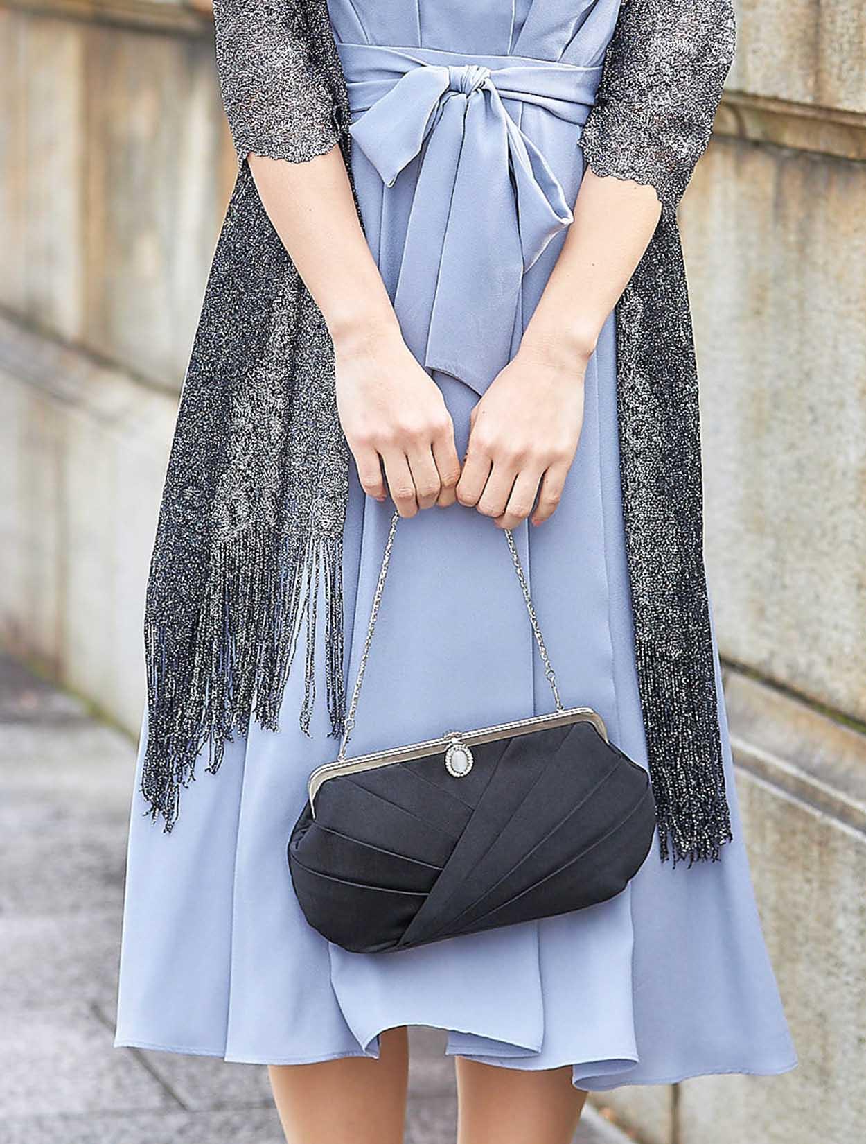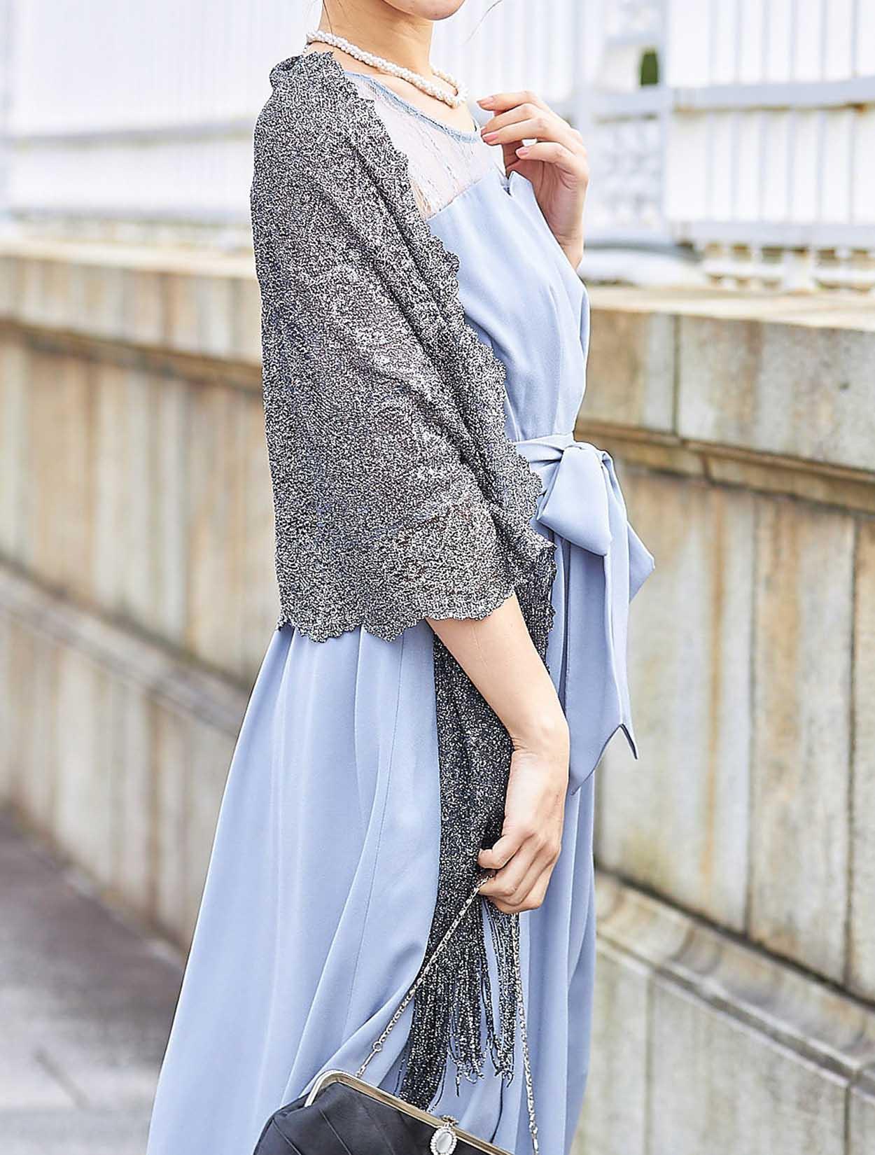■ブラックのラメストールがメリハリのあるコーディネートです。ストールのスカラップ柄がブラックでも華やかな印象に。ラメの多い方と少ない方と、お好みでリバーシブルでお使い頂けます。