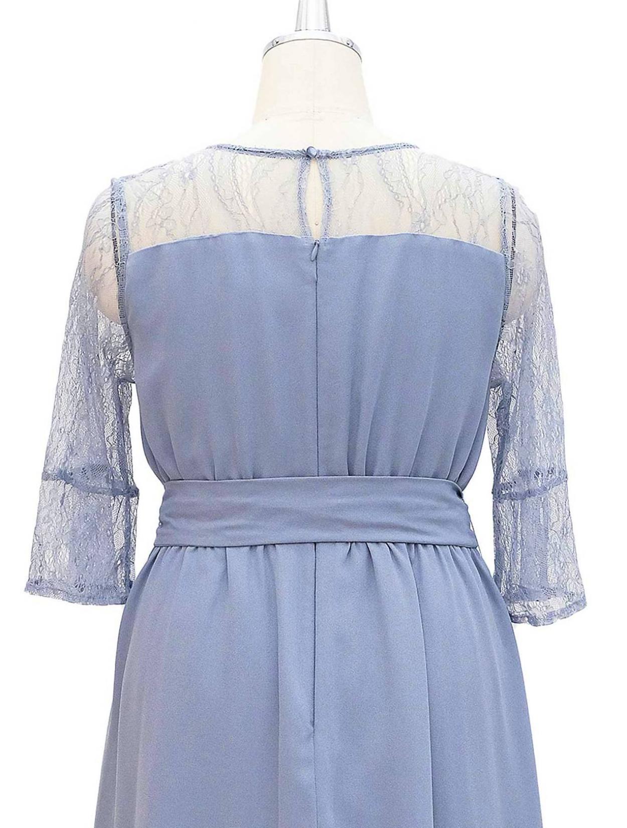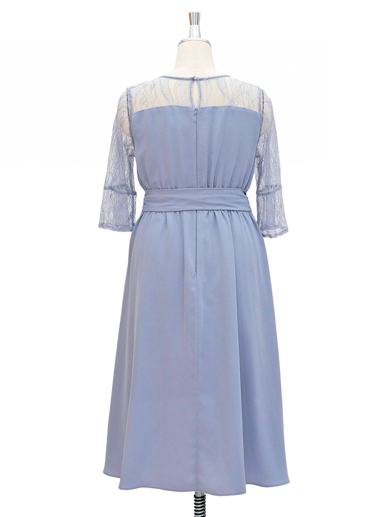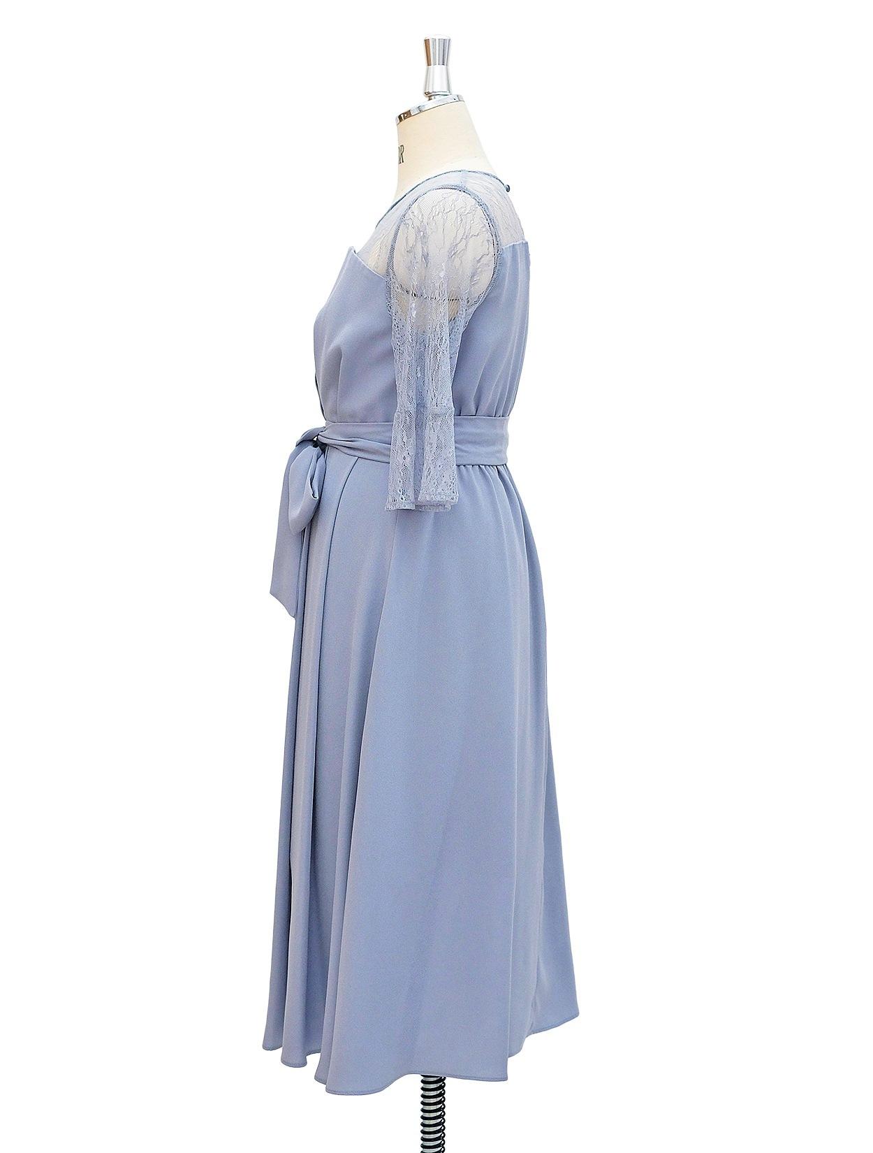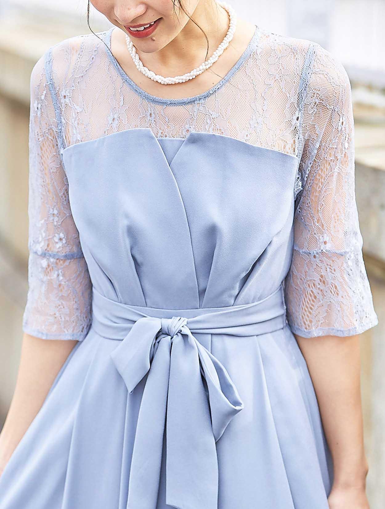 ■ビスチェ風に切替のあるミモレ丈のドレスです。デコルテや袖部分はレース素材で、華やかなデザイン。