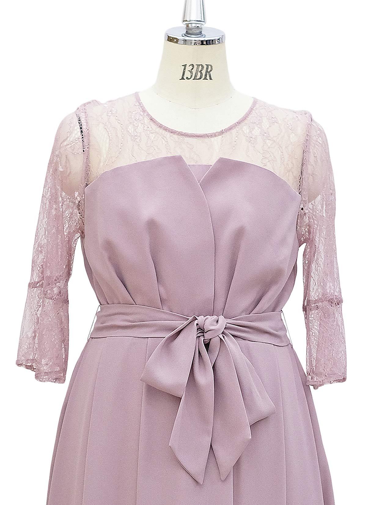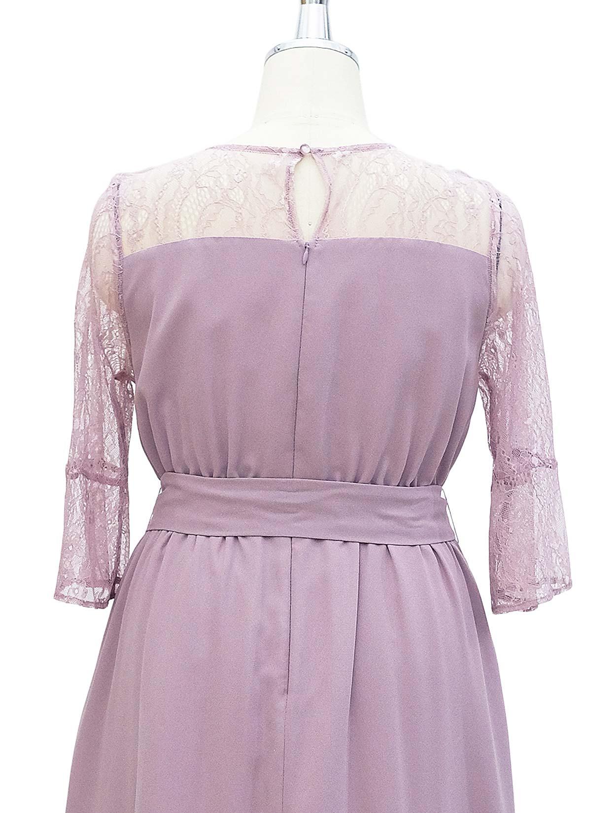 ■ビスチェ風に切替のあるミモレ丈のドレスです。デコルテや袖部分はレース素材で、華やかなデザイン。