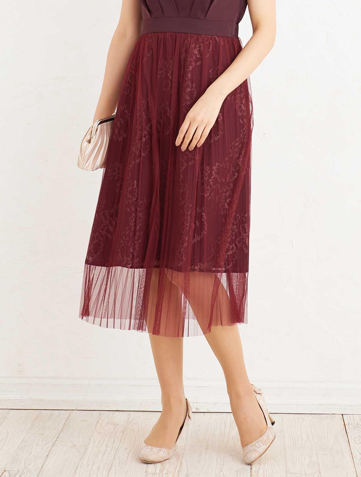 ■抜き花柄にチュールスカートを重ねたレイヤードデザインのスカートで可愛らしさのあるドレスです。