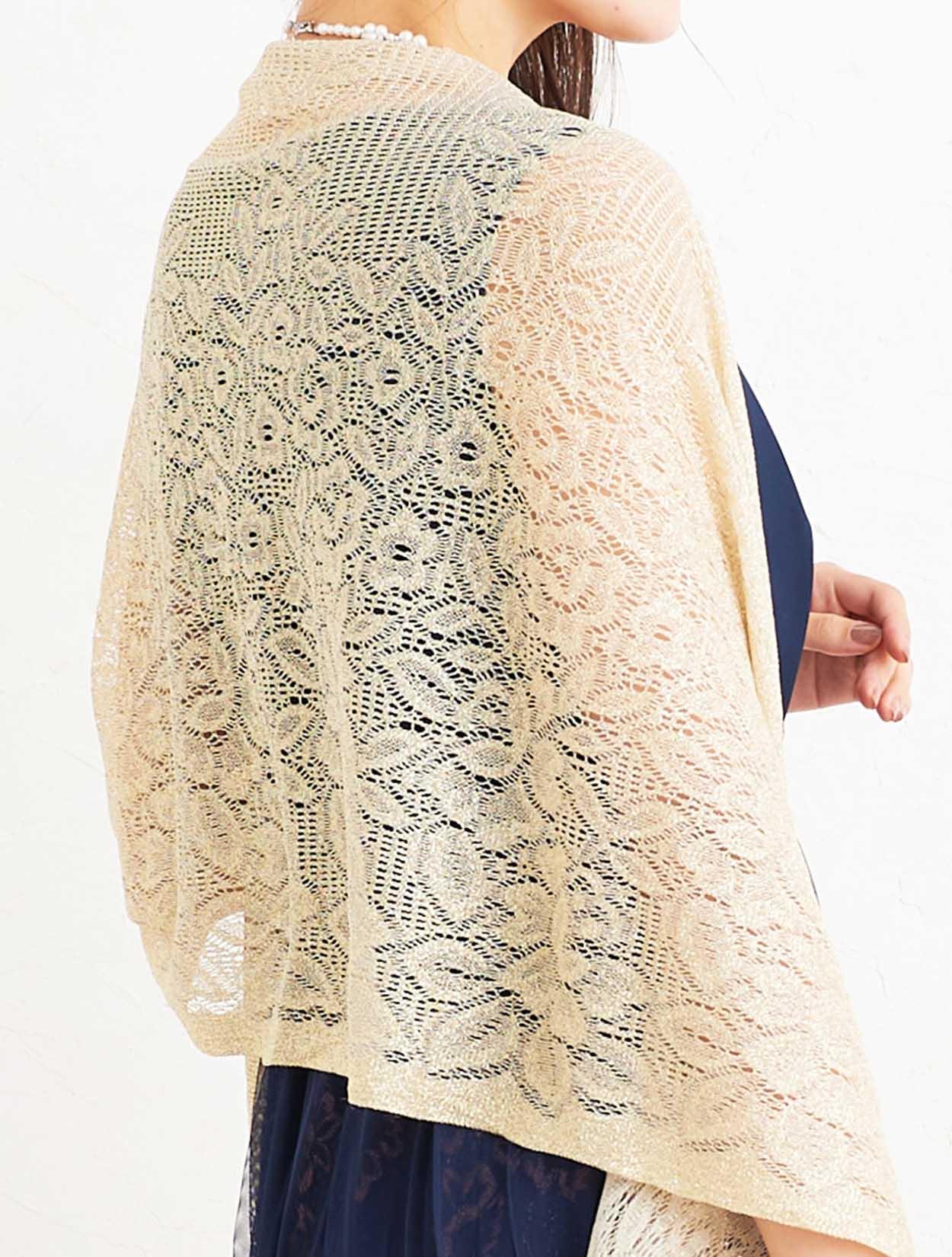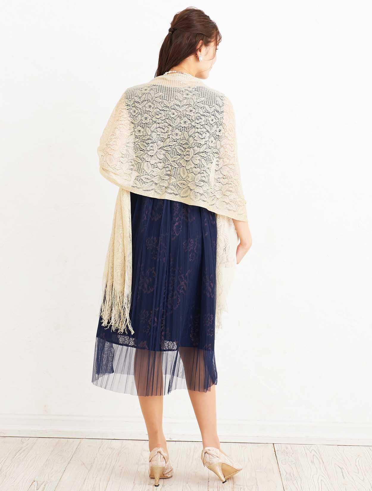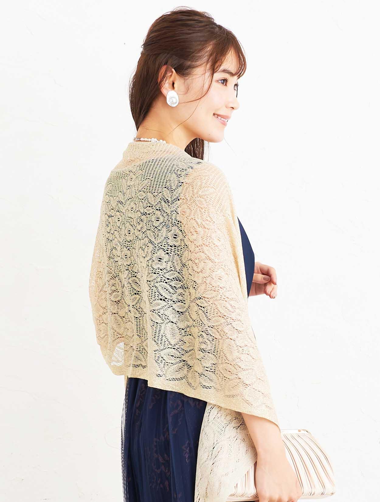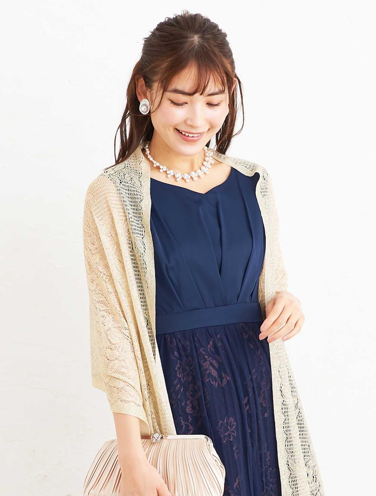 ■ゴールドのショールを合わせた華やかなパーティースタイル。ネイビードレスでも地味にならないコーディネートです。