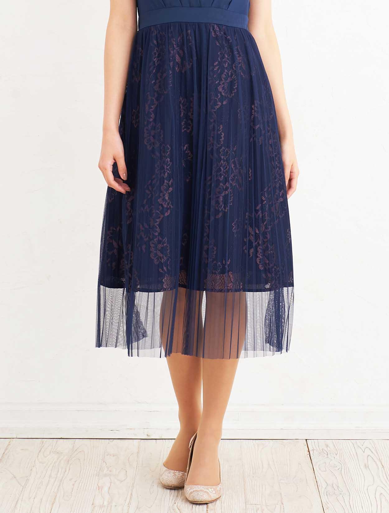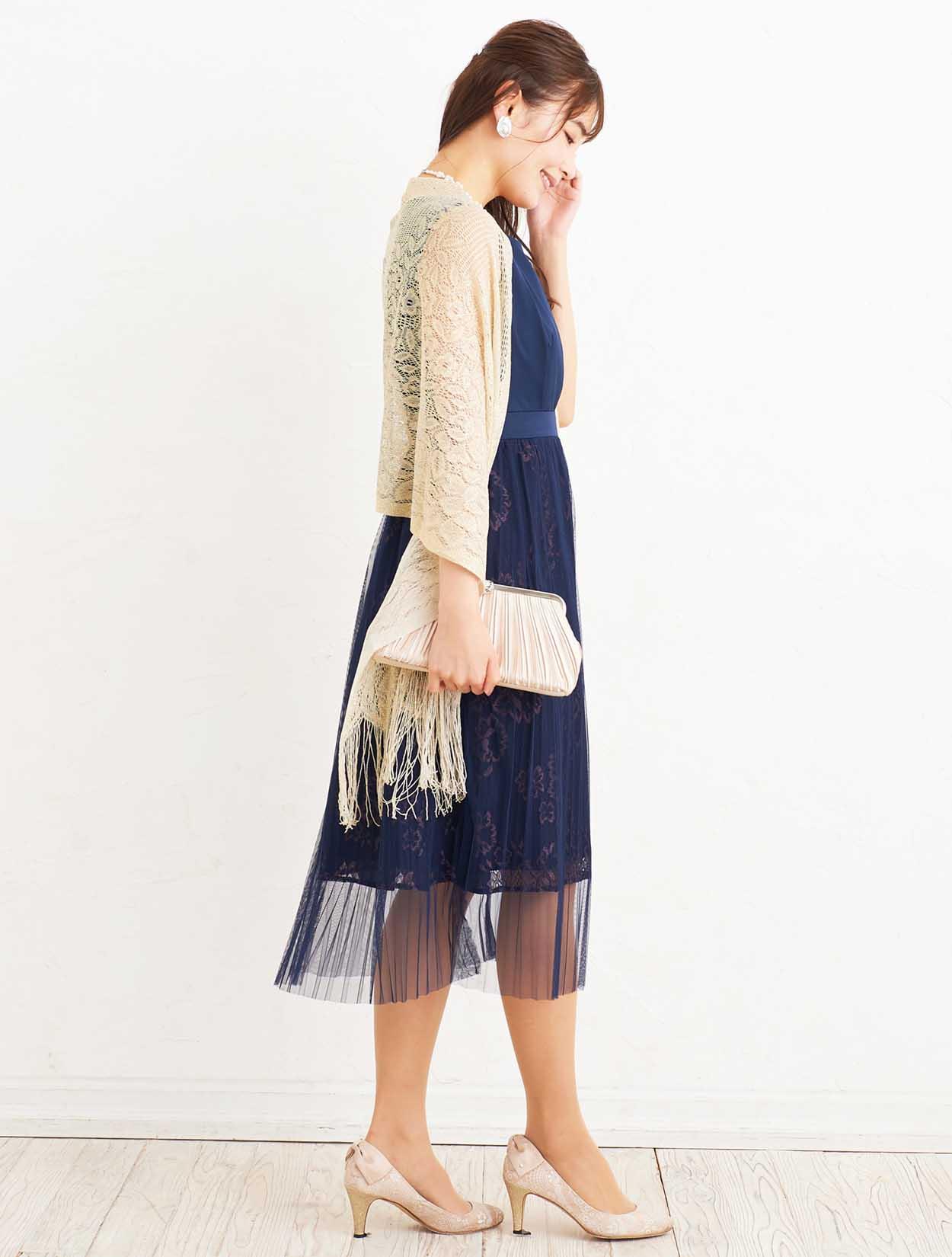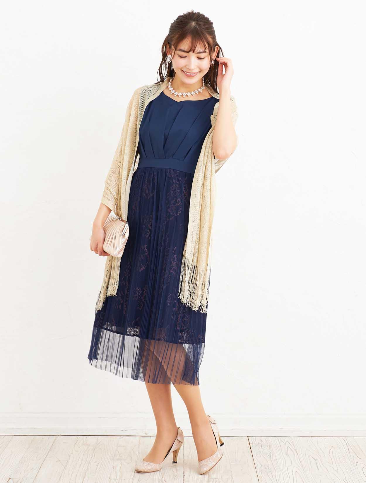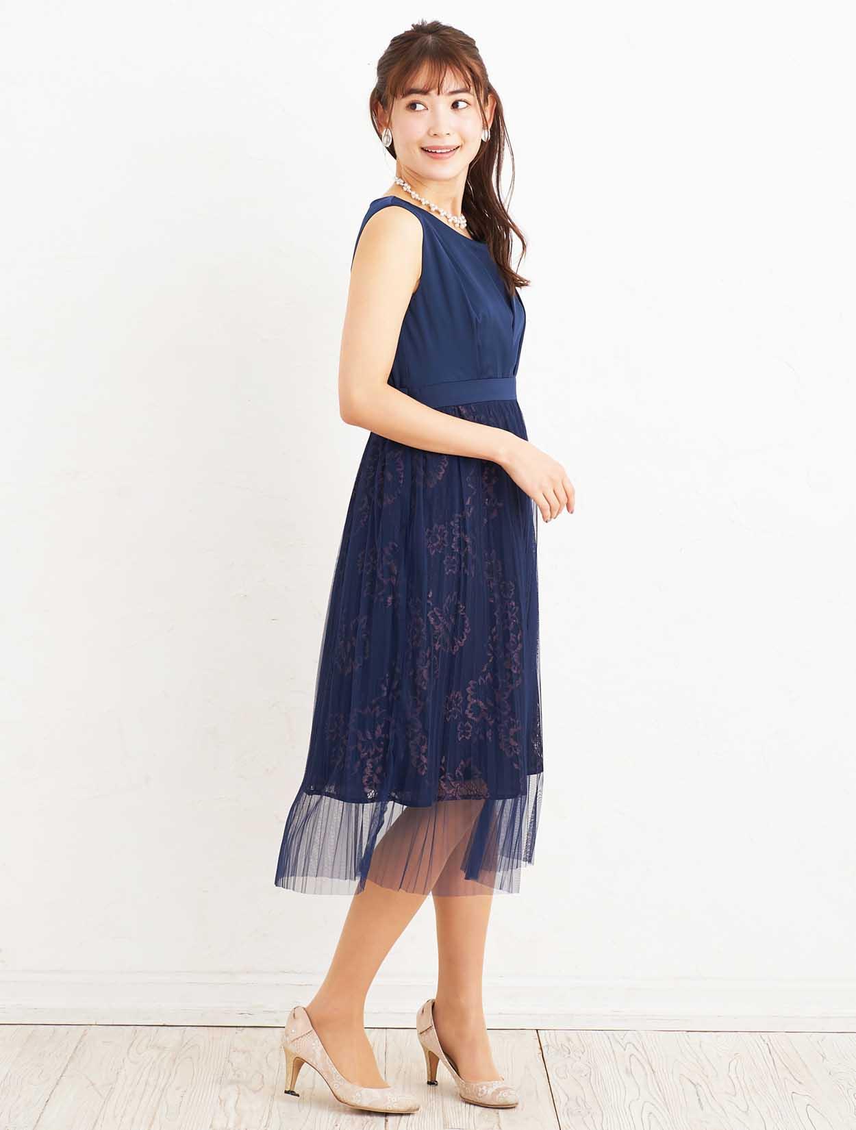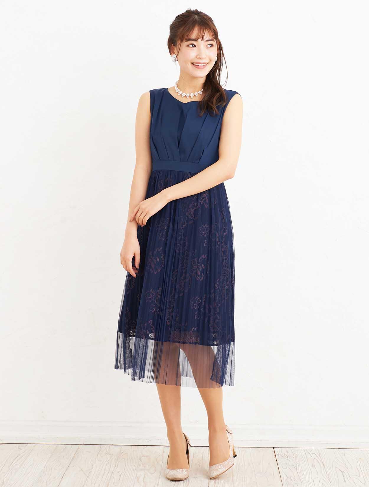 ■会社の式典や、結婚式、謝恩会など、どんなシーンでも活躍してくれる清楚で可憐なネイビードレスは人気カラーです。