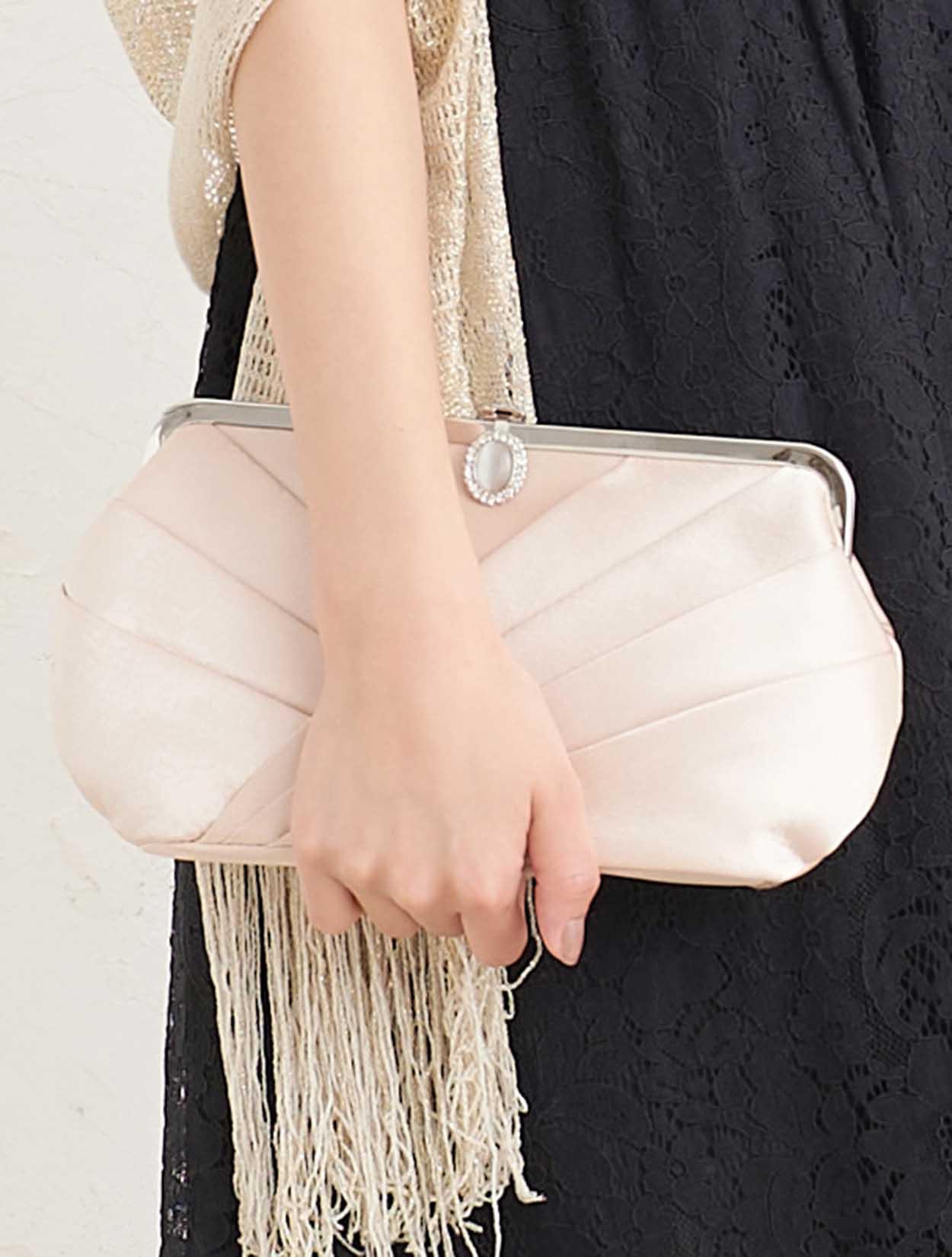 ■上品な光沢と、女性らしい丸みのあるデザインが人気のクラッチバッグは、フェミニンなレースの素材に良く合います。