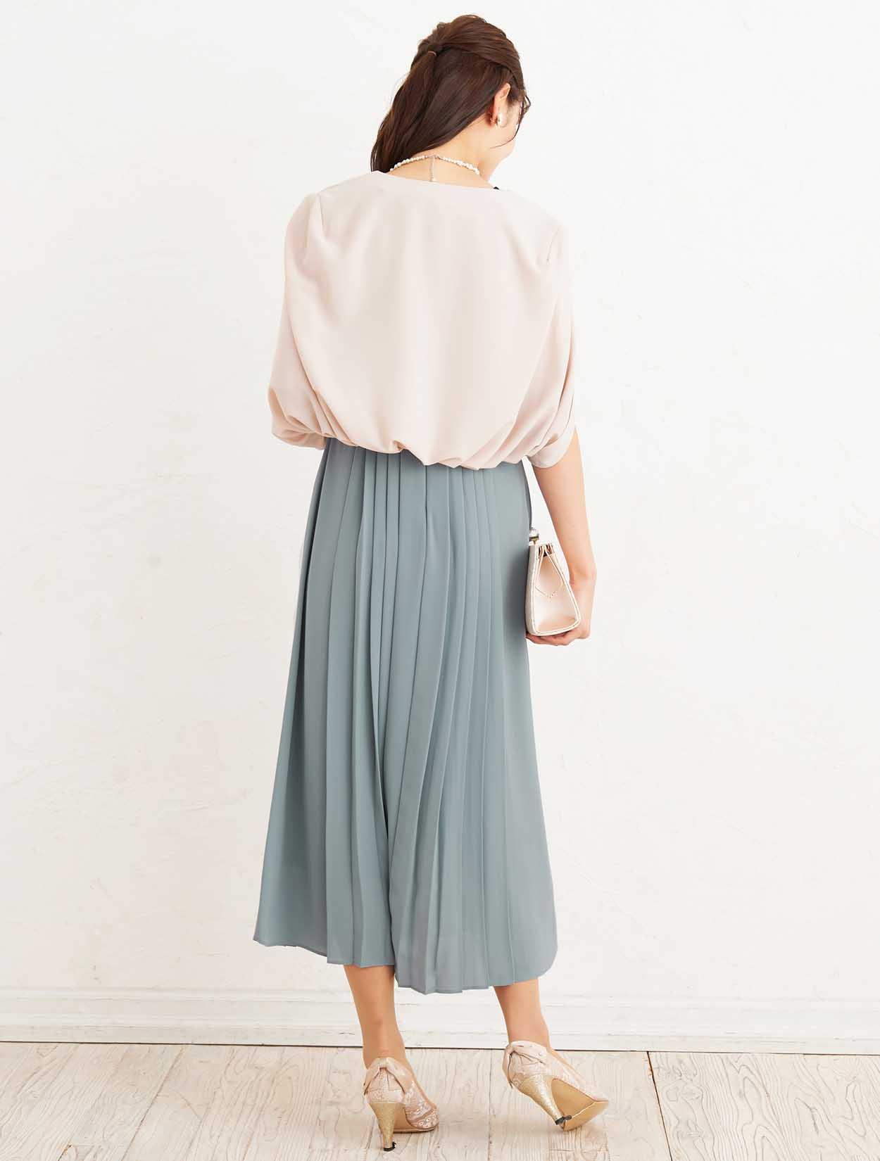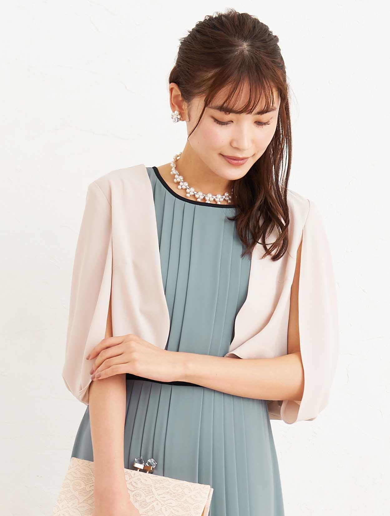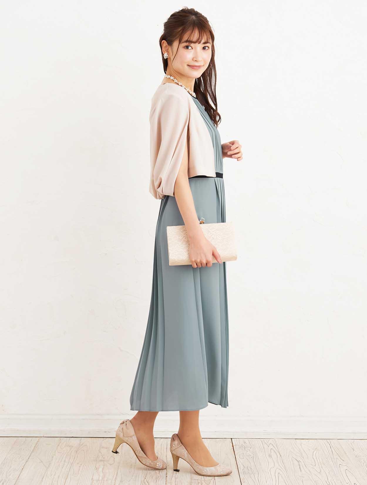 ■上品なサックスブルーのドレスにジャケットボレロを合わせた大人スタイルは、どんなシーンにも活躍できるコーディネートです。