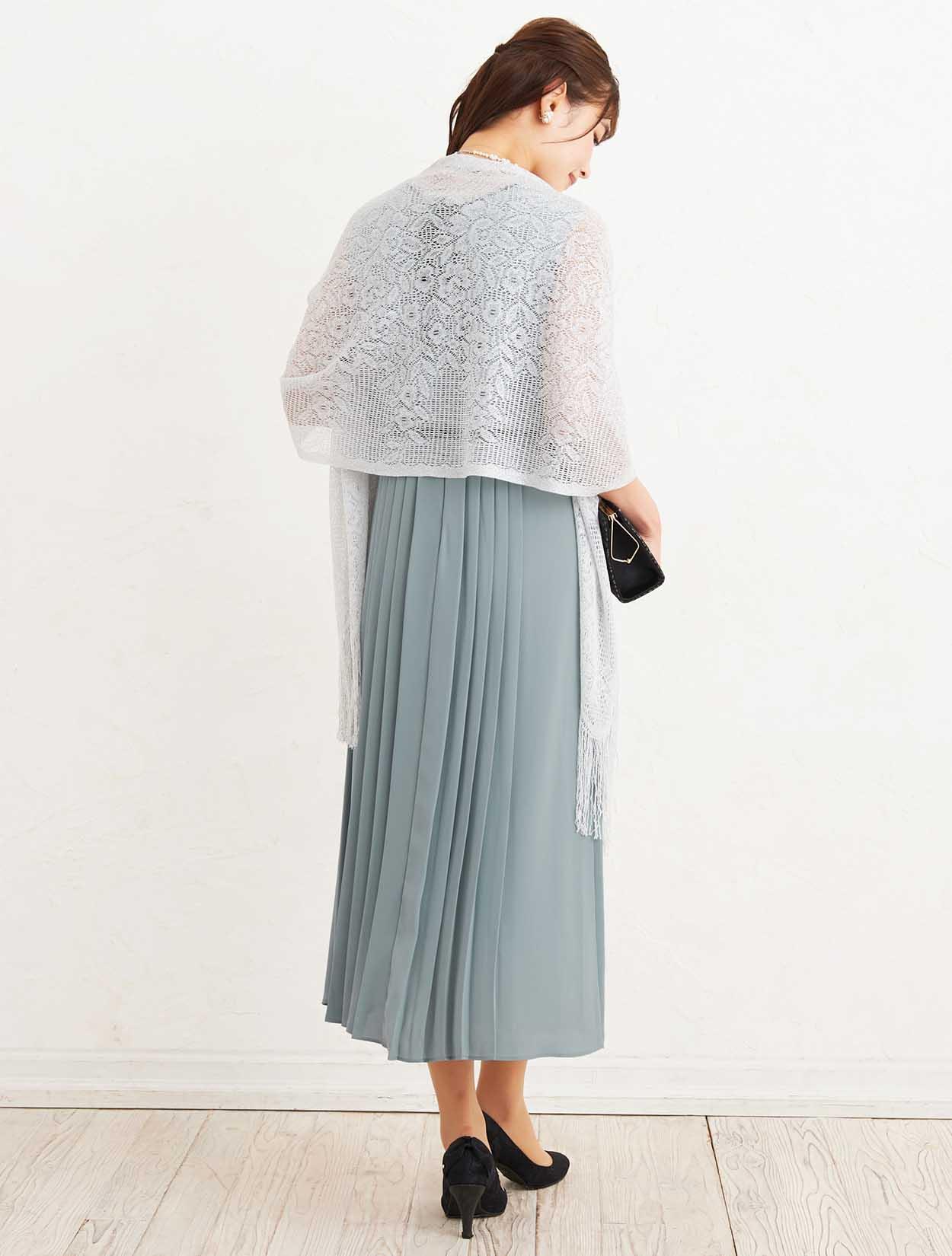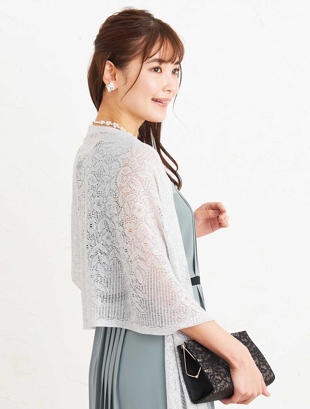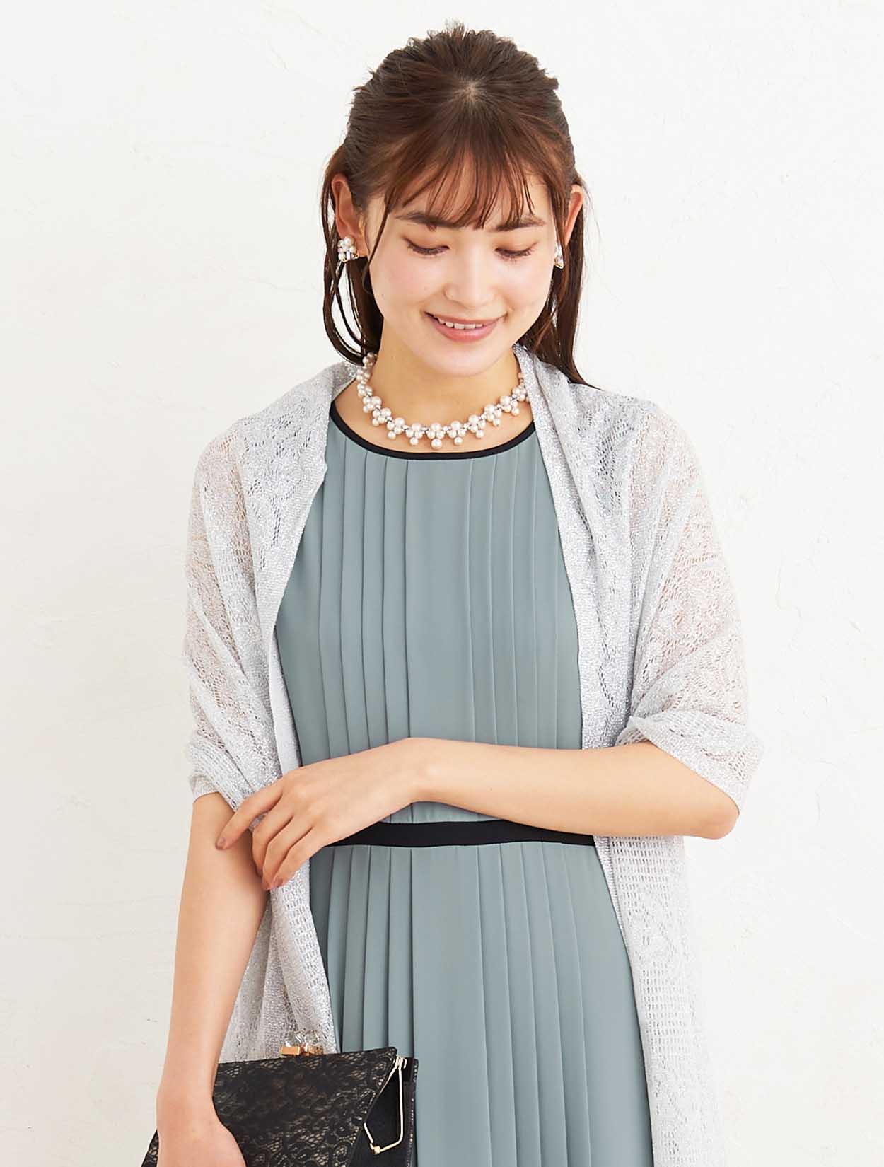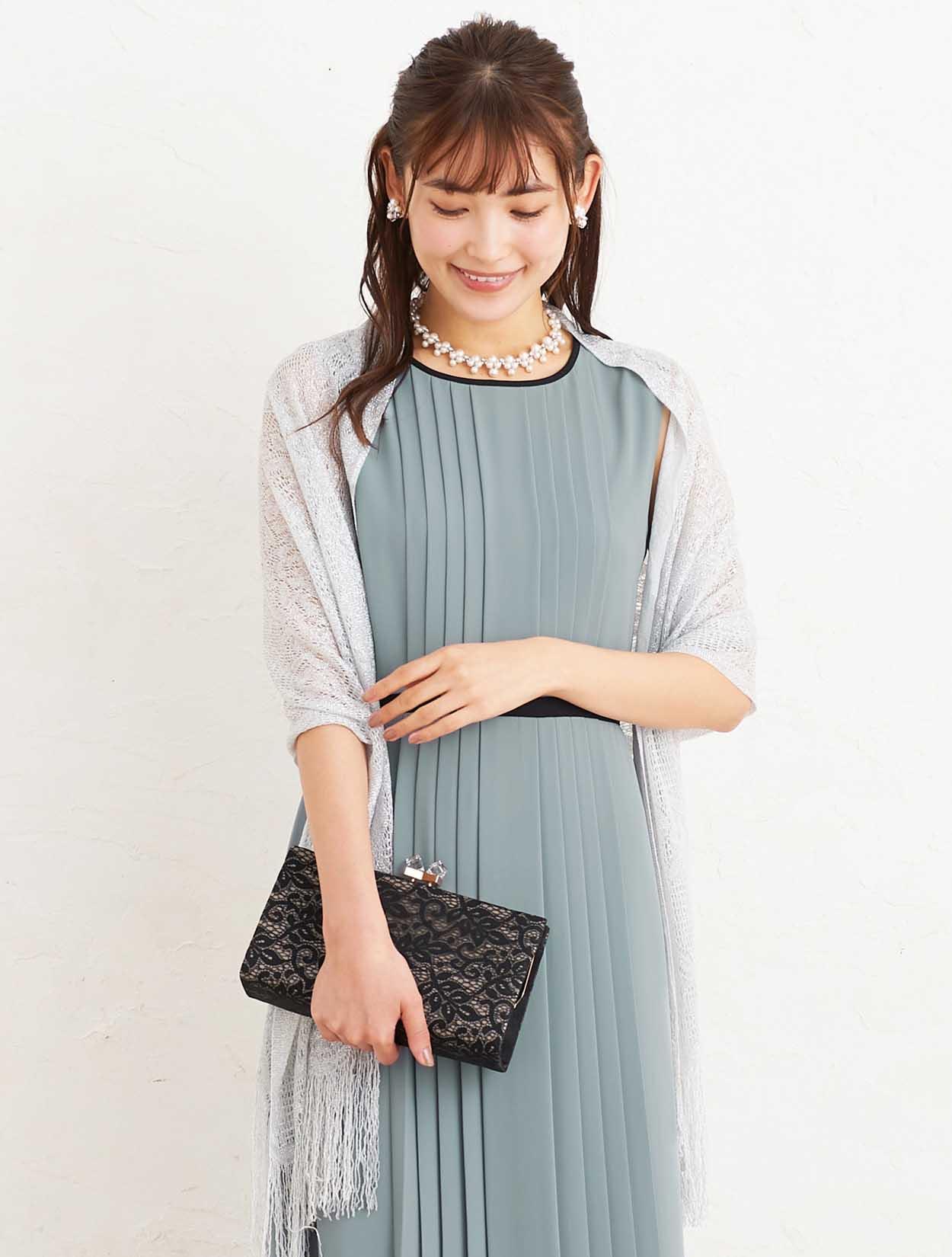 ■上品なサックスブルーのドレスにシルバーのラメストールが華やかに煌めき、大人の女性らしさを演出するコーディネートです。