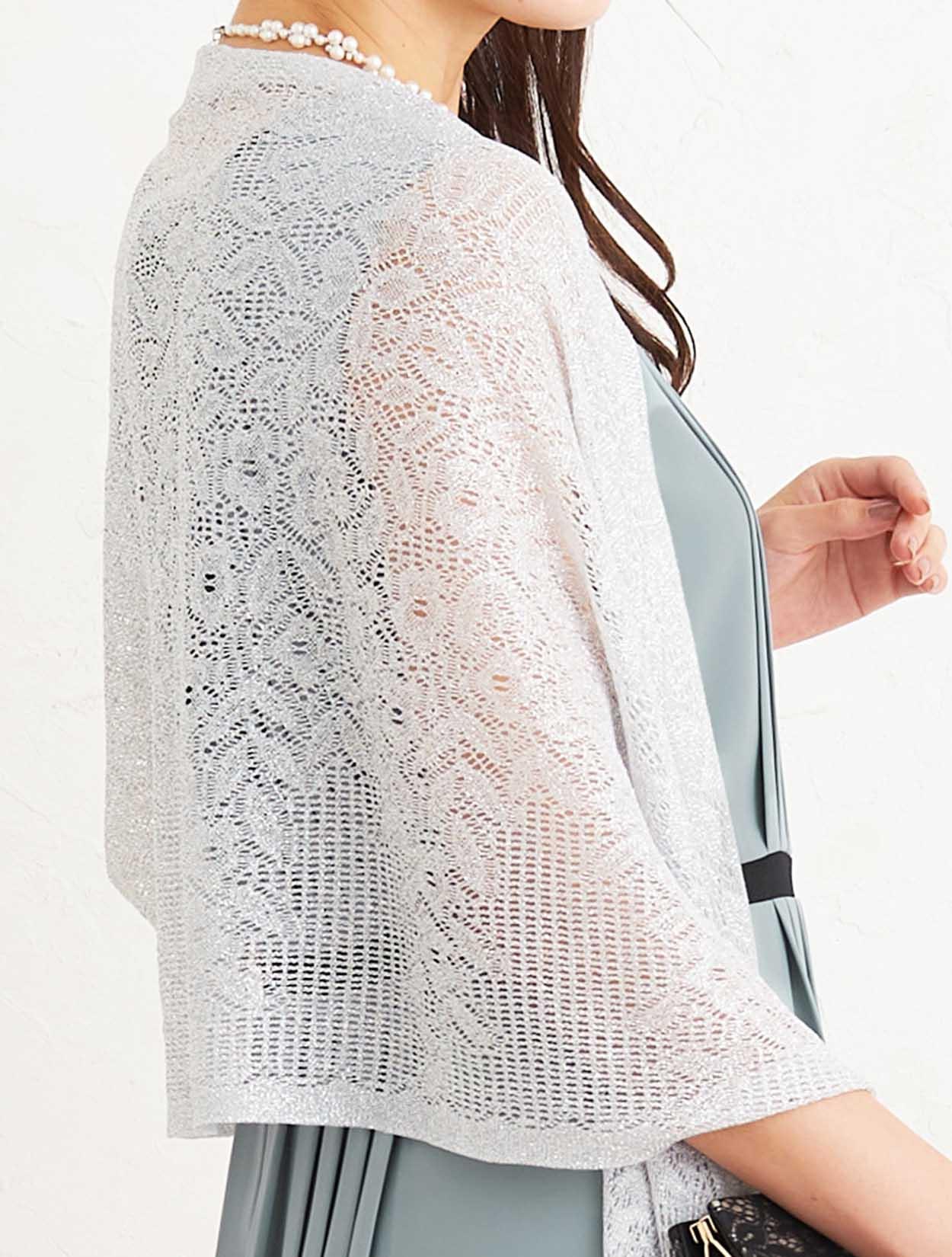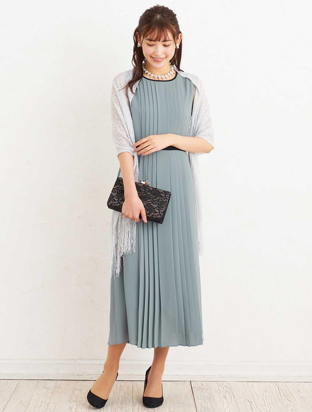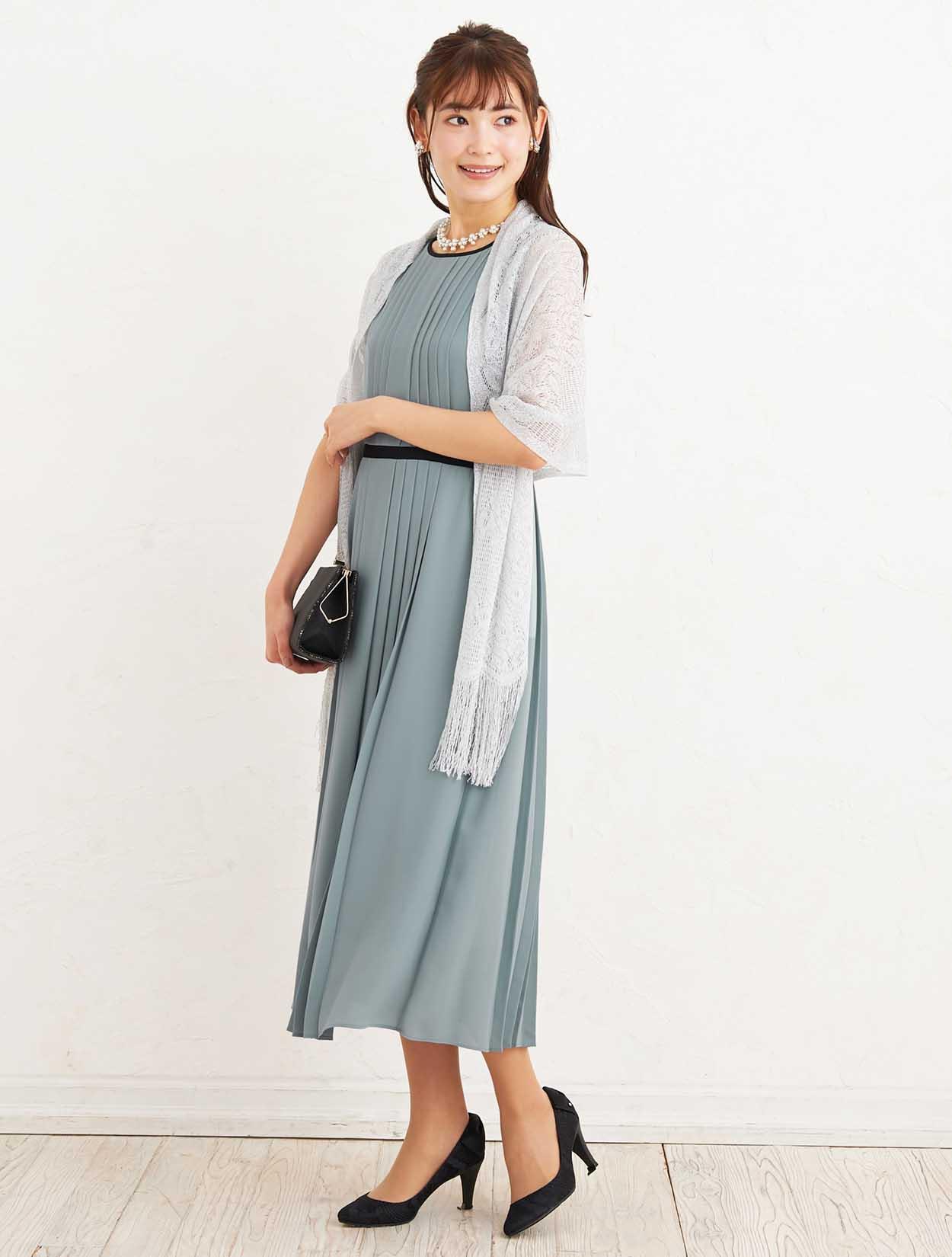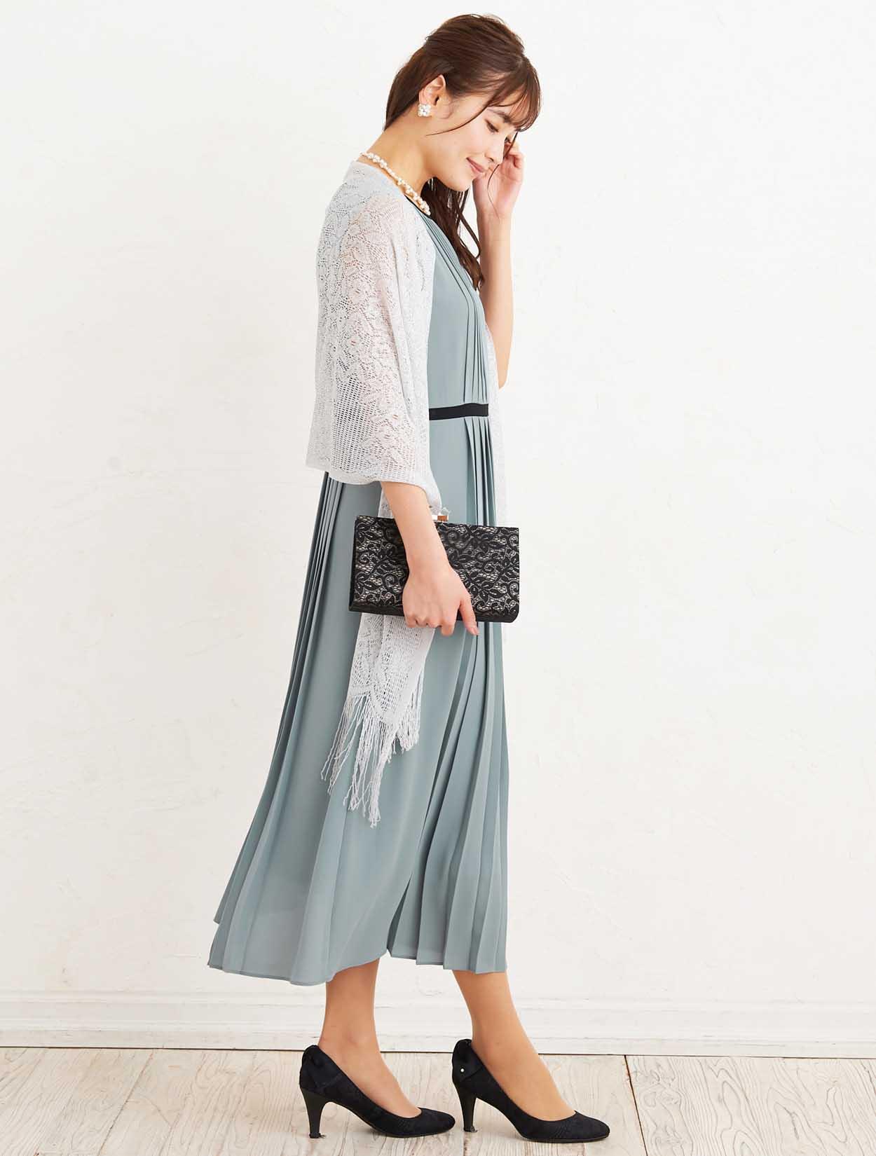 ■上品なサックスブルーのドレスにシルバーのラメストールが華やかに煌めき、大人の女性らしさを演出するコーディネートです。