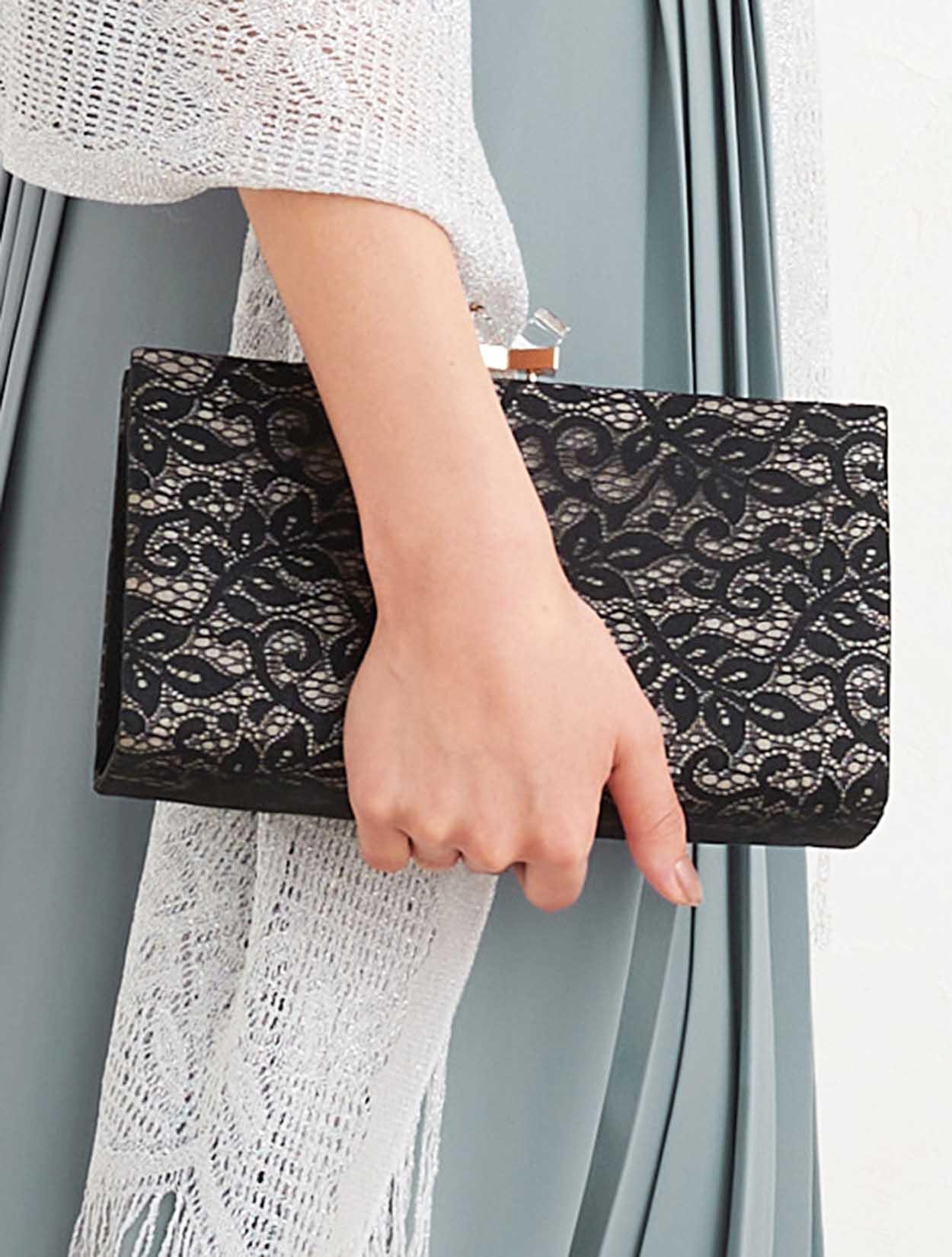 ■コーディネートをグッと引き締めてくれるブラックのオーガンジーレースのバッグはパーティーシーンにもぴったりです。
