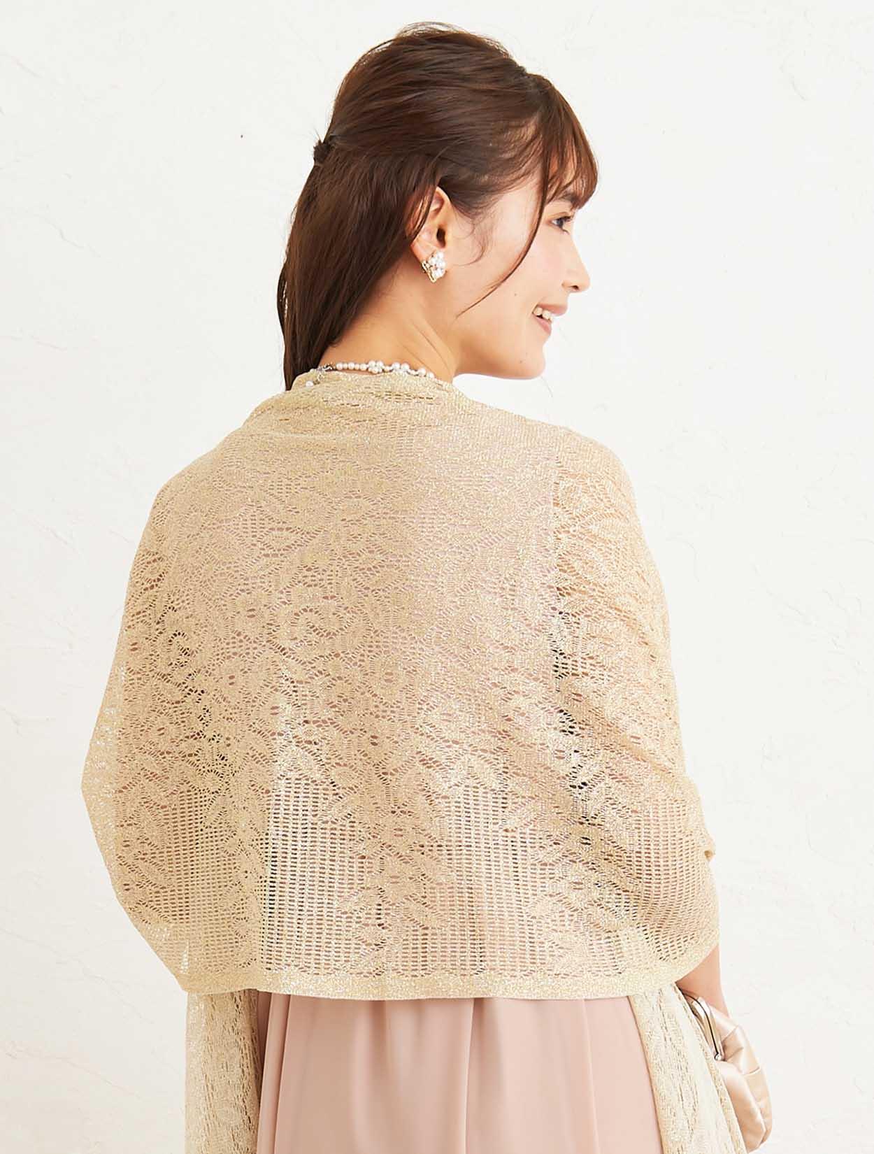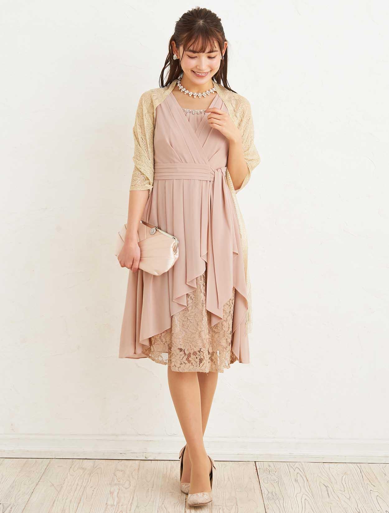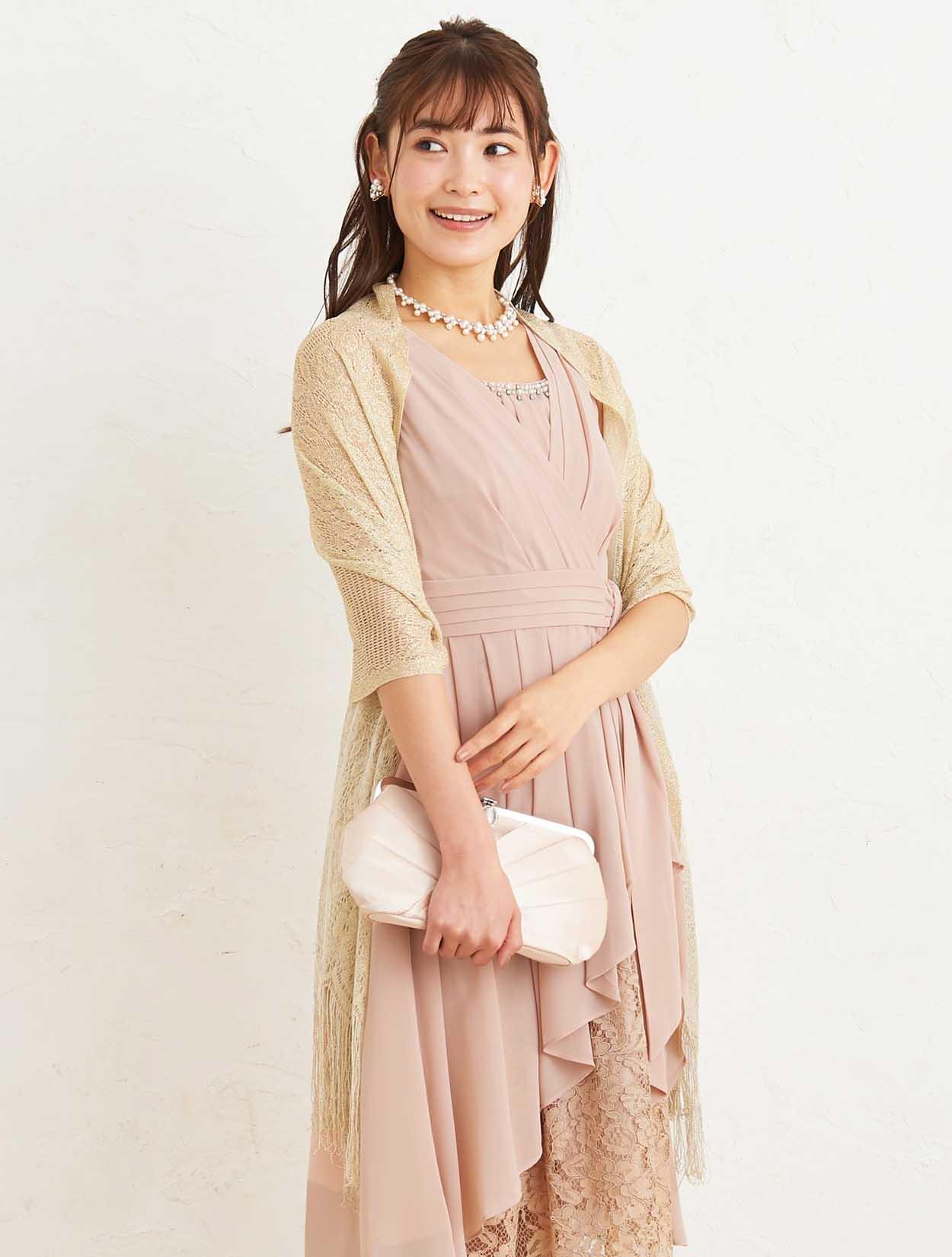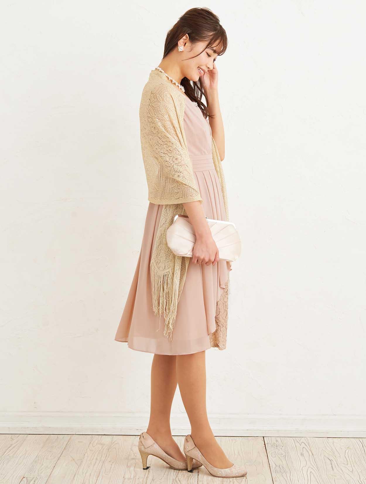 ■優しいピンクのマタニティドレスに、華やかなゴールドのラメストールを合わせたコーディネートです。