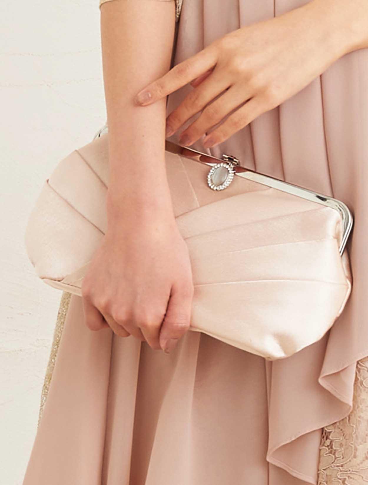■上品なベージュのサテンバッグとスカラップ調に編み込んだネックレスが優し気な印象を与えます。