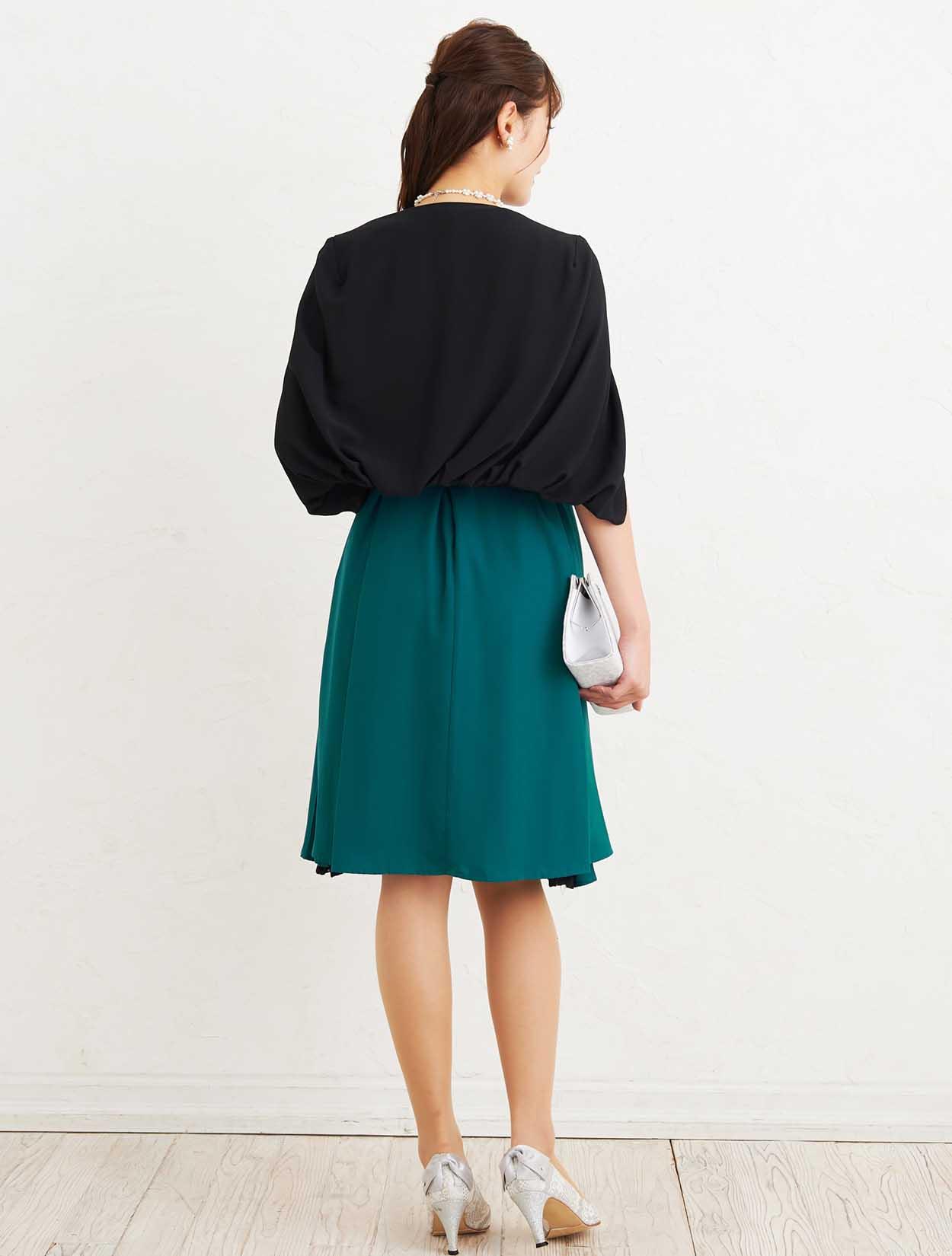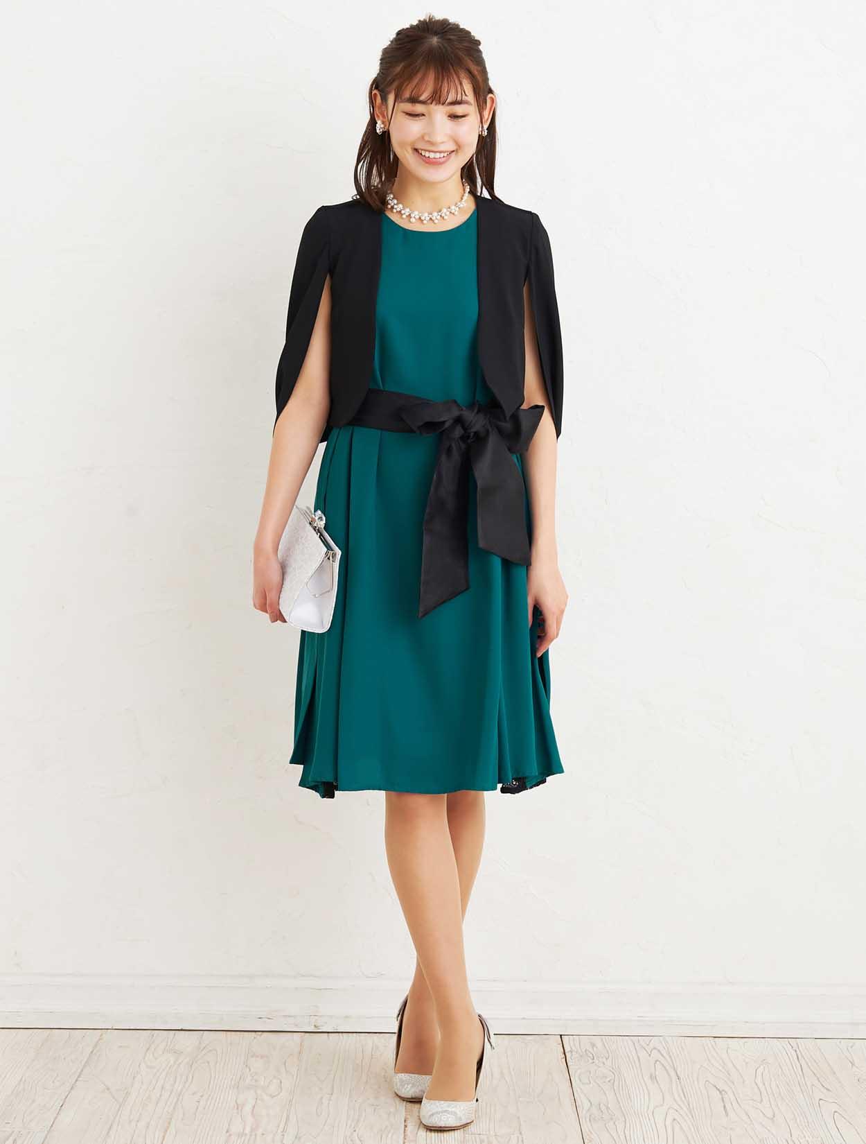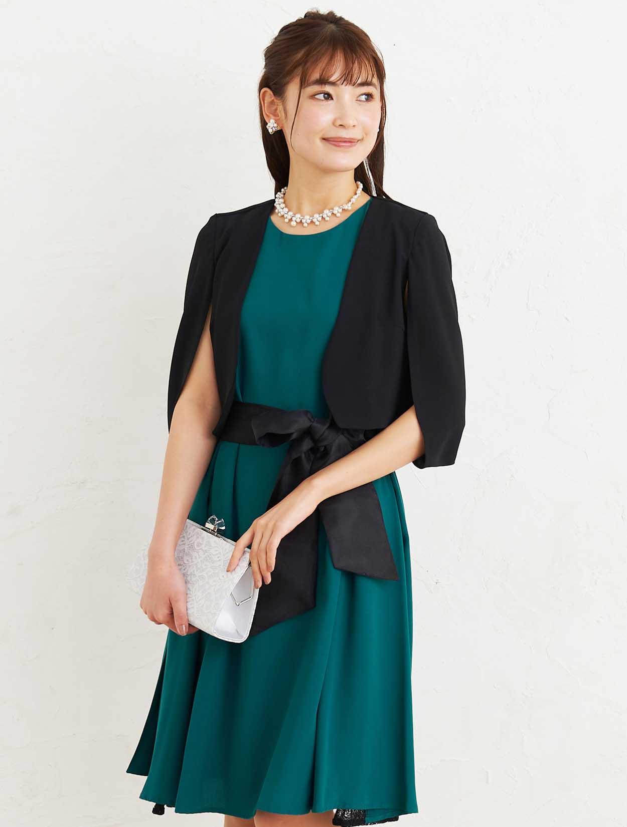 ■深いグリーンのマタニティドレスにブラックのジャケットボレロでアクセントを付けた大人なコーディネートです。