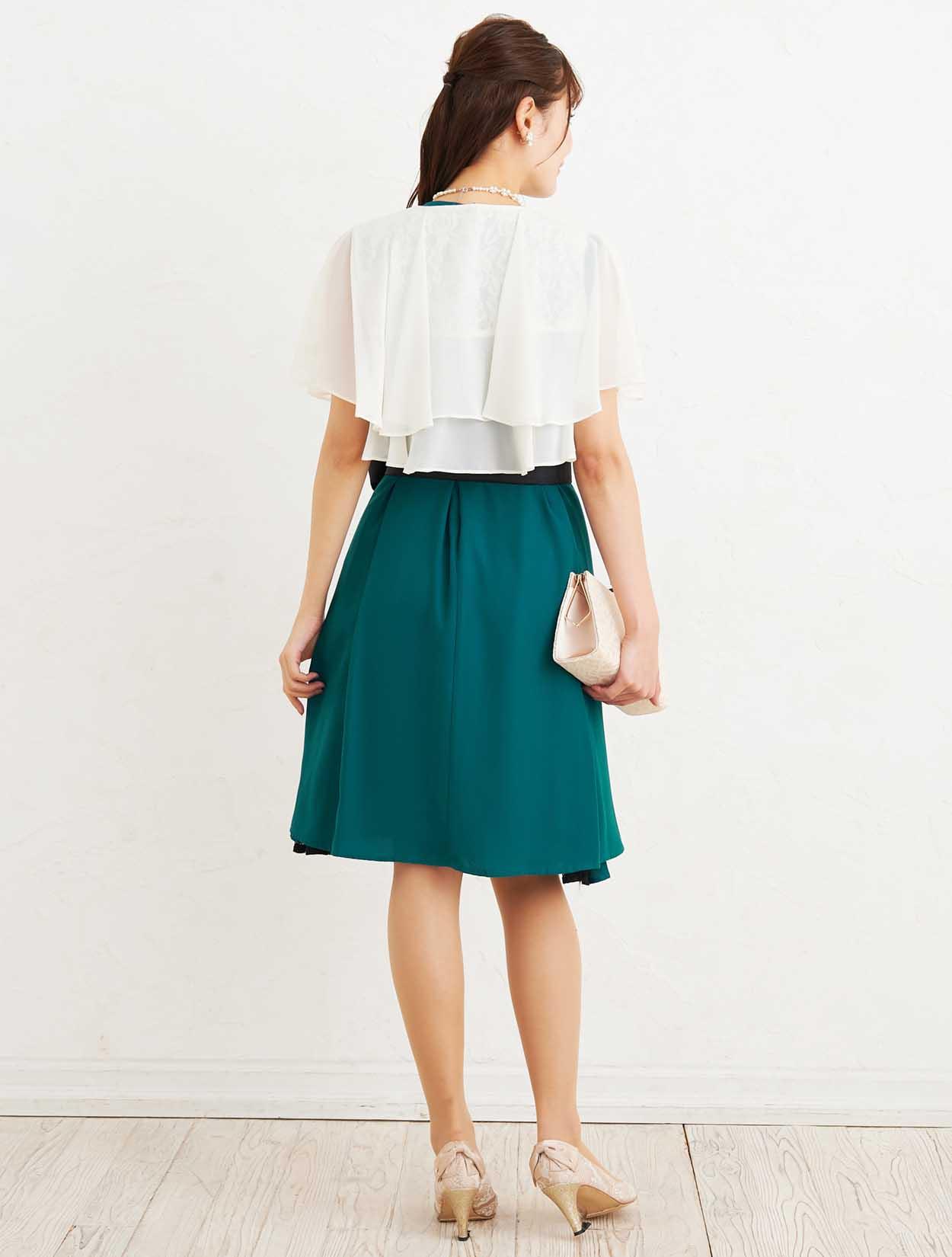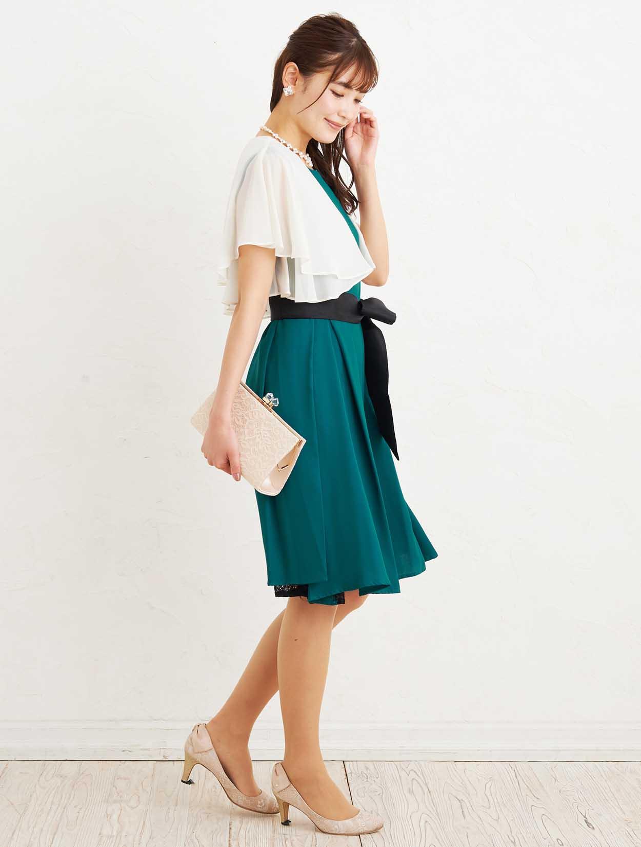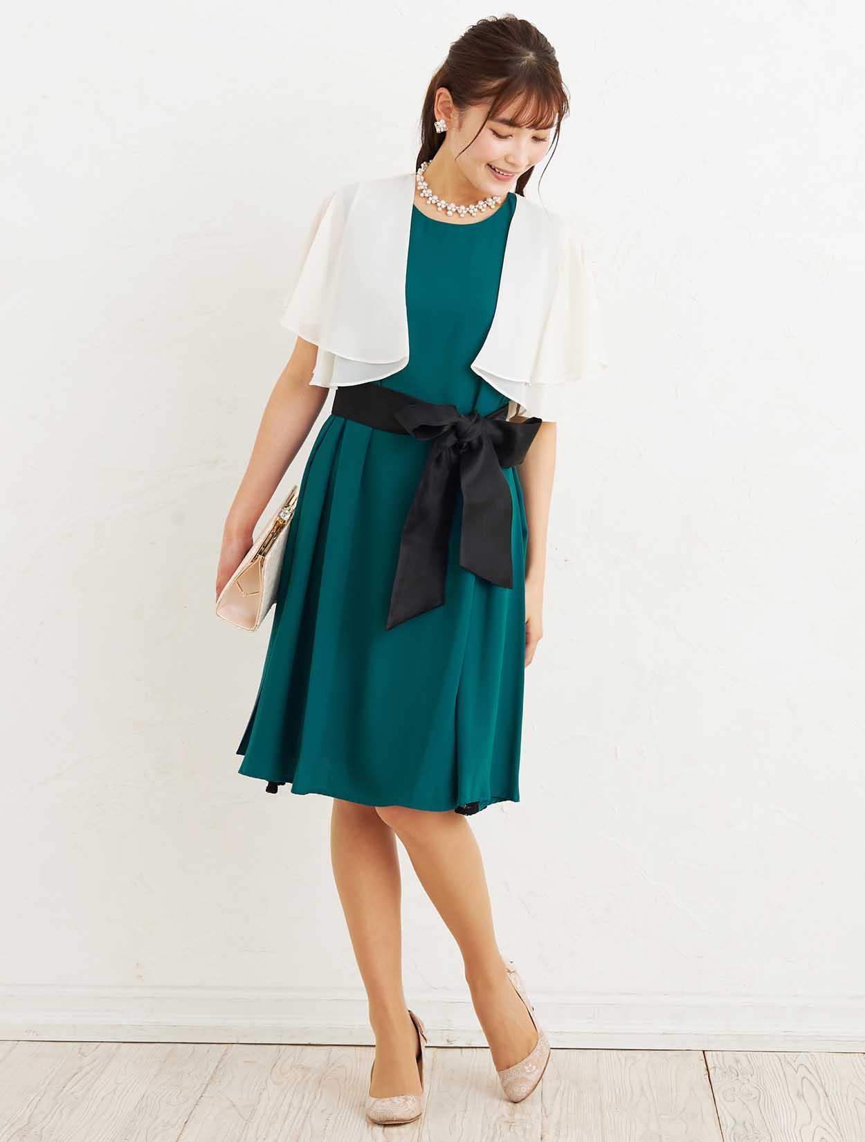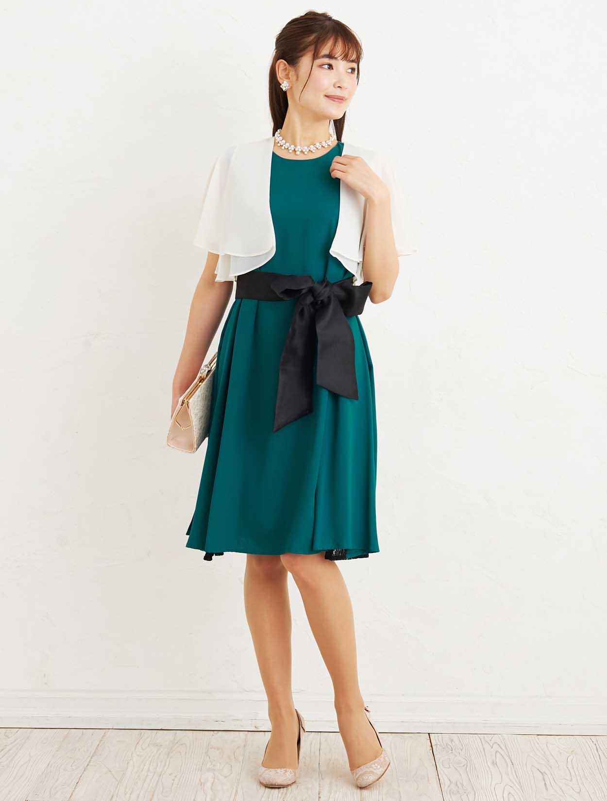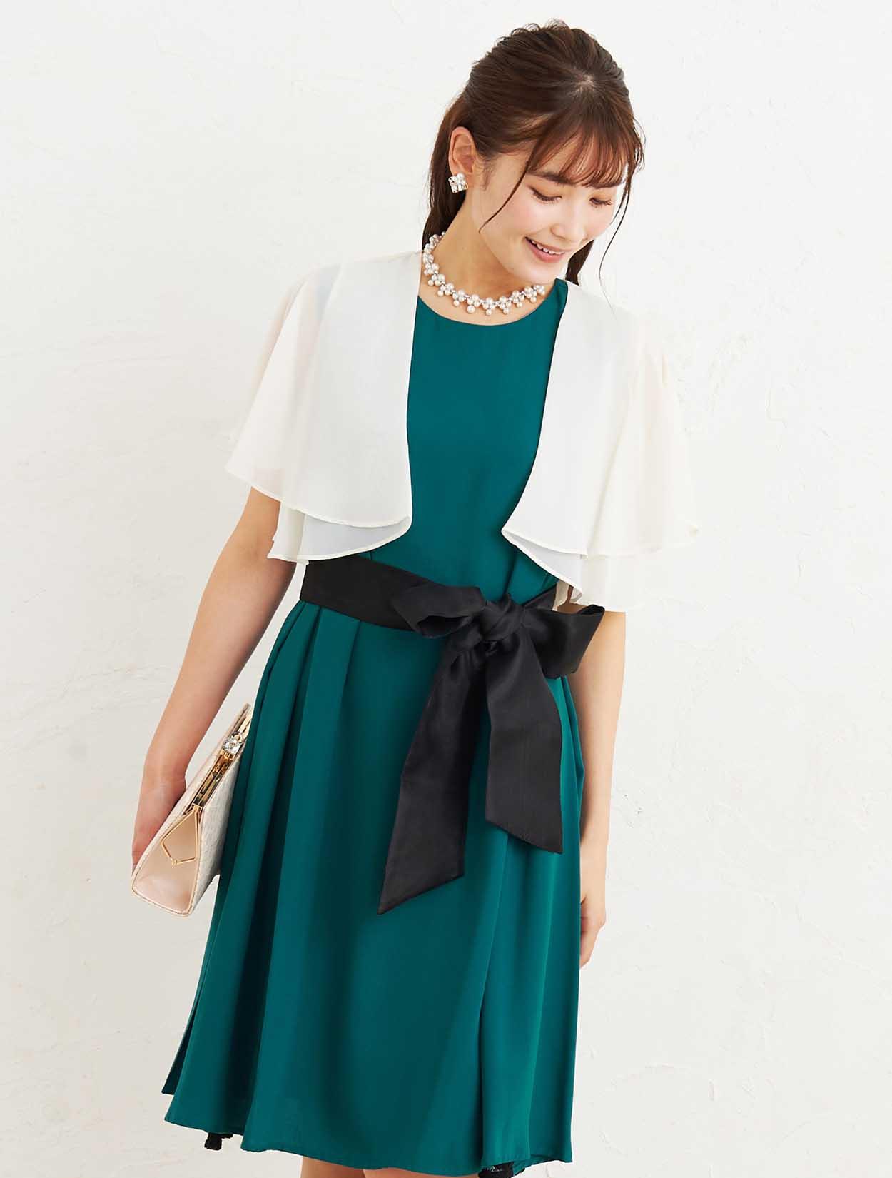 ■深いグリーンのマタニティドレスに爽やかなベージュのボレロを合わせた、大人フェミニンなコーディネートです。