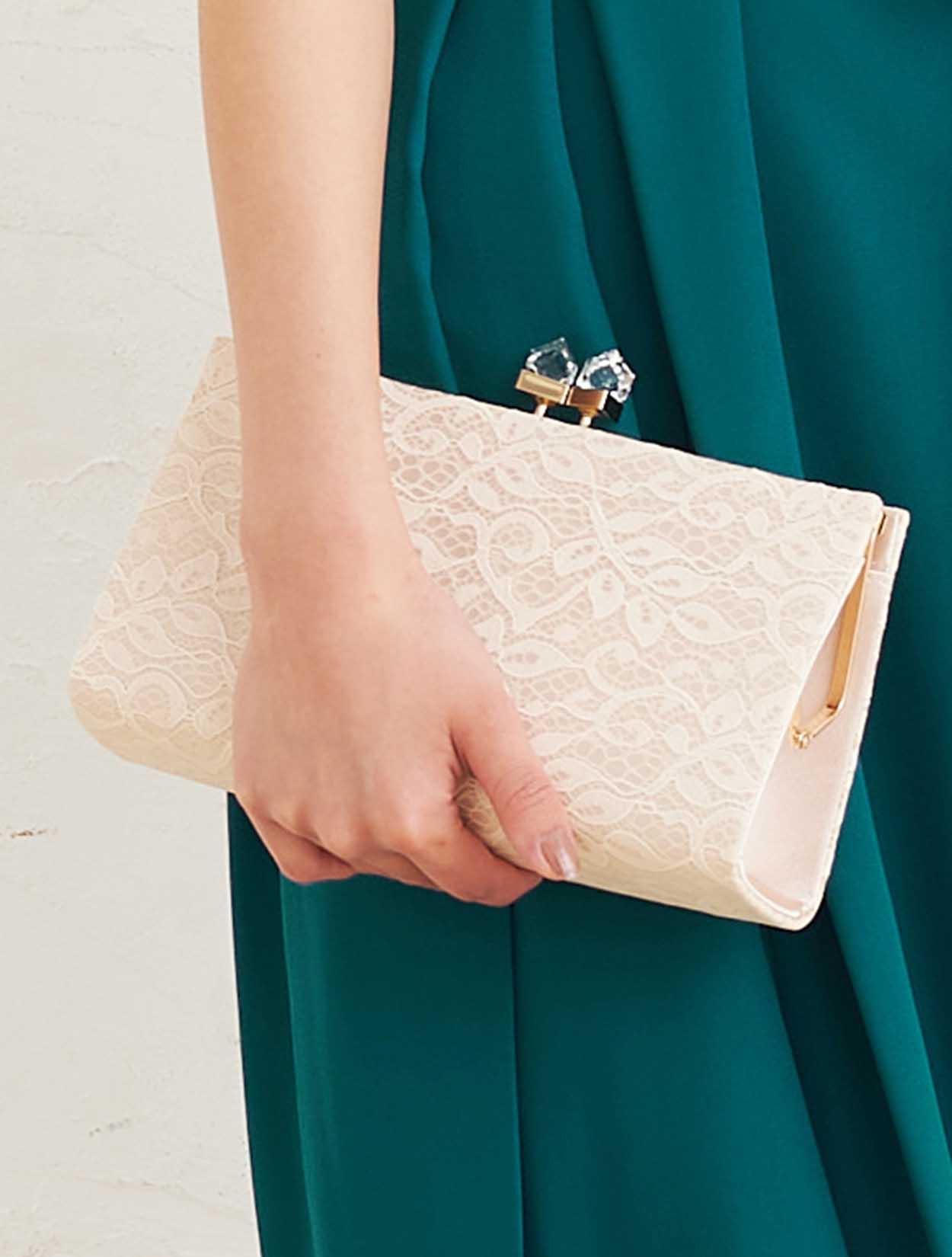 ■ベージュの小物で統一する事で、優し気な印象に。首元を華やかに演出する、スカラップ調のネックレスも印象的です。