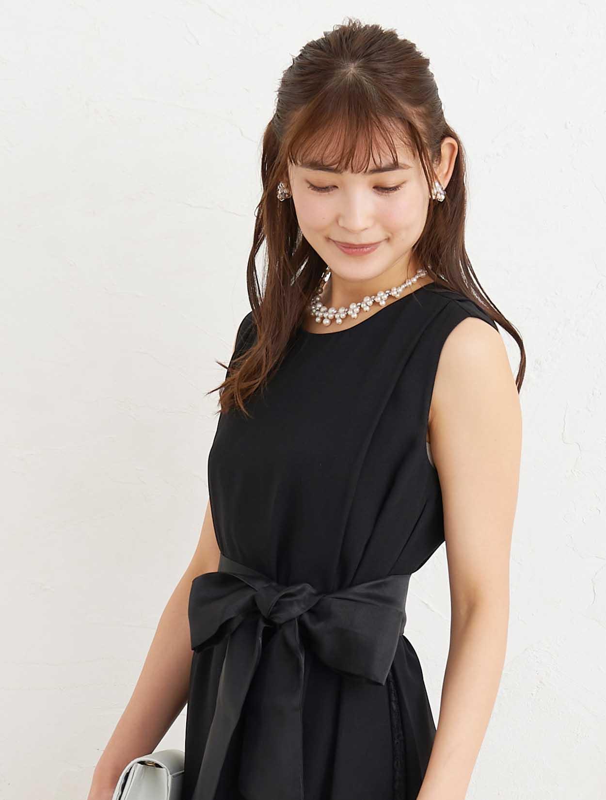 ■小物はベージュで合わせると、ブラックのドレスも優し気な印象で着て頂けます。首元はスカラップ調に編み込んたパールのネックレスで華やかに。