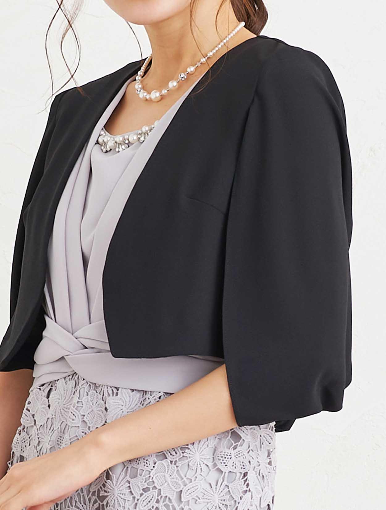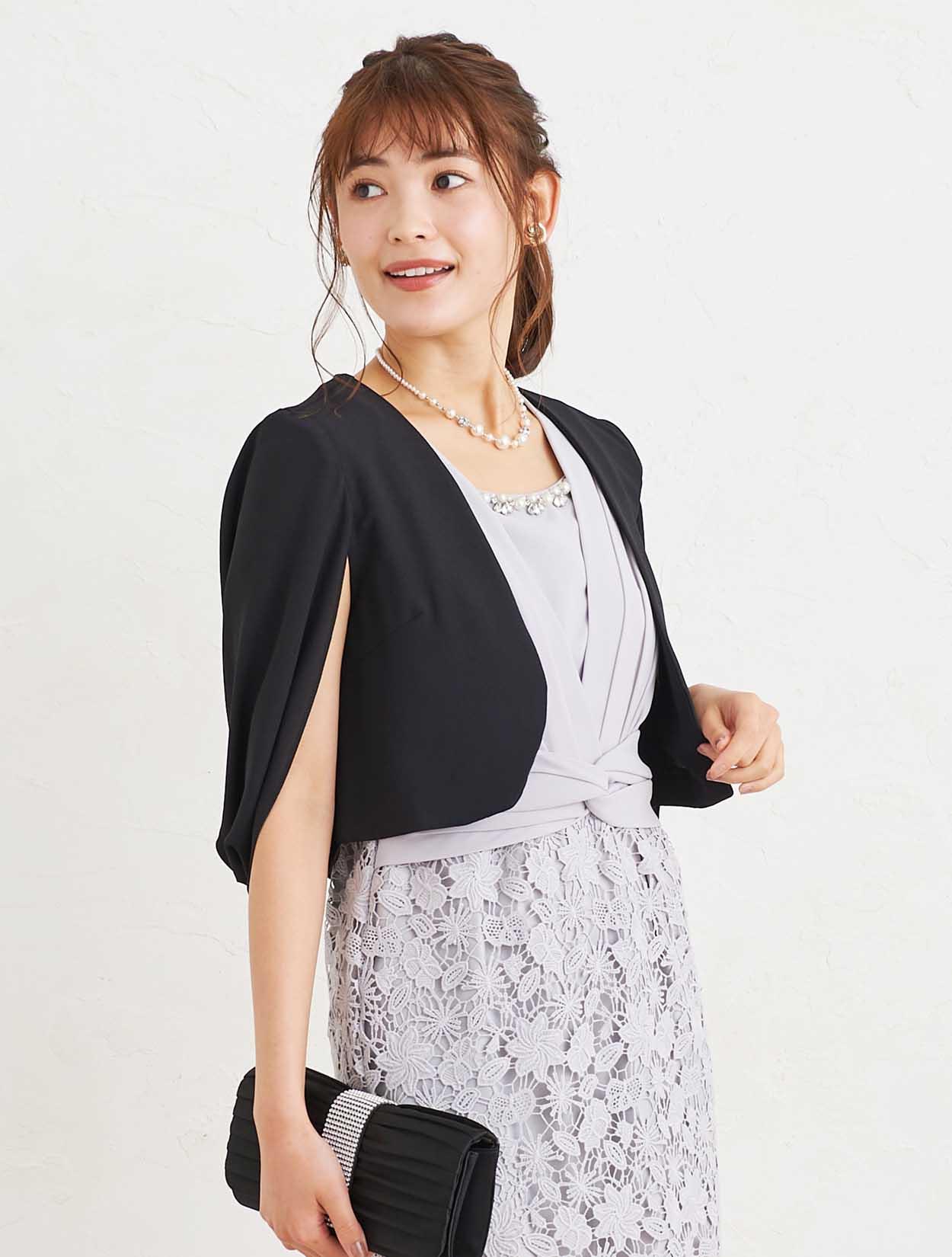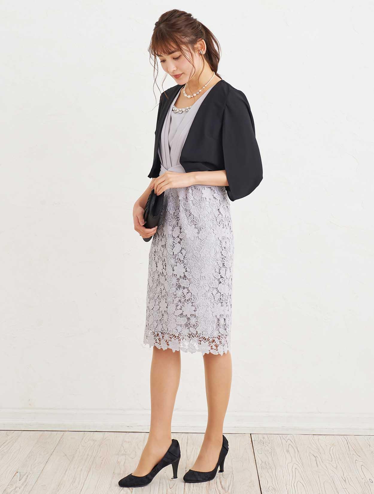 ■グレーのタイトドレスにブラックのジャケットボレロを合わせた、フォーマル感漂うコーディネートです。