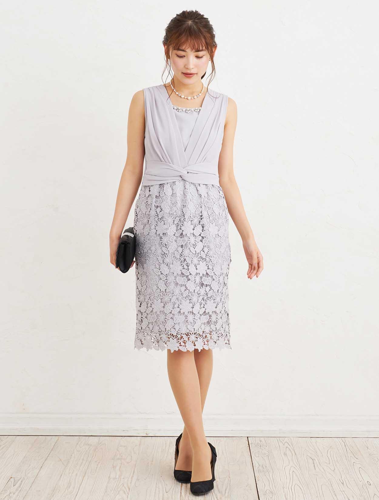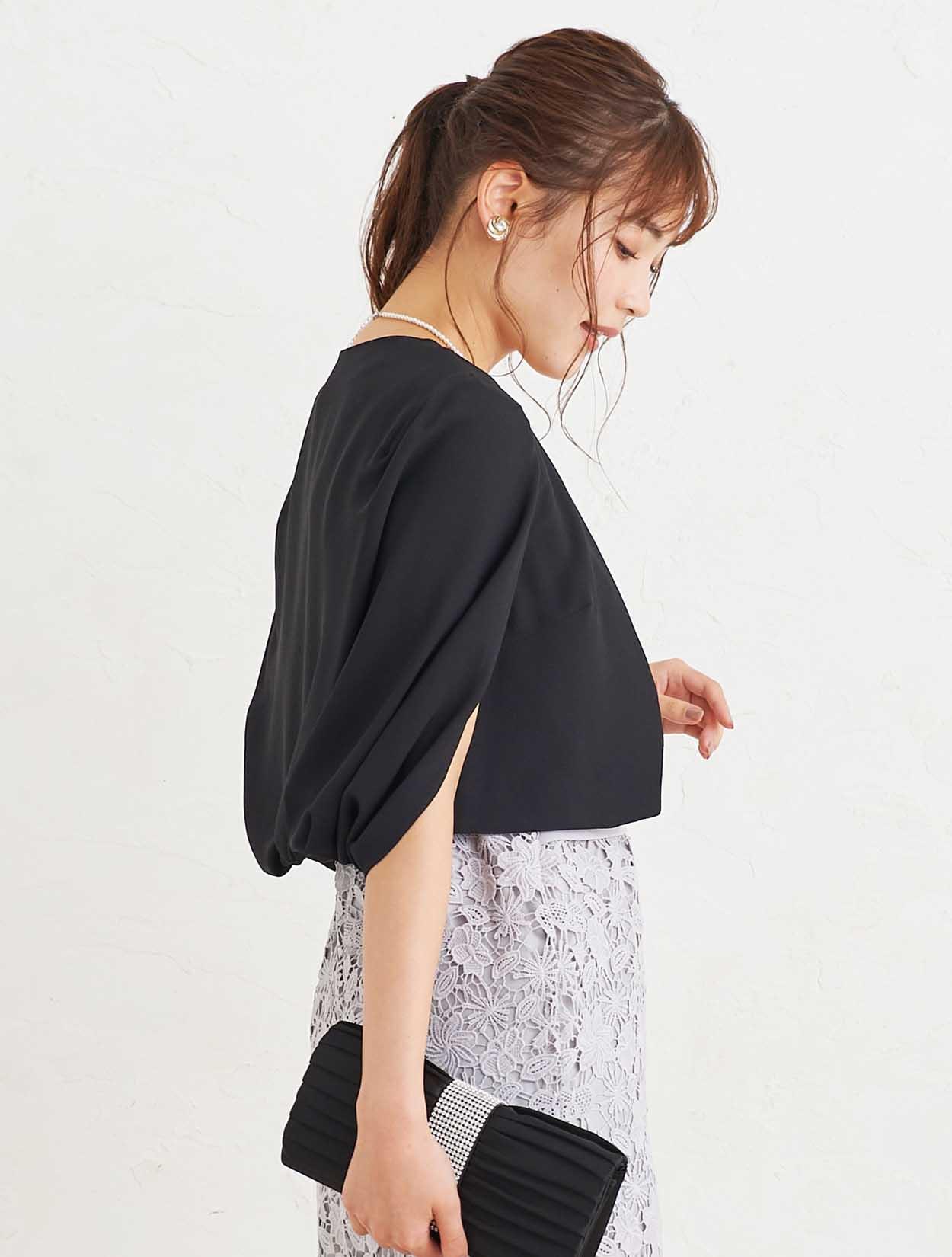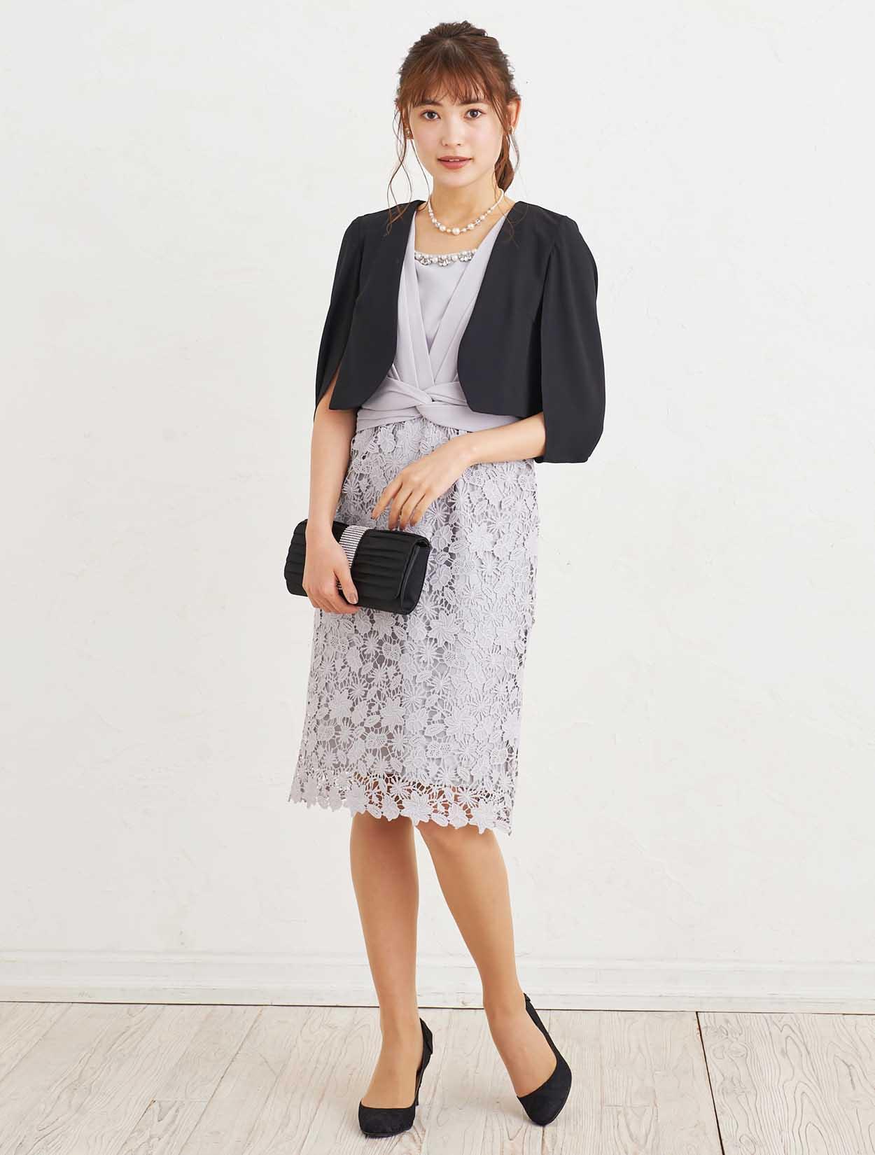 ■グレーのタイトドレスにブラックのジャケットボレロを合わせた、フォーマル感漂うコーディネートです。
