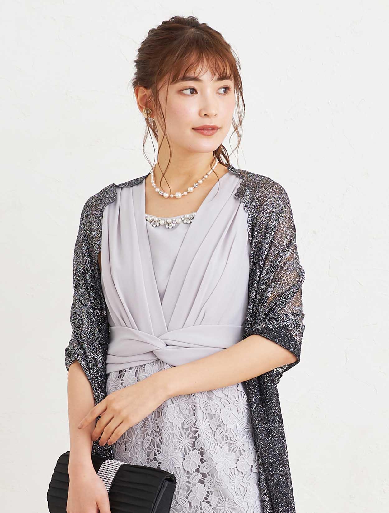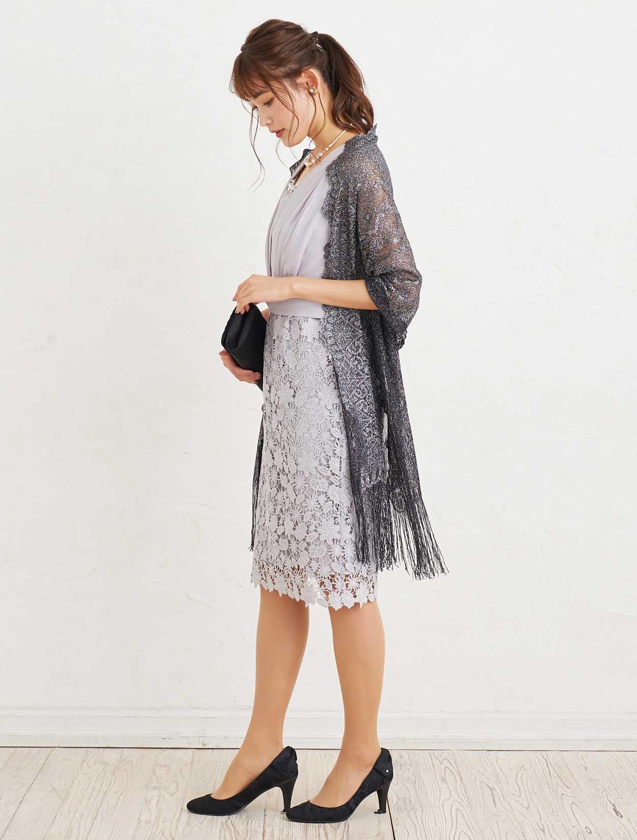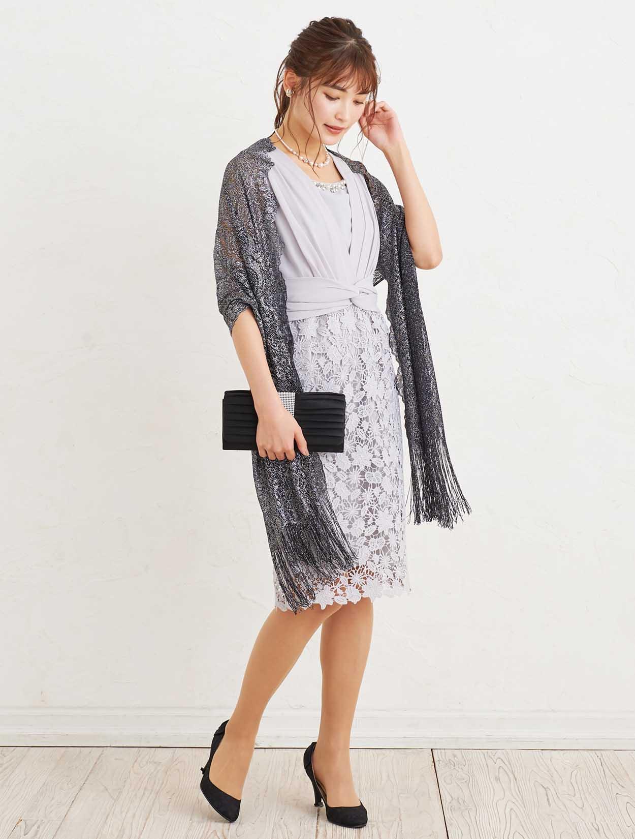■グレーのタイトドレスとブラックのラメストールを合わせた華やかな大人コーディネート。