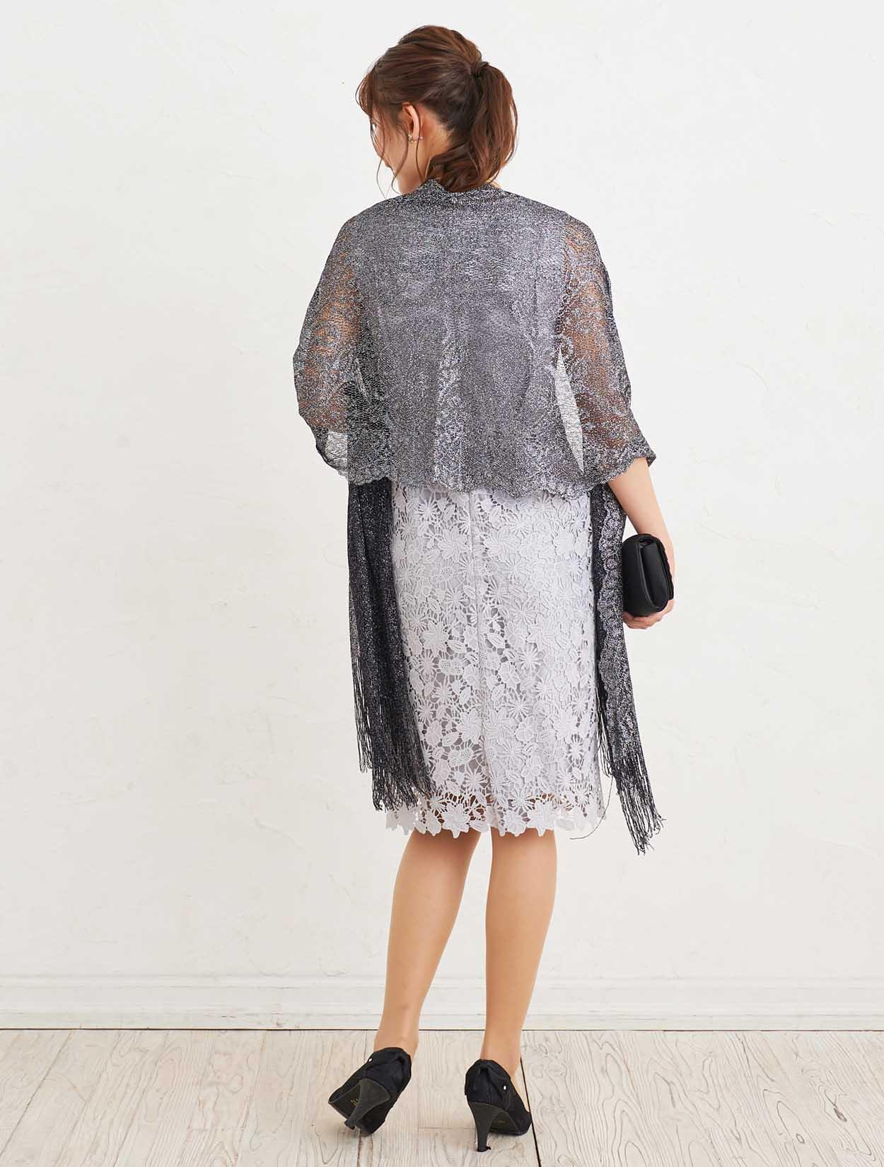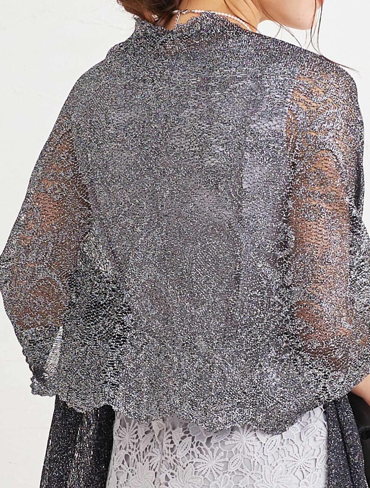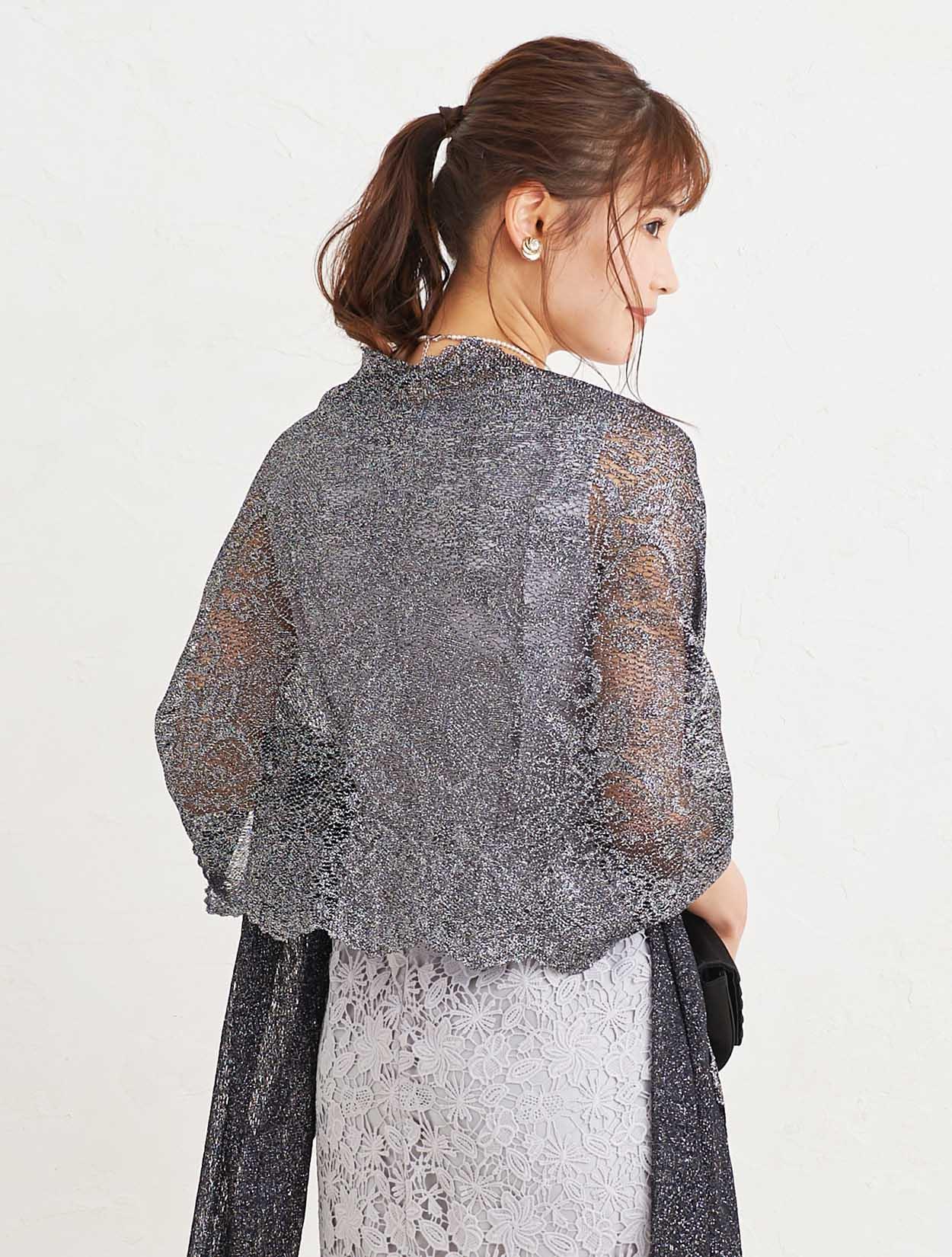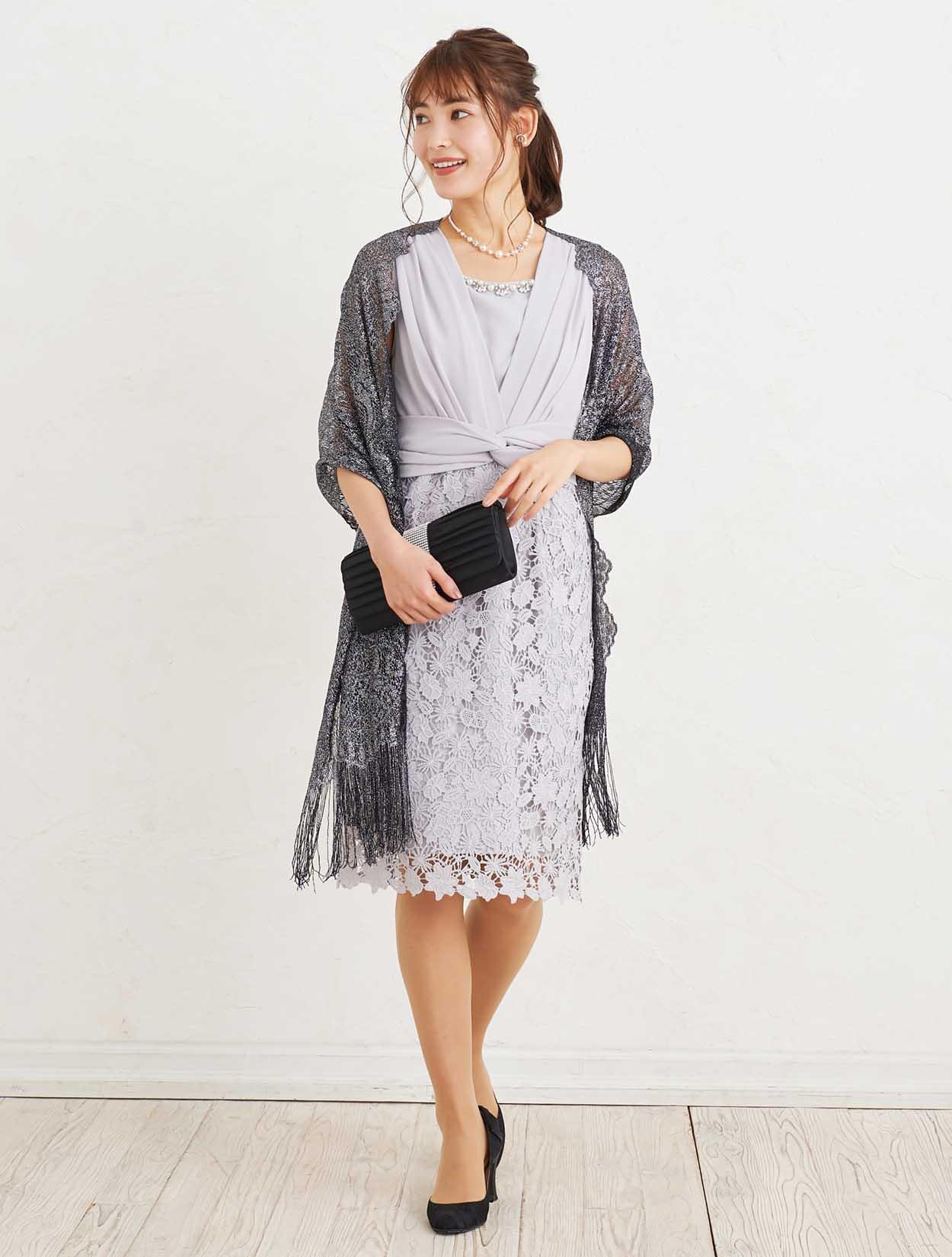 ■グレーのタイトドレスとブラックのラメストールを合わせた華やかな大人コーディネート。