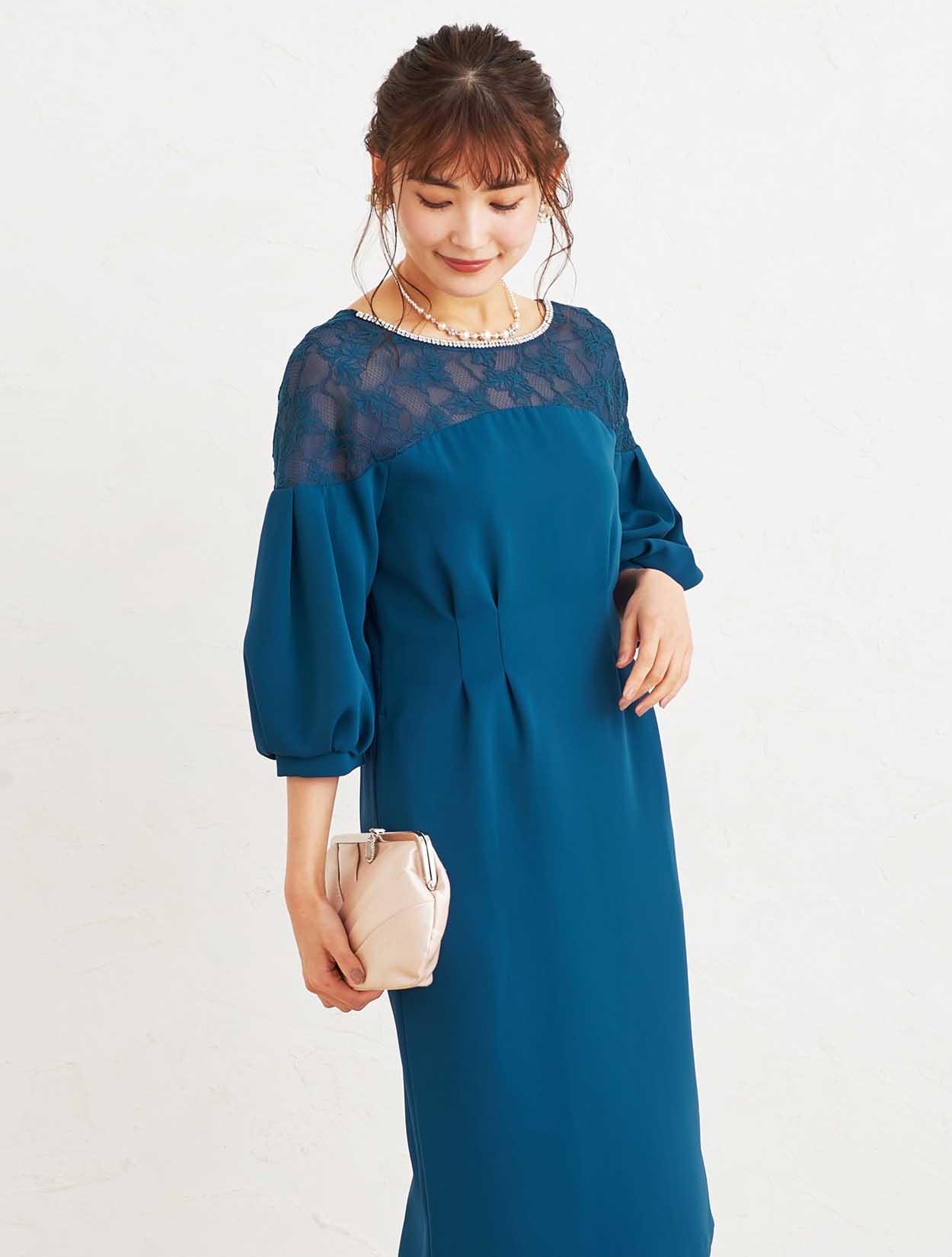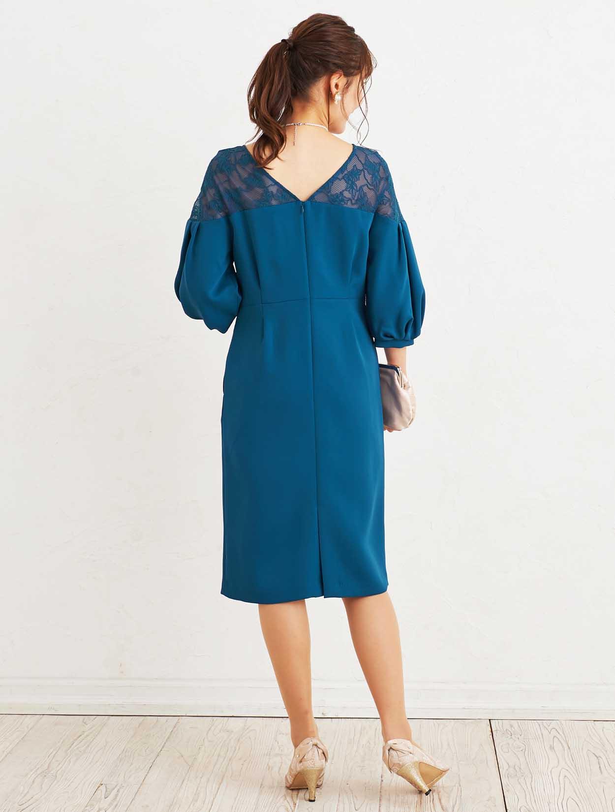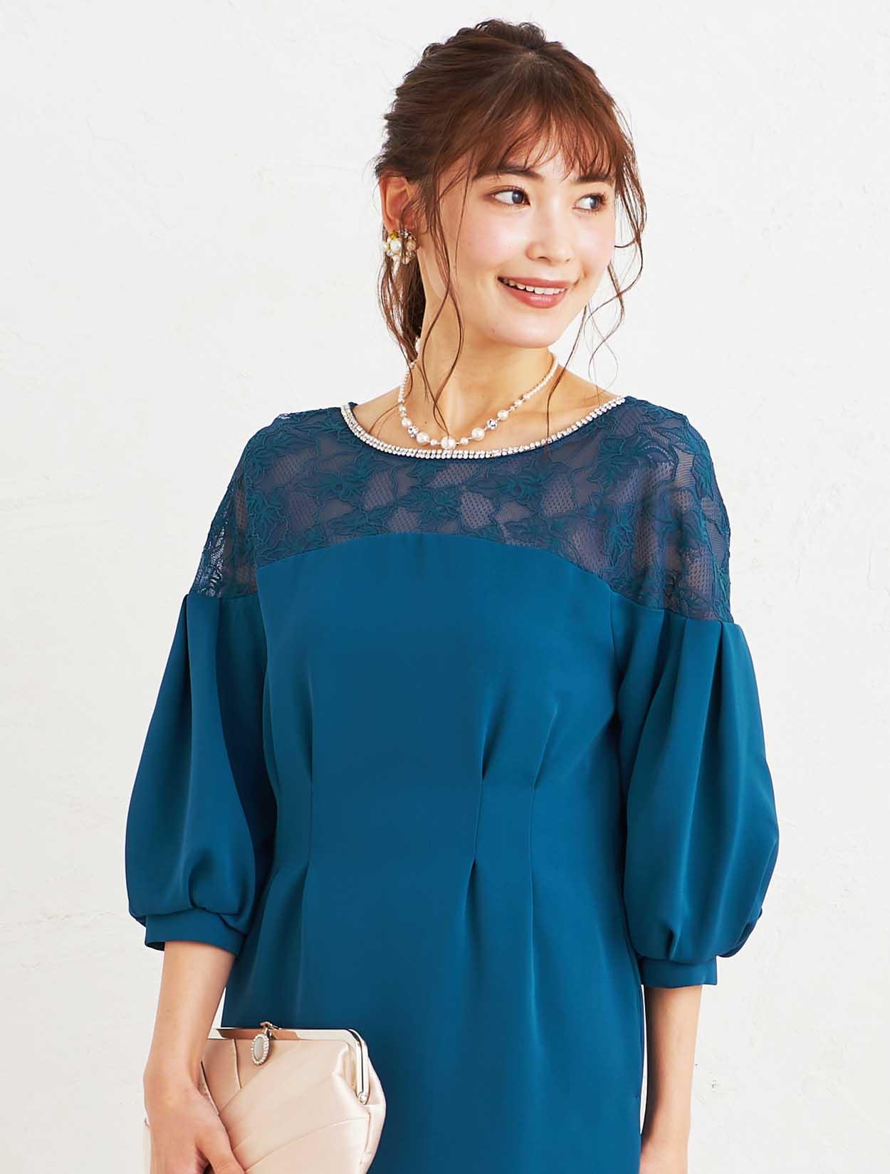 ■ウエストに施したタックが巧みなシルエットを演出しデコルテから袖上までのレースの透け感が女性らしい柔らかな印象のタイトドレス。
