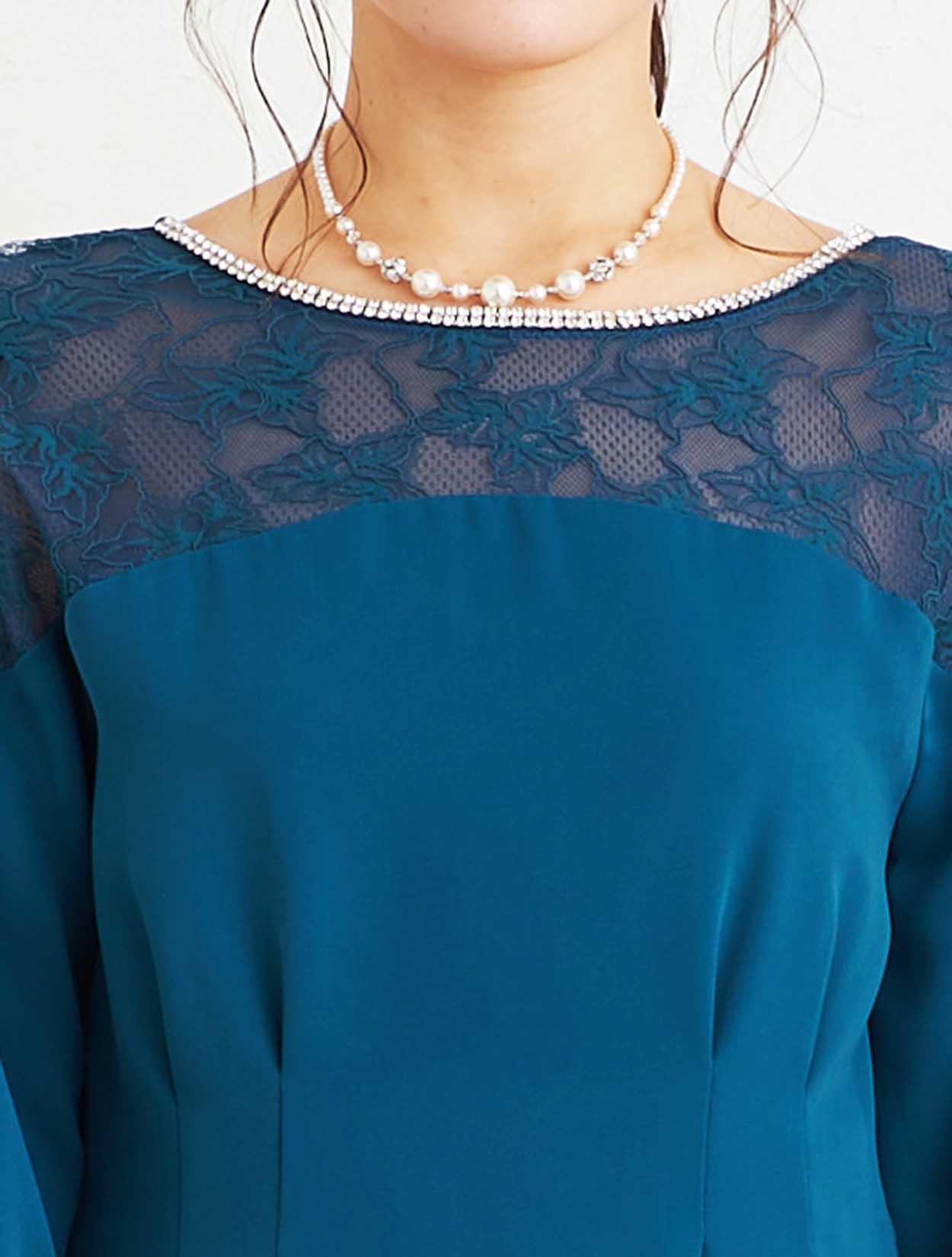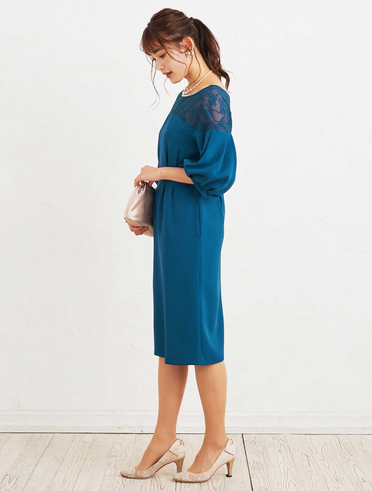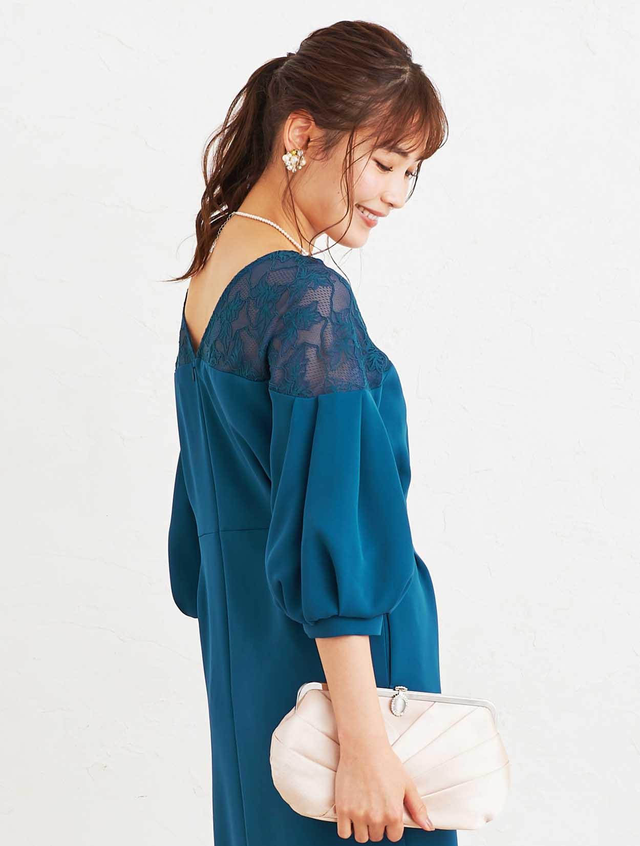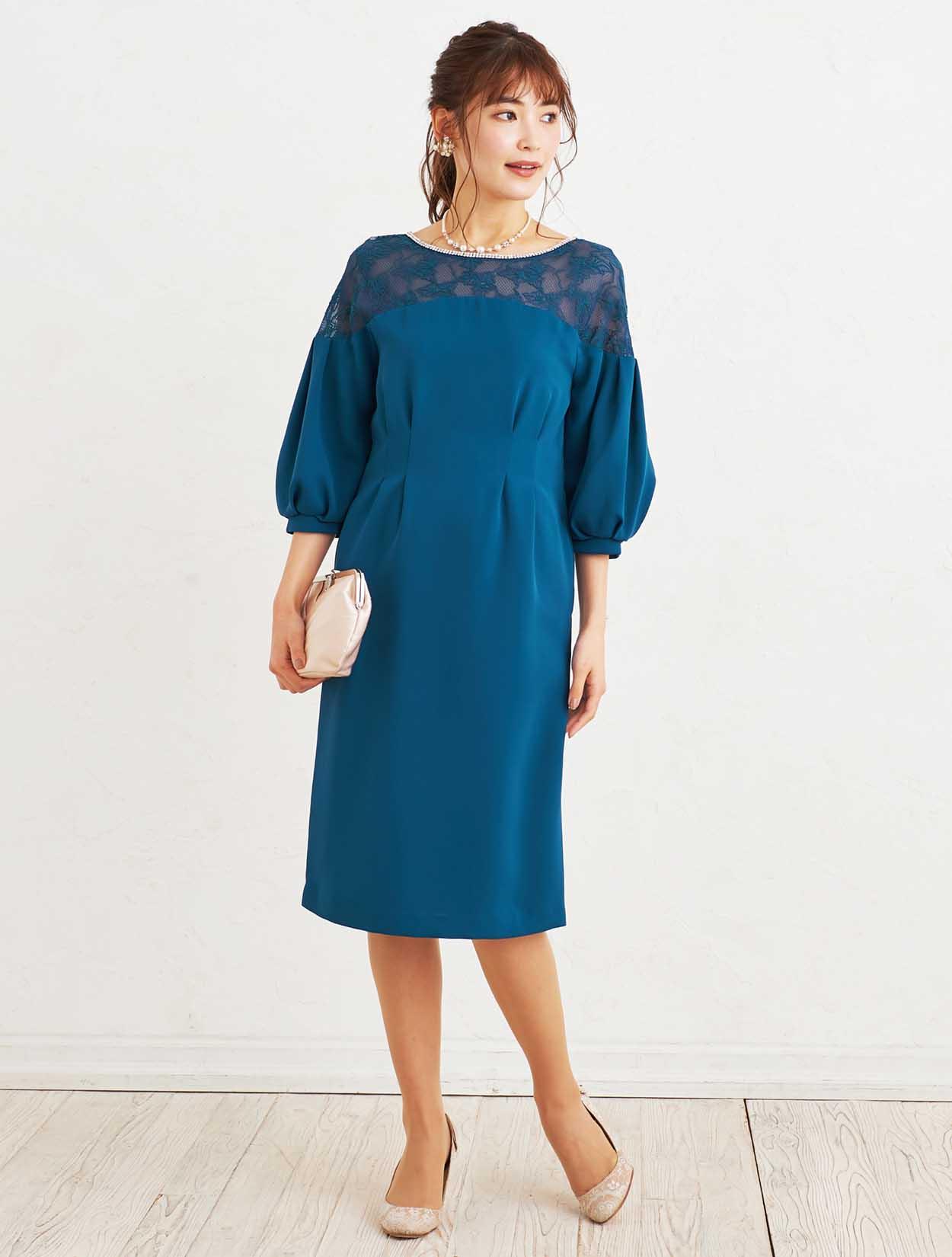■ウエストに施したタックが巧みなシルエットを演出しデコルテから袖上までのレースの透け感が女性らしい柔らかな印象のタイトドレス。