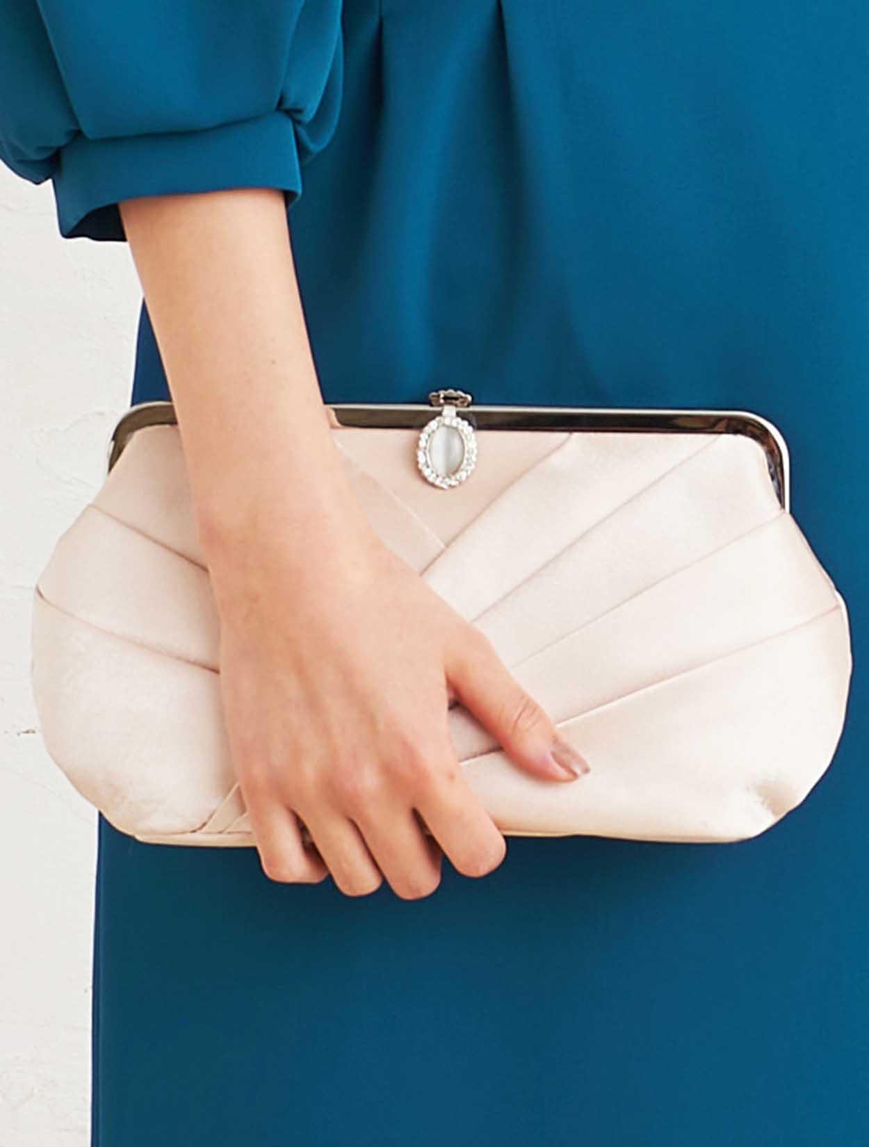■上品なブルーのドレスと丸みのあるベージュのバッグを合わせ、女性らしい印象を与えるコーディネートです。
