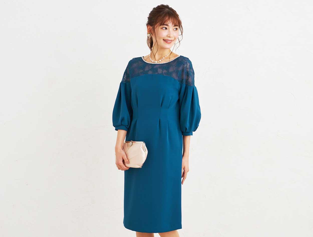 ■どんな場面にも馴染める落ち着いた大人の女性を感じさせるブルーのドレス。