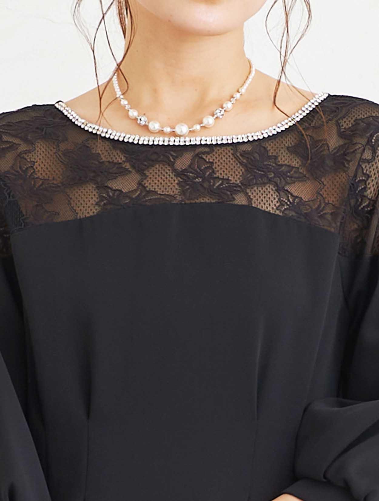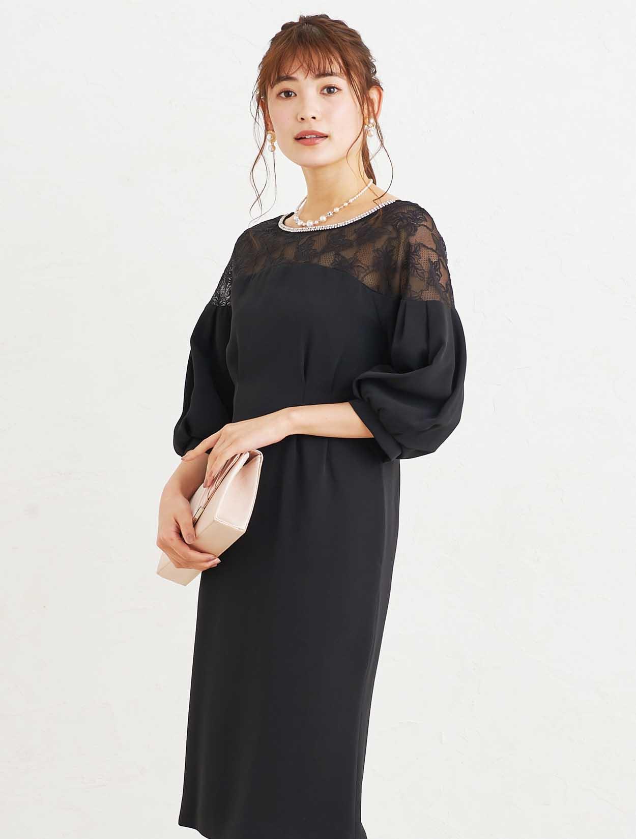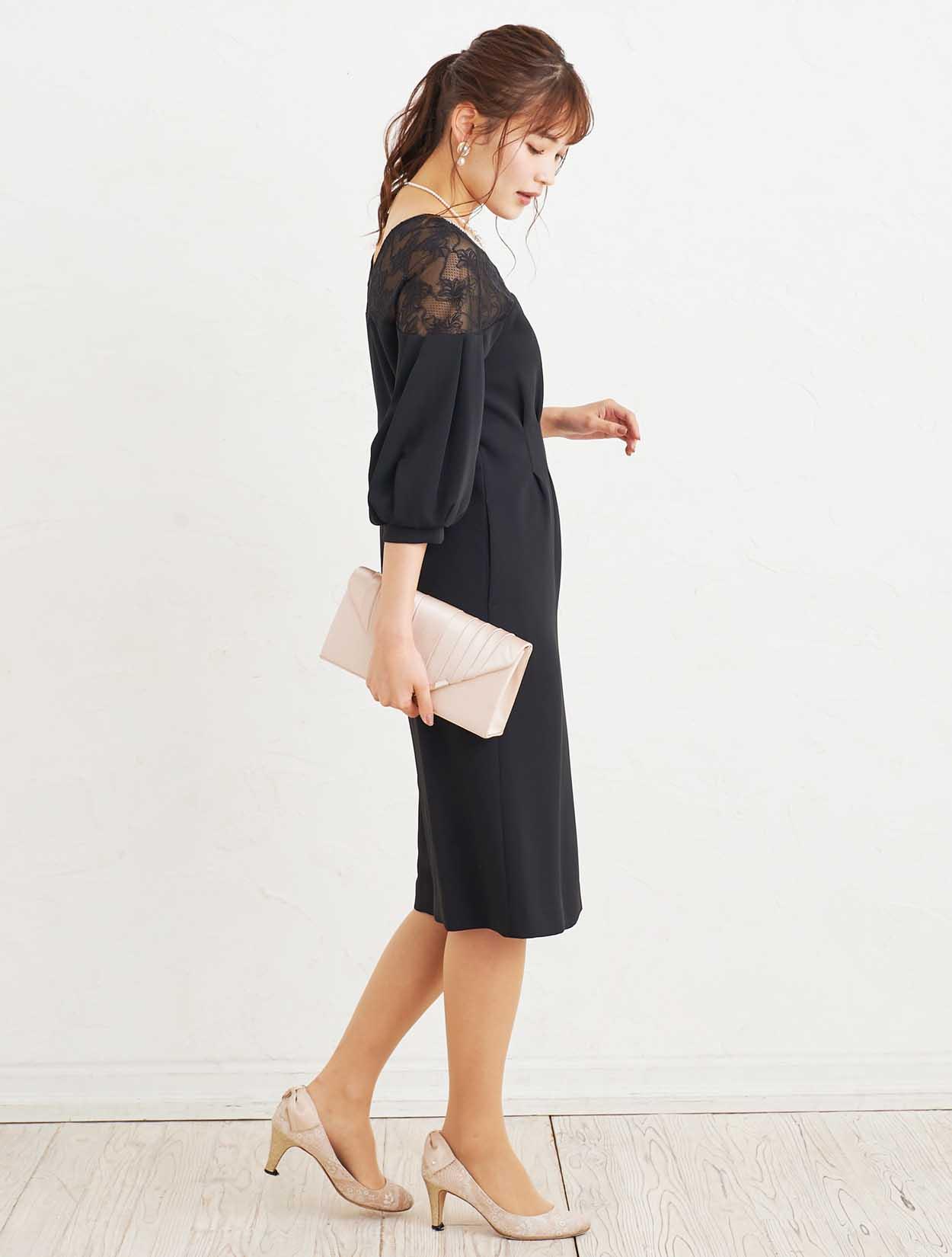 ■ウエストに施したタックが巧みなシルエットを演出しデコルテから袖上までのレースの透け感が女性らしい柔らかな印象のタイトドレス。