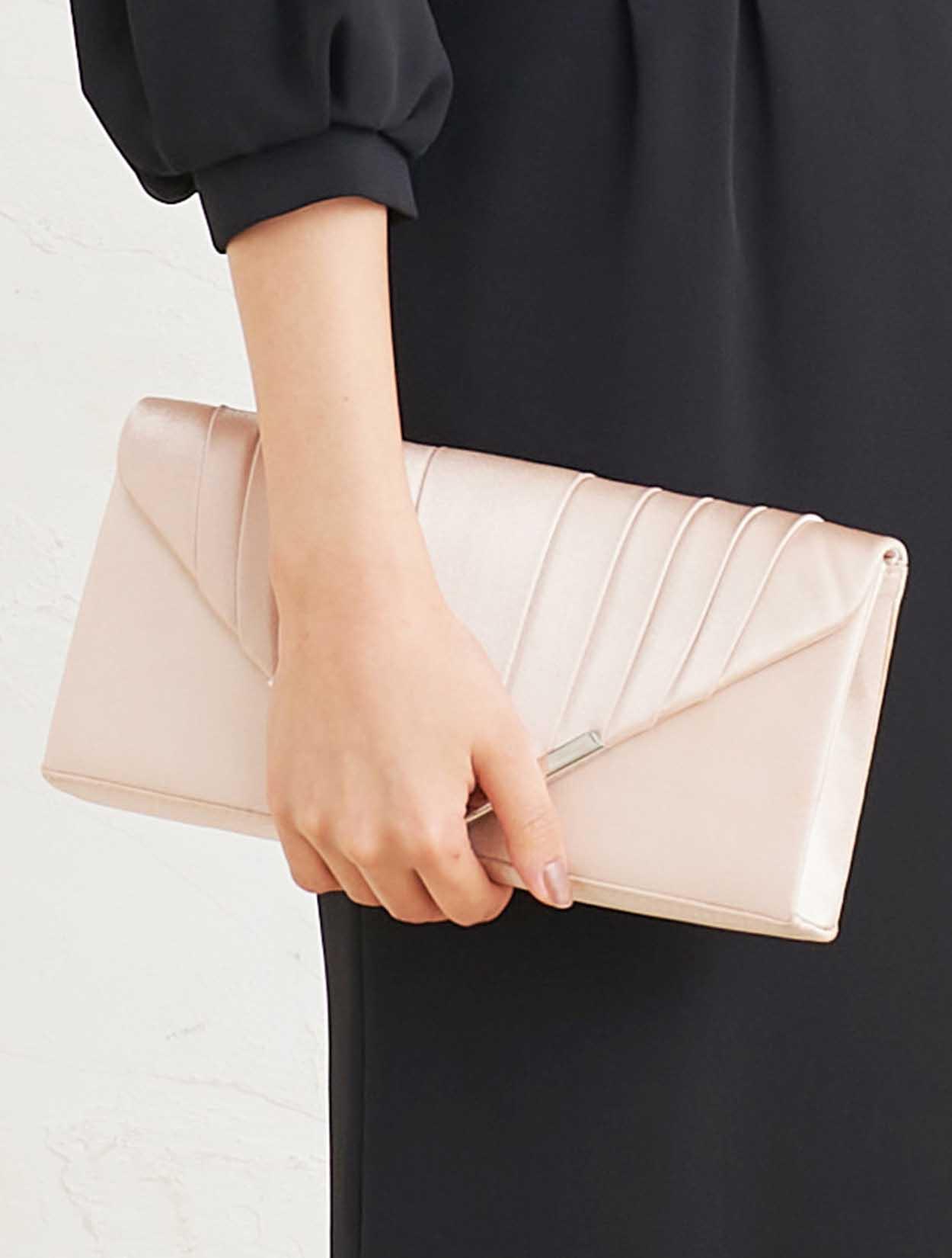 ■シックなブラックのドレスに、きちんと感のあるベージュのスクエアクラッチバッグを合わせたコーディネートは、どんなシーンでも活躍できるおすすめセットです。