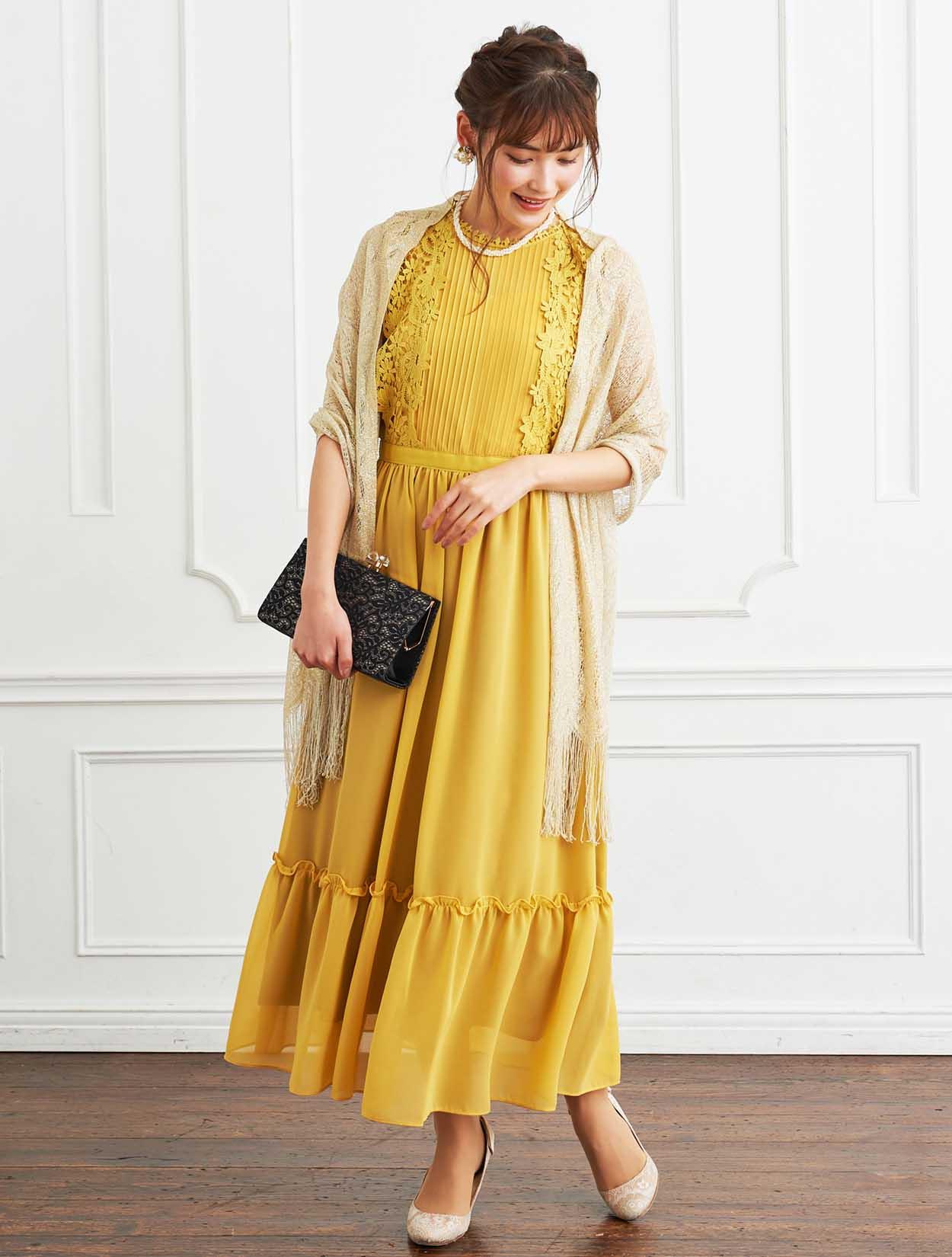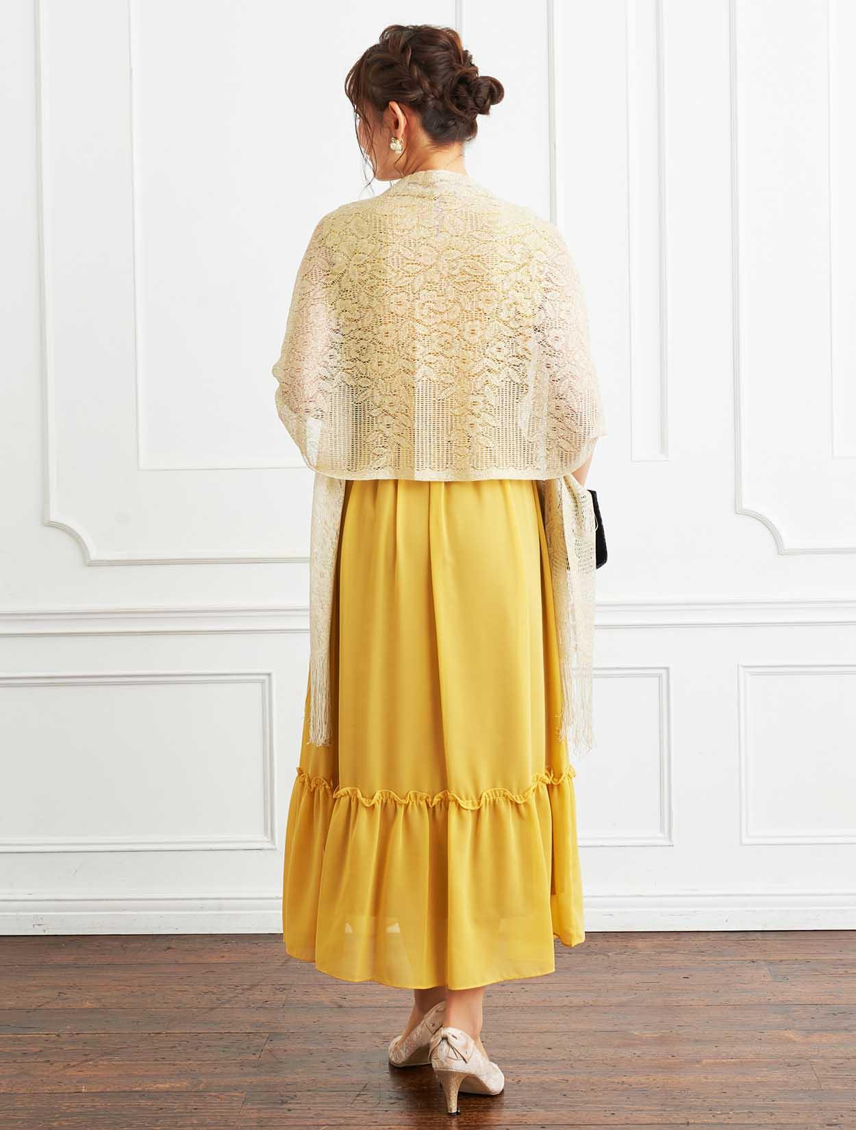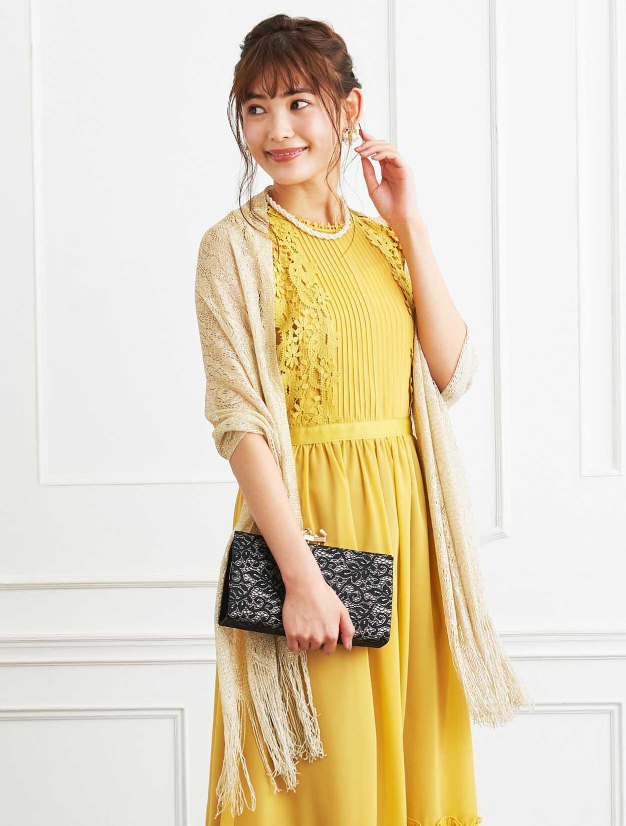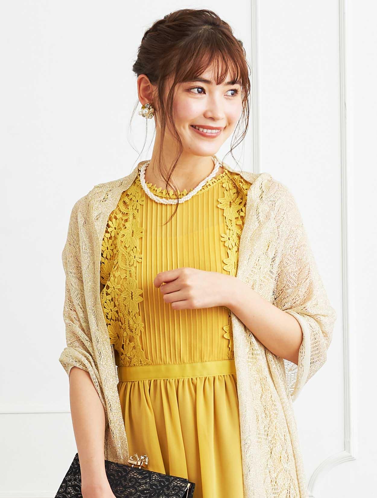 ■パッと会場を明るくさせてくれるイエローのドレスにラメストールを合わせたパーティーにおすすめのコーディネートです。