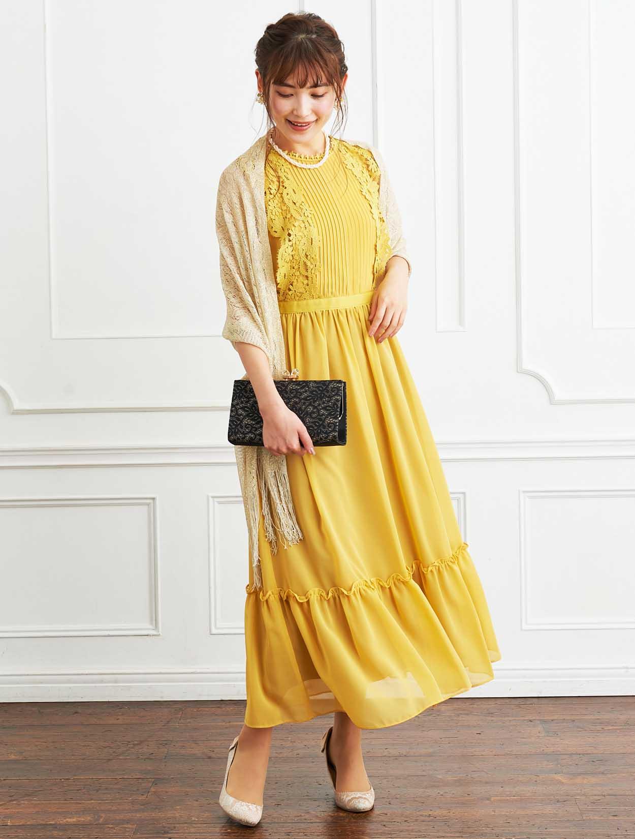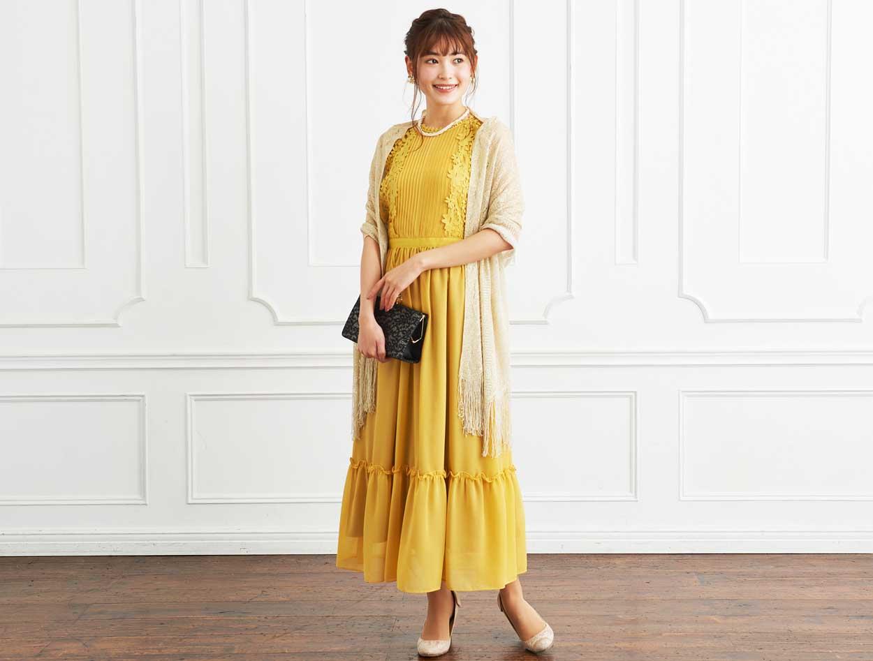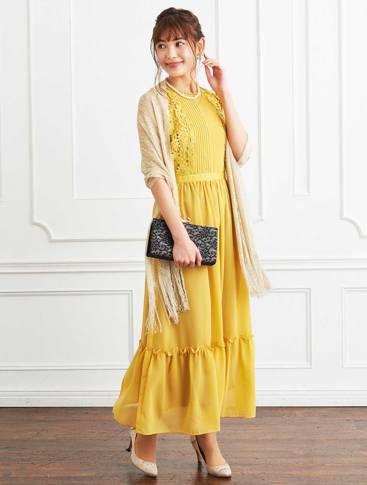 ■パッと会場を明るくさせてくれるイエローのドレスにラメストールを合わせたパーティーにおすすめのコーディネートです。