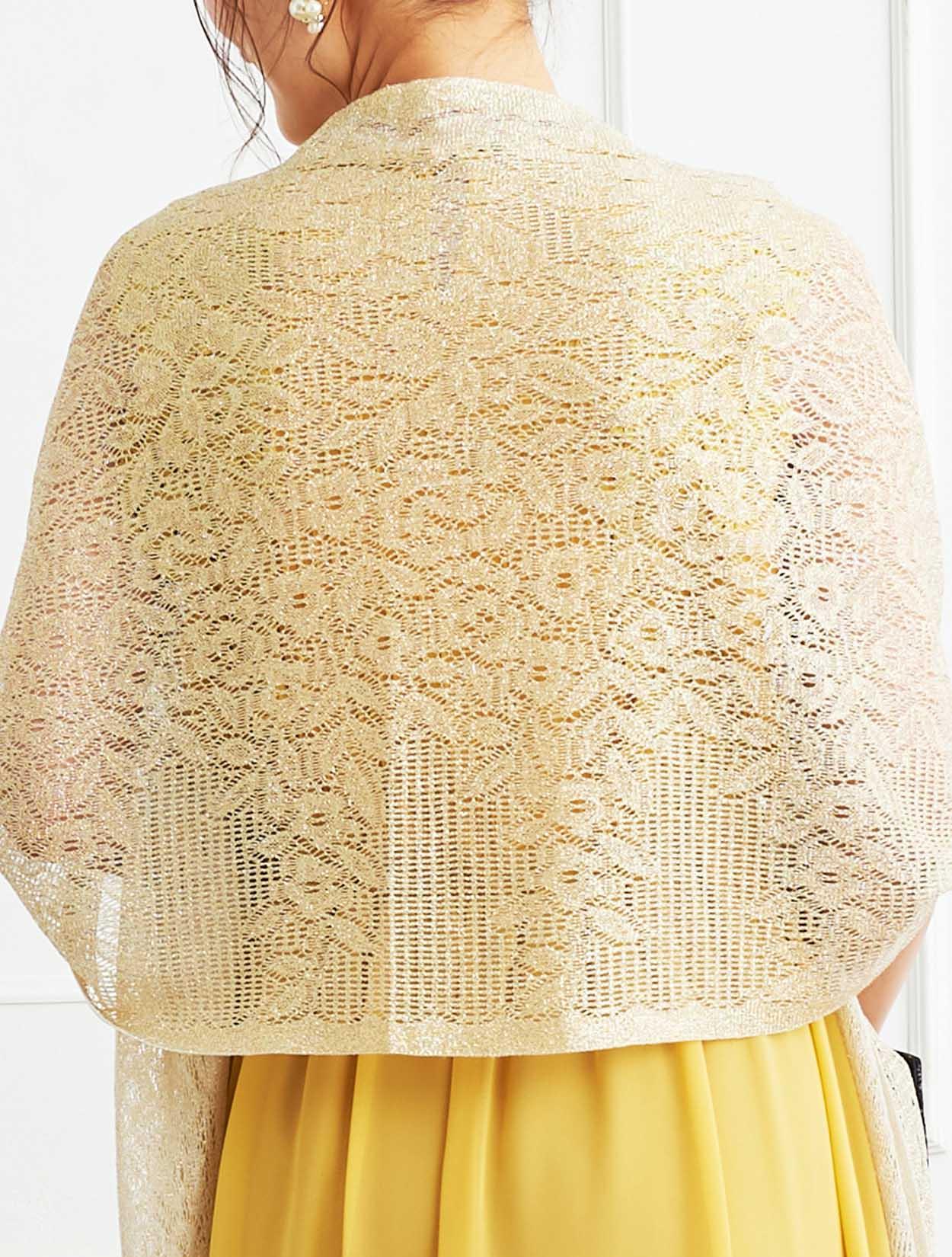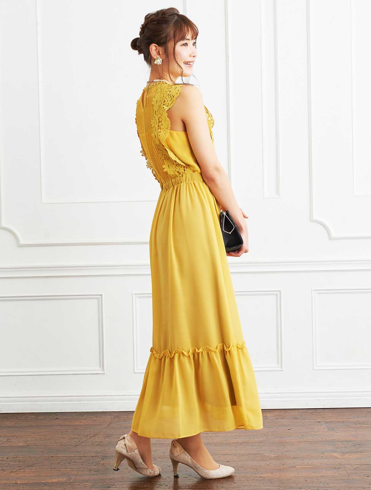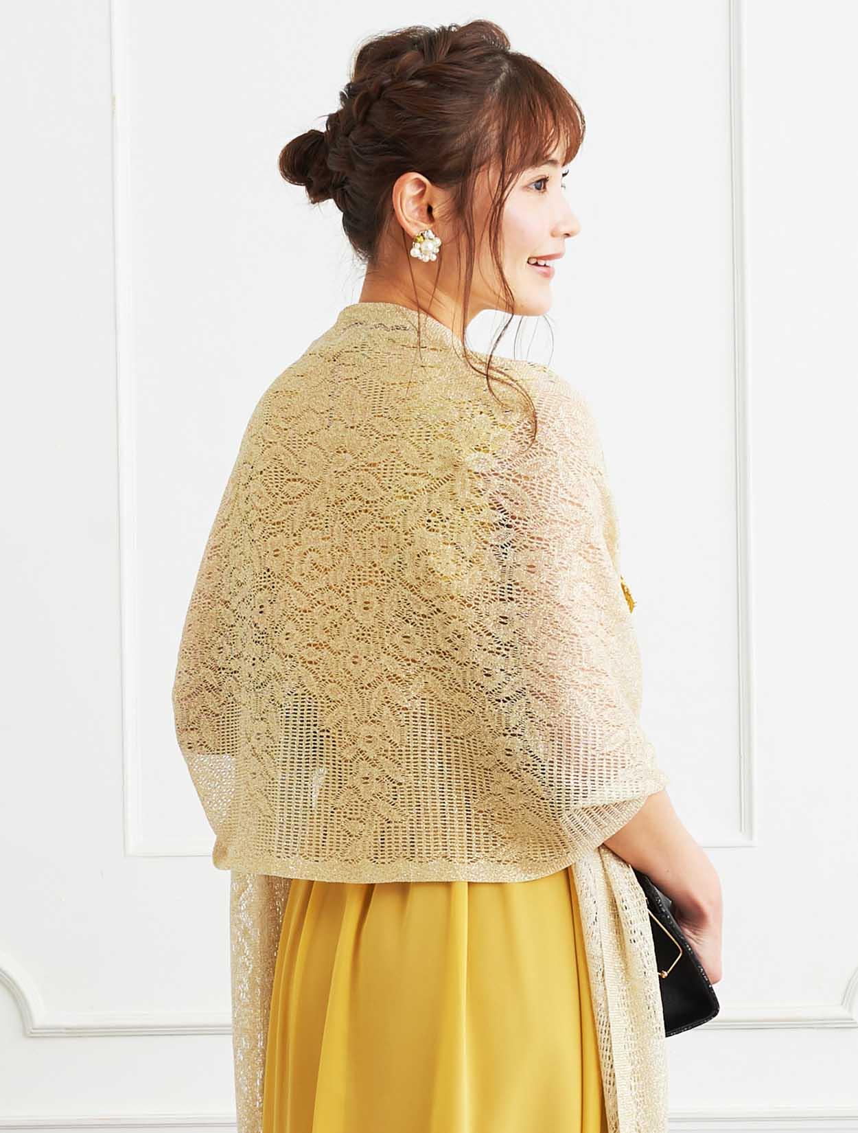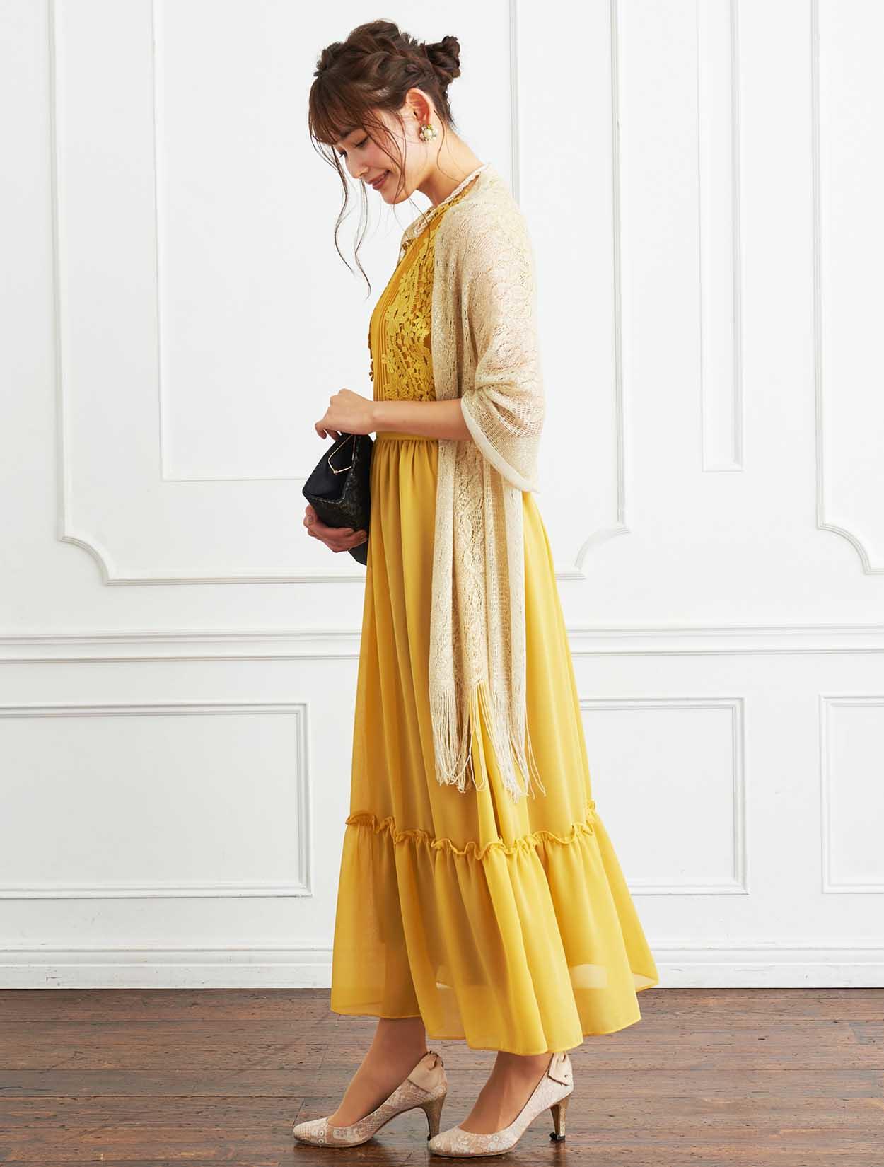 ■パッと会場を明るくさせてくれるイエローのドレスにラメストールを合わせたパーティーにおすすめのコーディネートです。