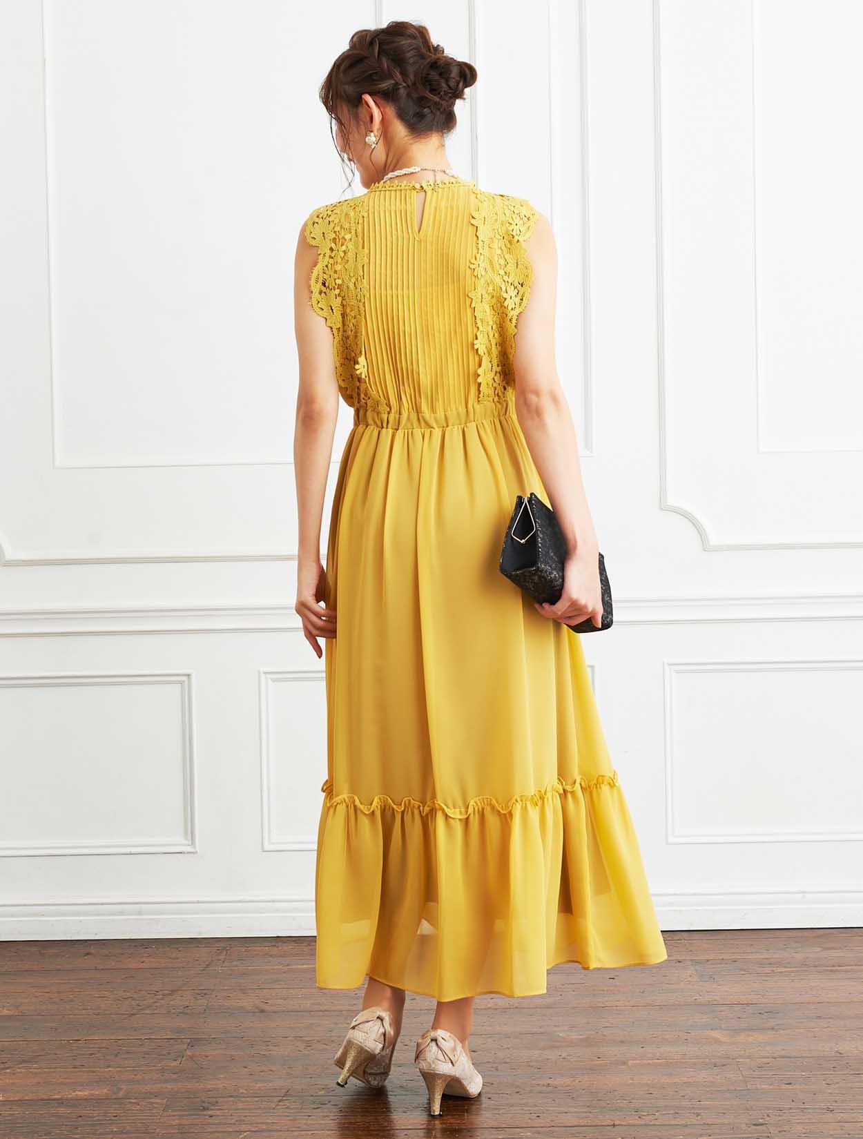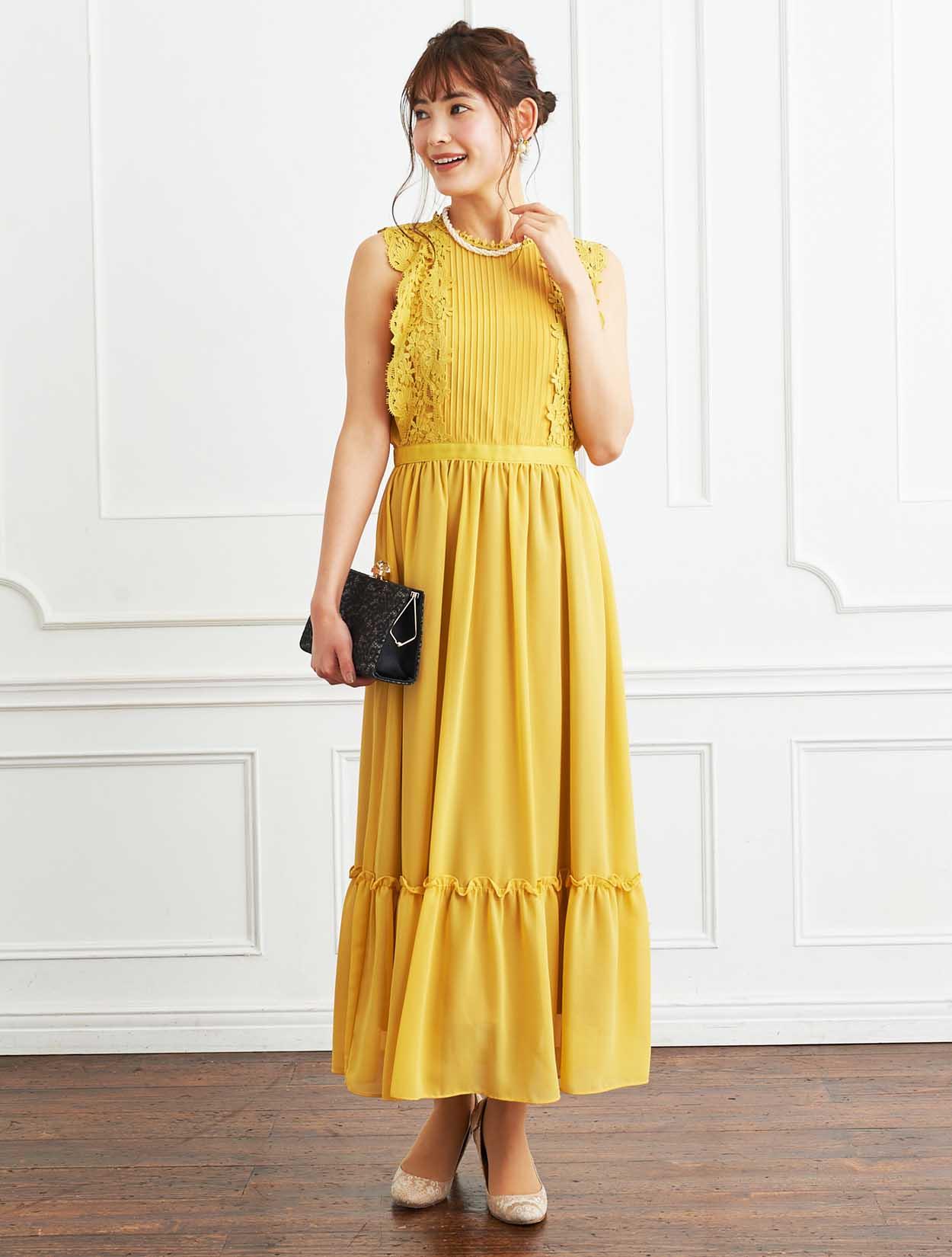 ■ネックからウエストに重なるタックデザインとレーススリーブが、今年らしく着こなせるドレスです。