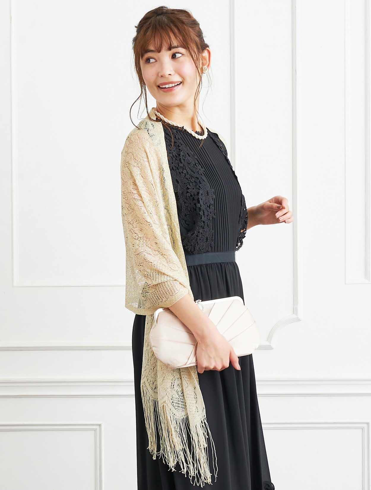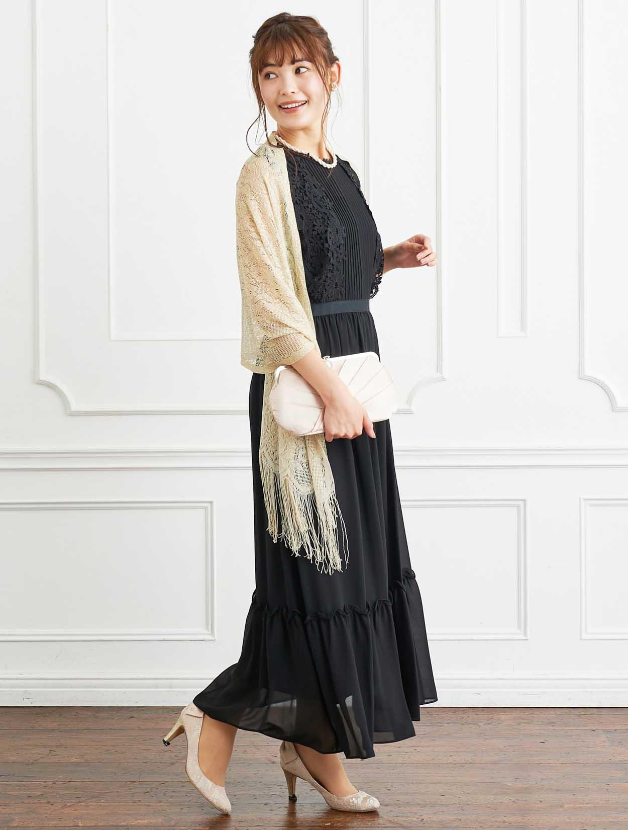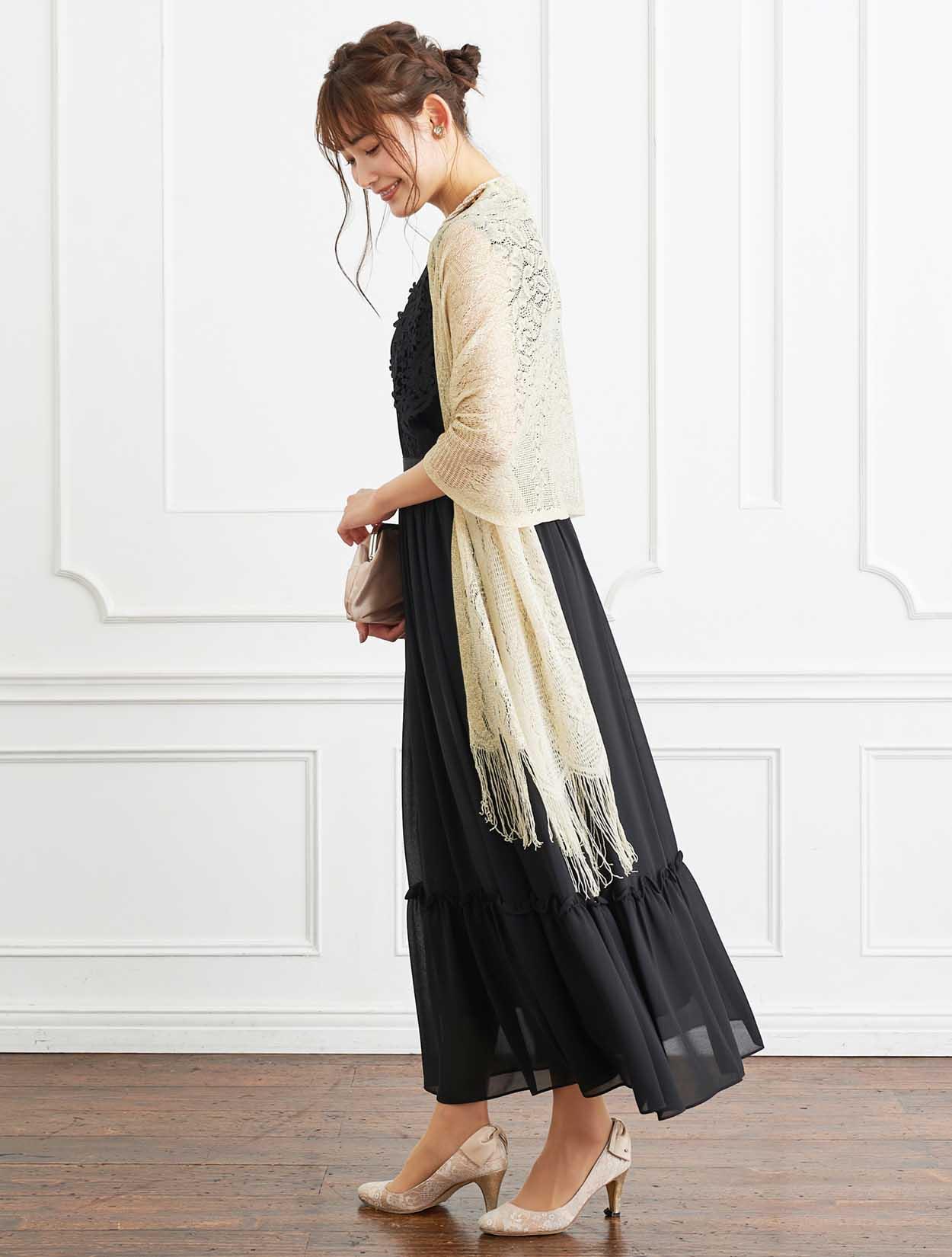 ■格式高いブラックのドレスにベージュのストールで柔らかい印象のコーディネートです。