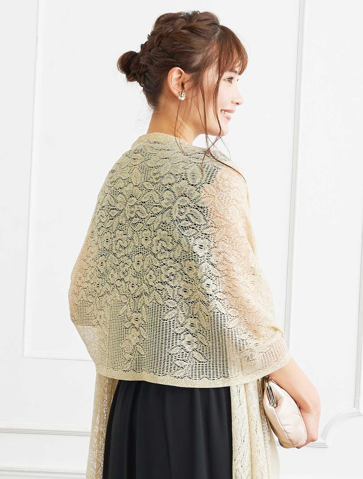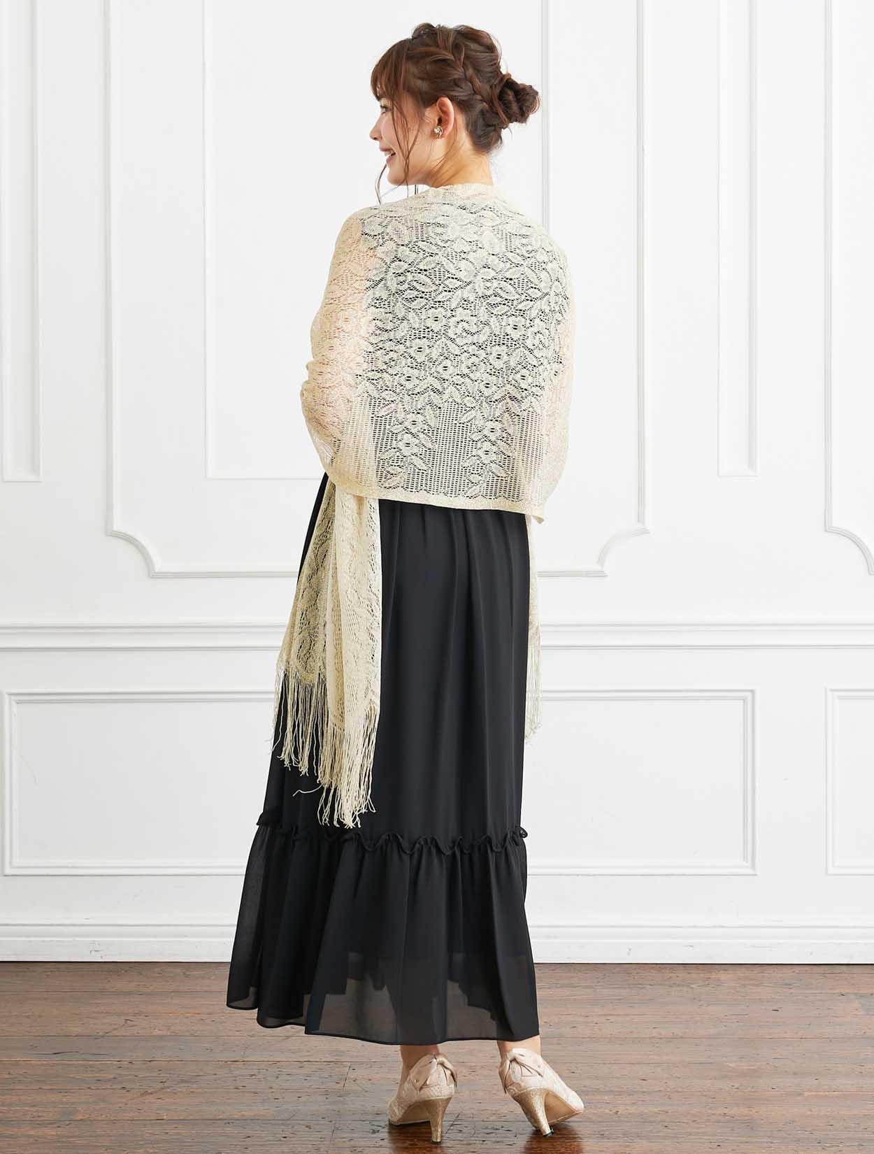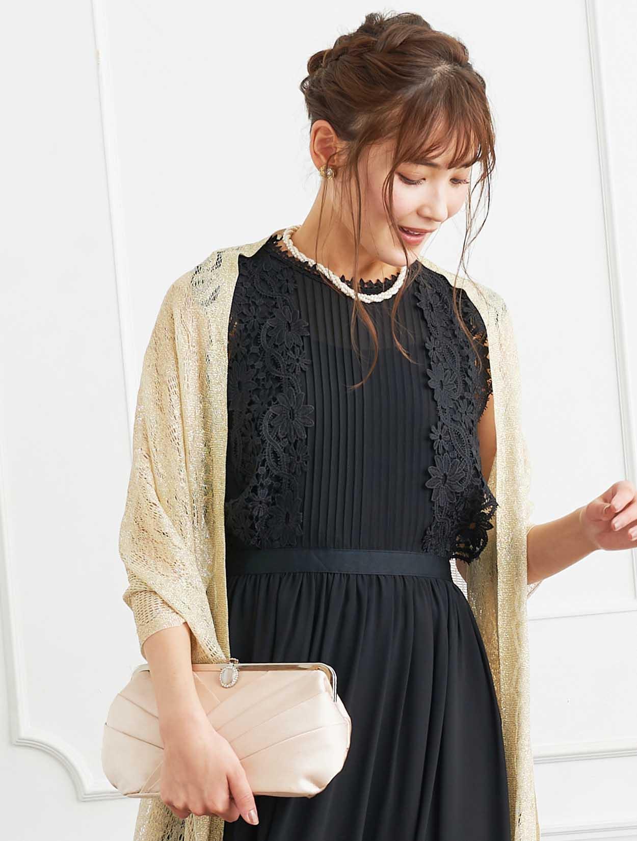 ■格式高いブラックのドレスにベージュのストールで柔らかい印象のコーディネートです。