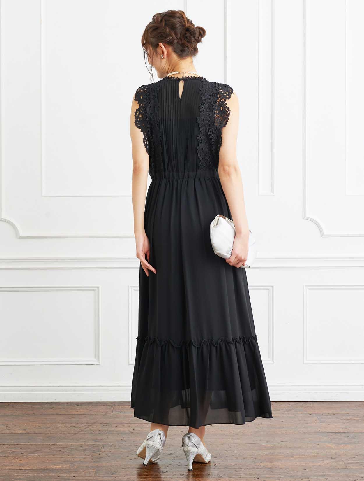 ■ネックからウエストに重なるタックデザインとレーススリーブが、今年らしく着こなせるドレスです。