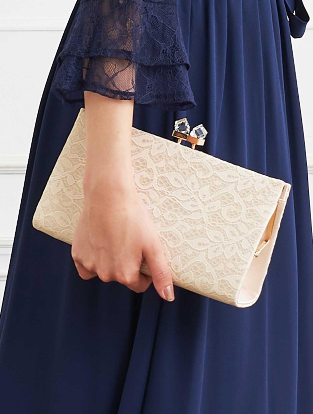 ■どんなシーンにもオススメできる、落ち着いた印象のネイビードレスと上品なベージュのオーガンジーレースのバッグを合わせたコーディネート。
