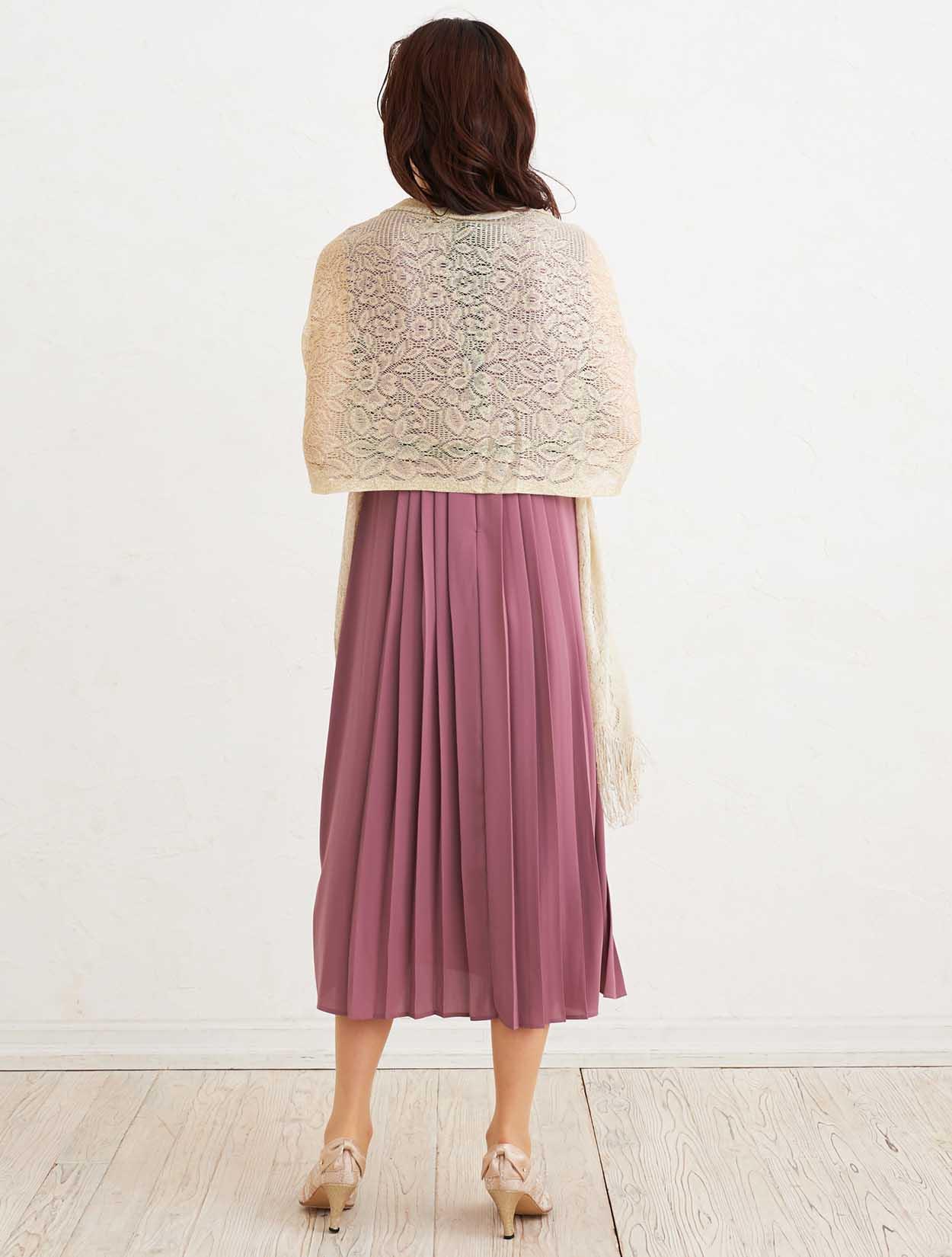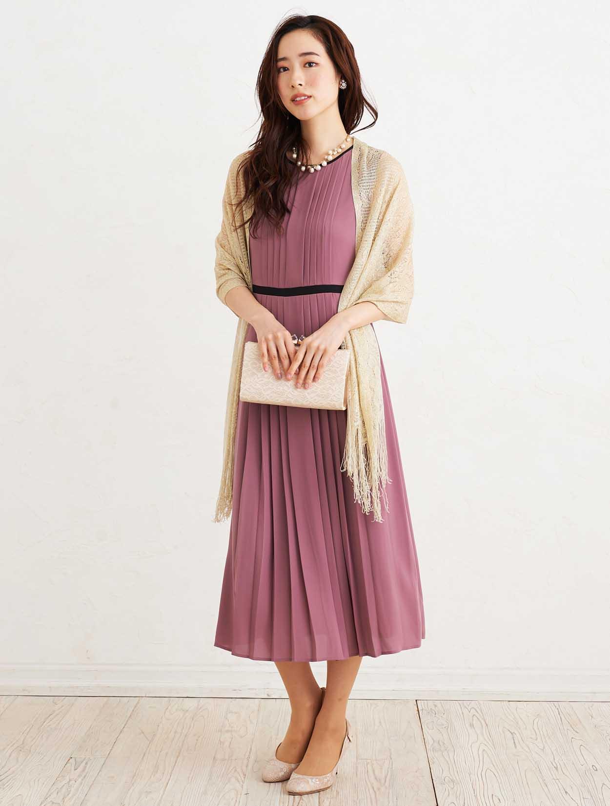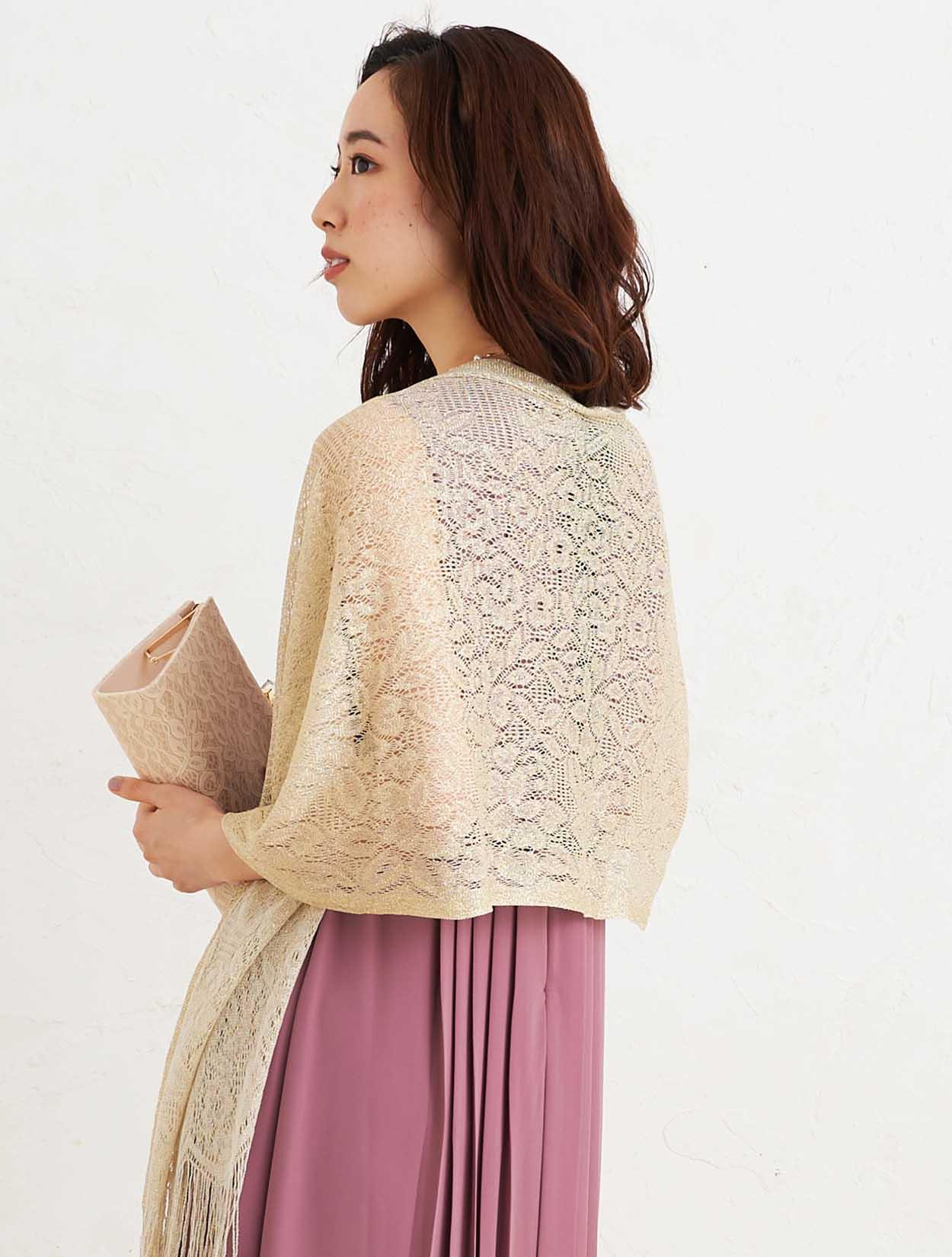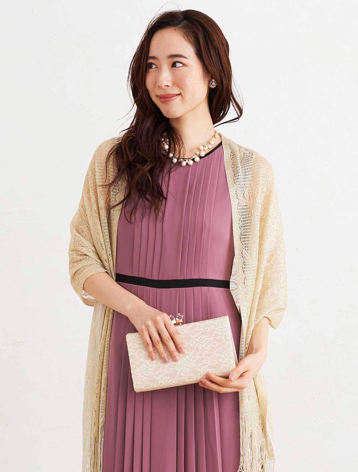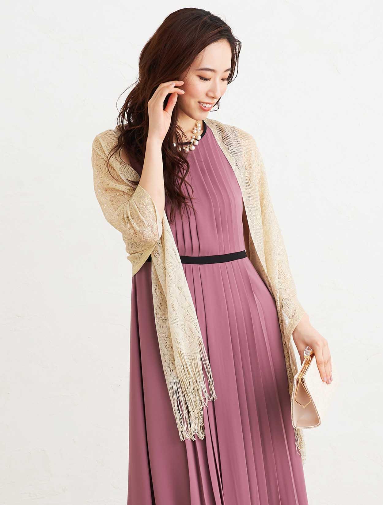 ■上品なダスティーピンクのドレスとゴールドのラメストールで優し気な印象を与えてくれます。