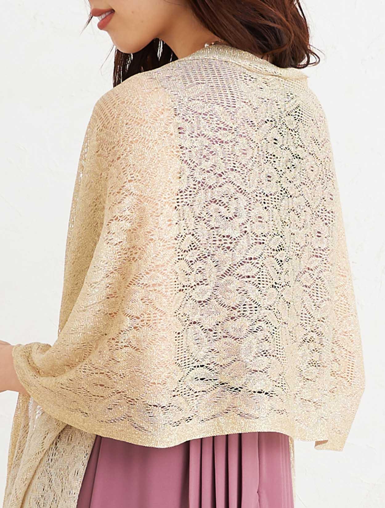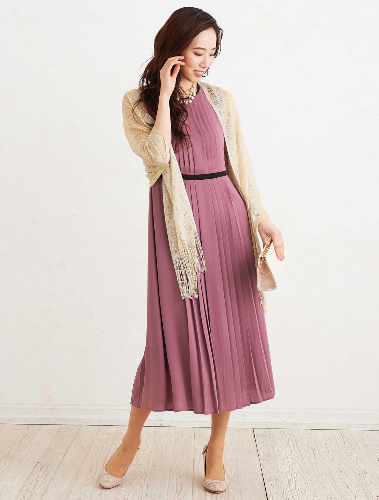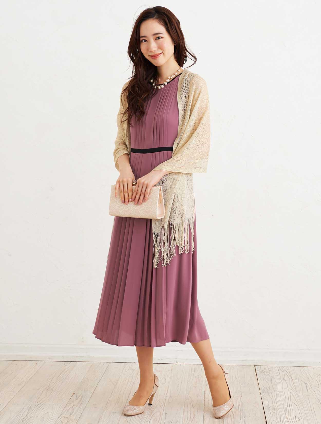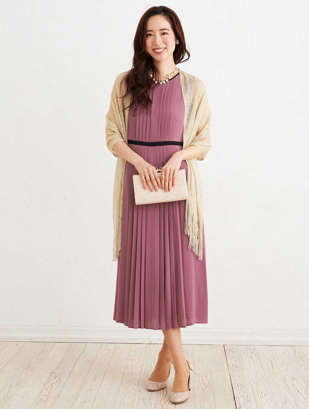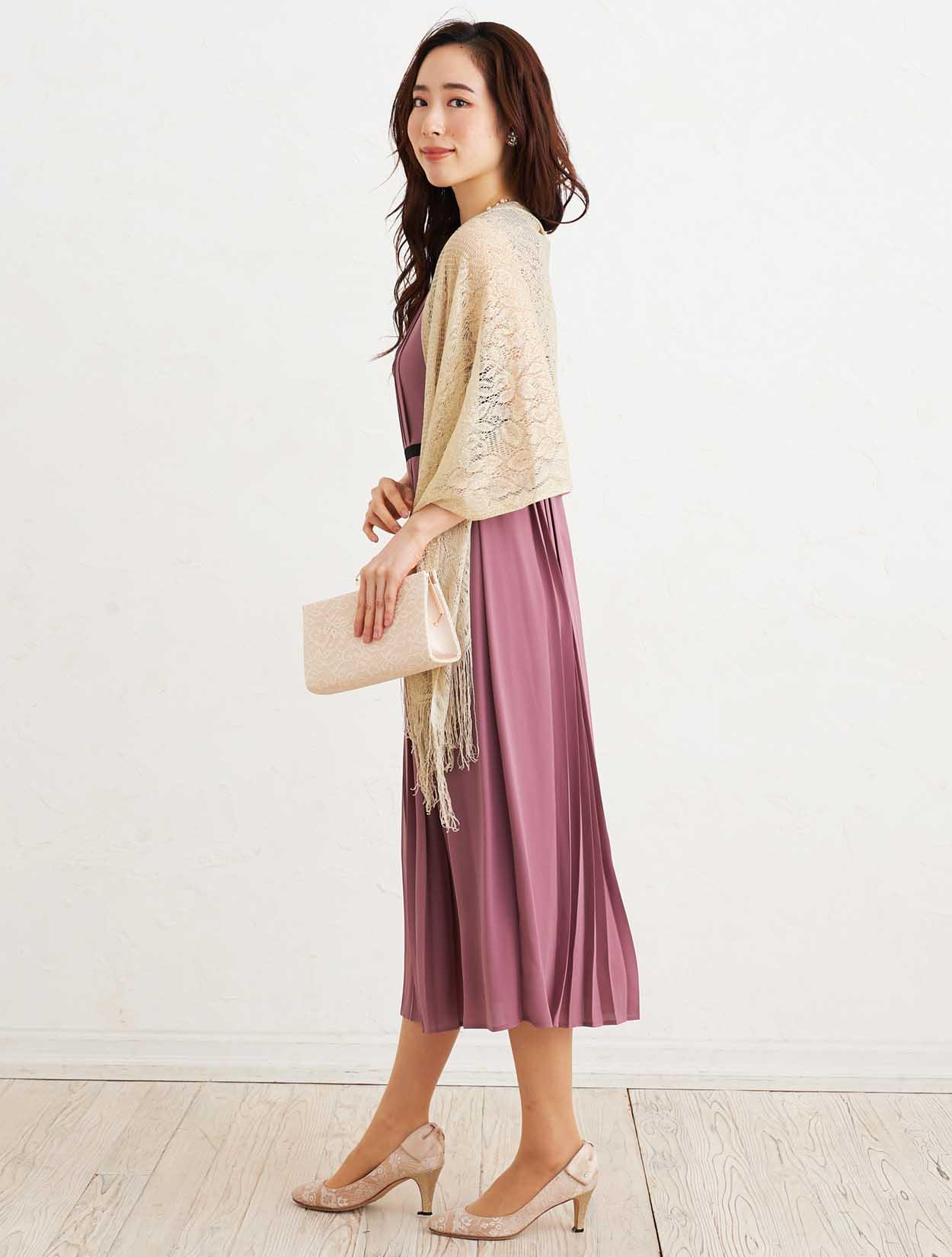 ■上品なダスティーピンクのドレスとゴールドのラメストールで優し気な印象を与えてくれます。