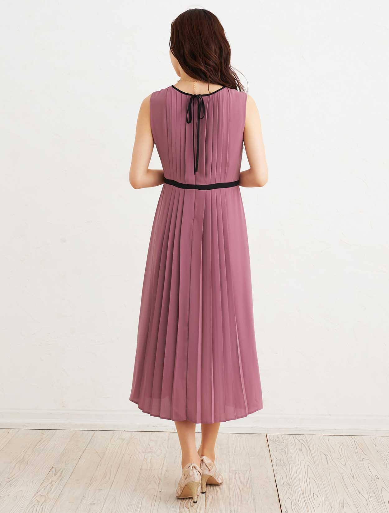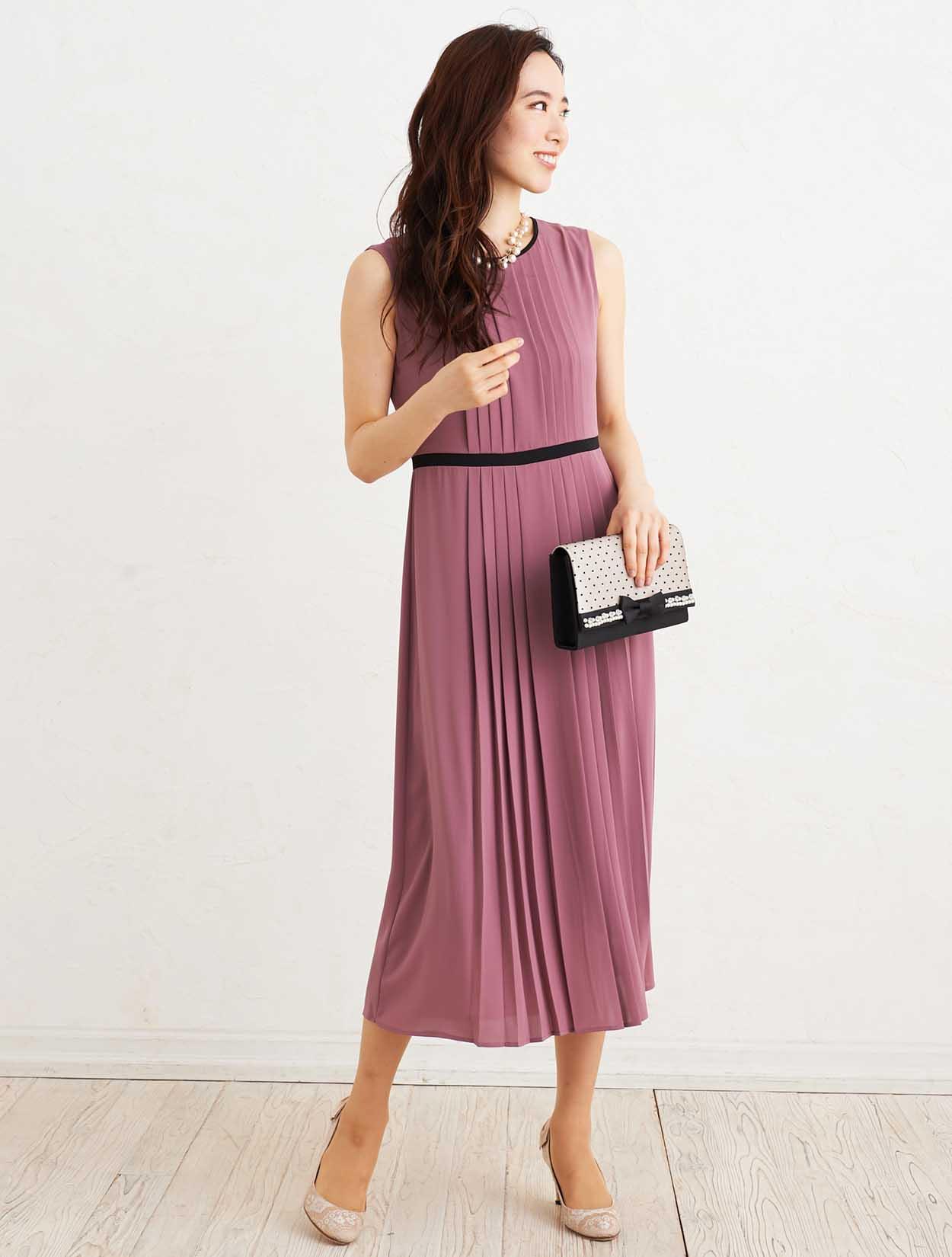 ■派手過ぎないスモーキーピンクが大人可愛い、トレンド感のあるロングドレス。