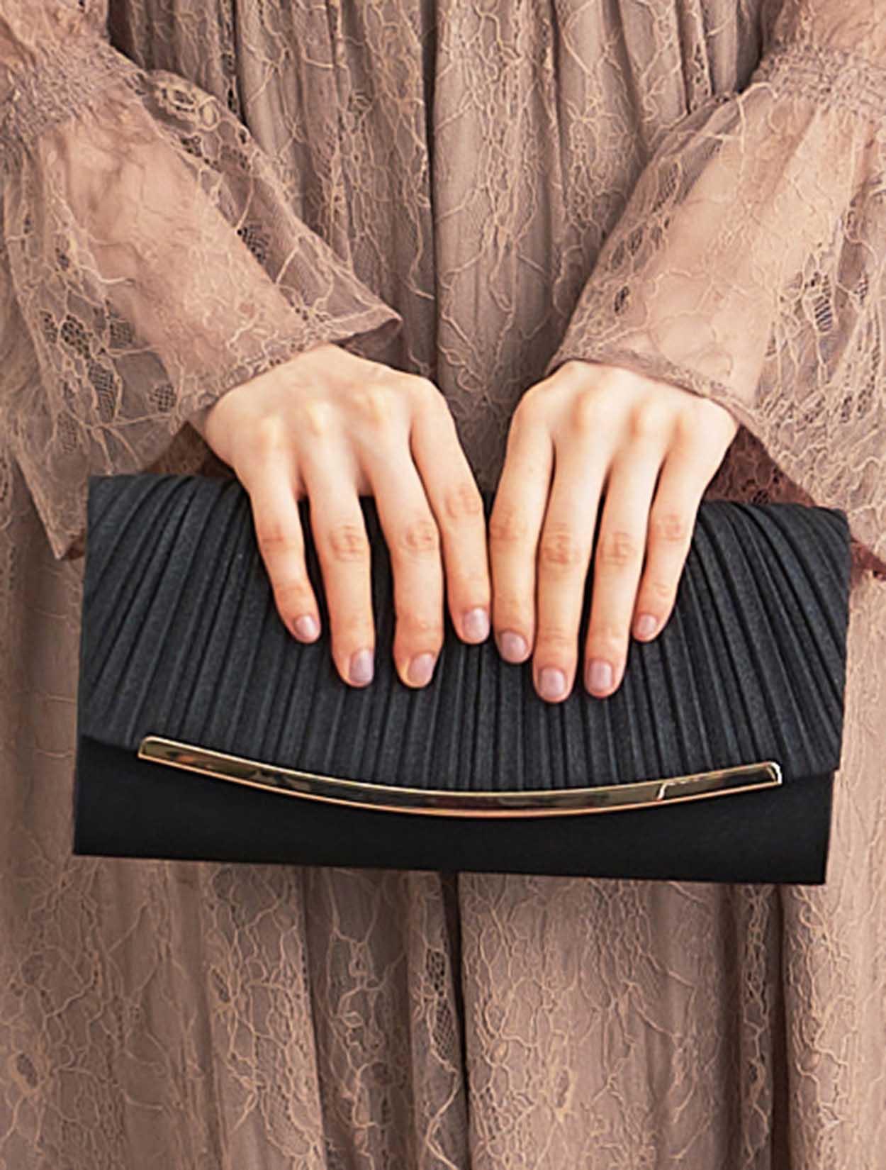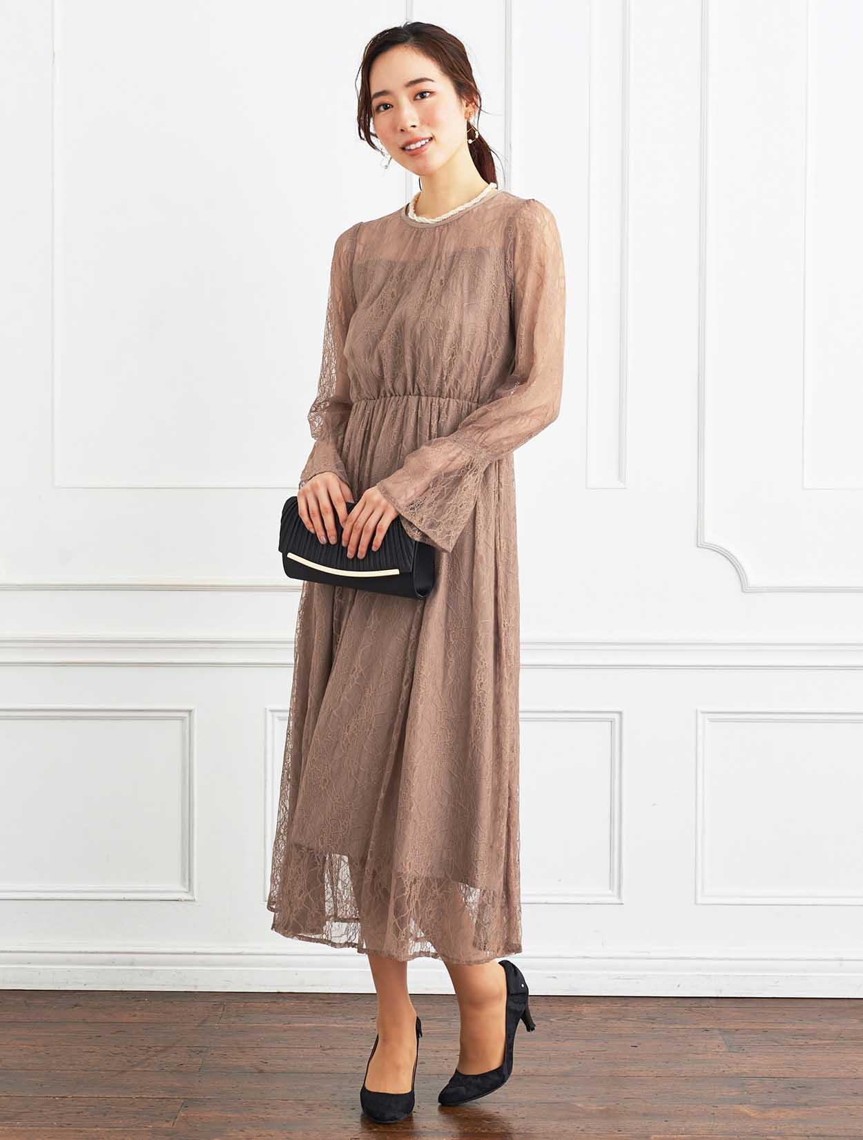 ■トレンド感アップのブラウンのロングドレスに、シンプルなブラックのクラッチバッグを合わせたお洒落なコーディネート。