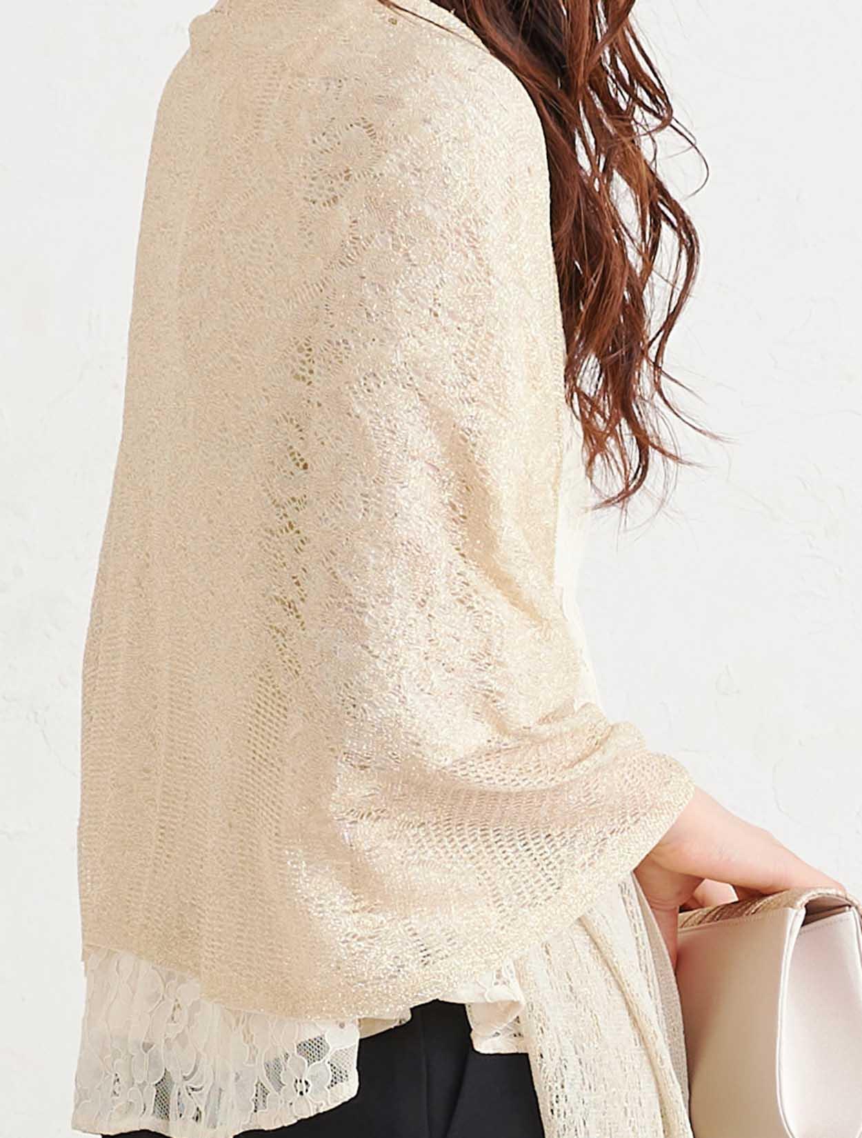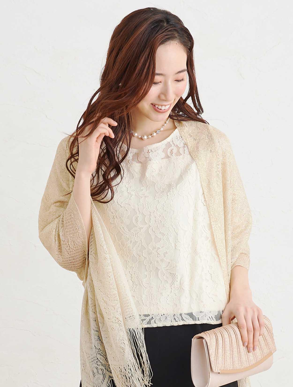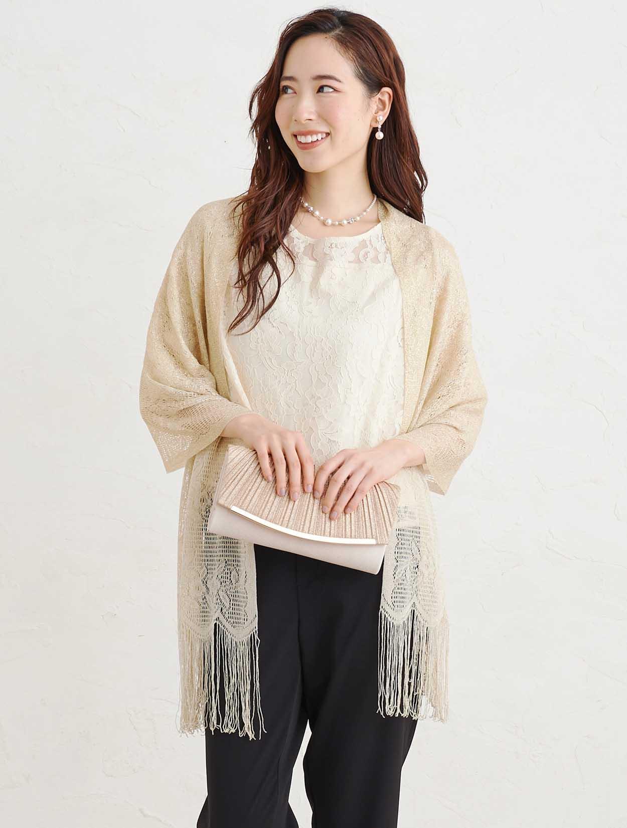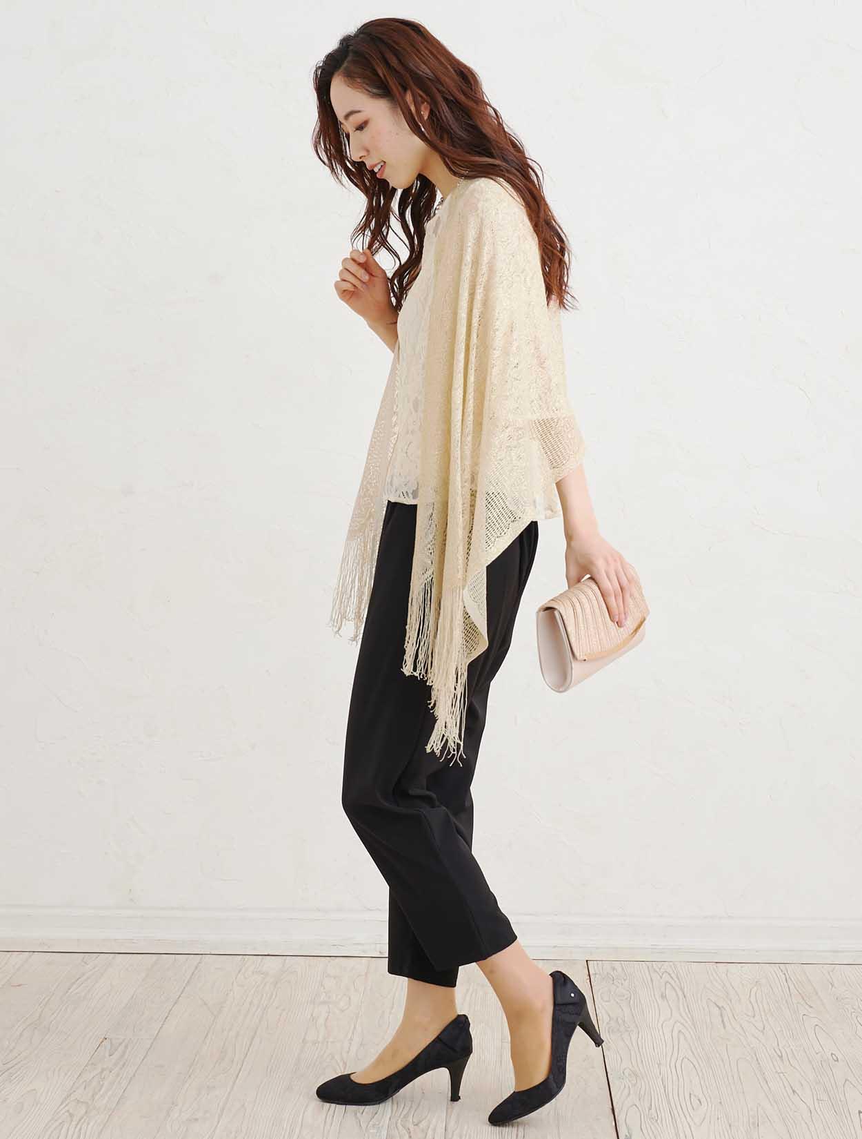 ■キレイ目のパンツドレスにラメストールで華やかさをプラスしたコーディネート。