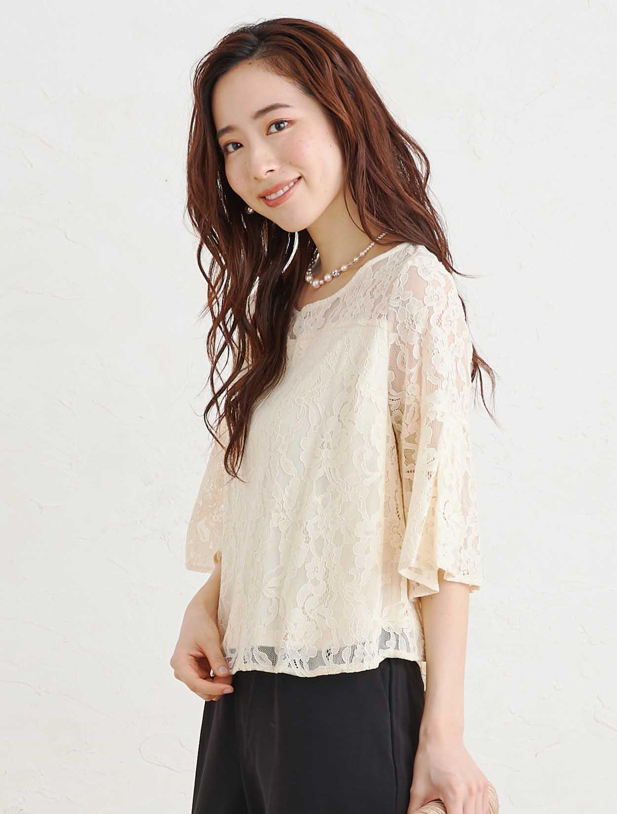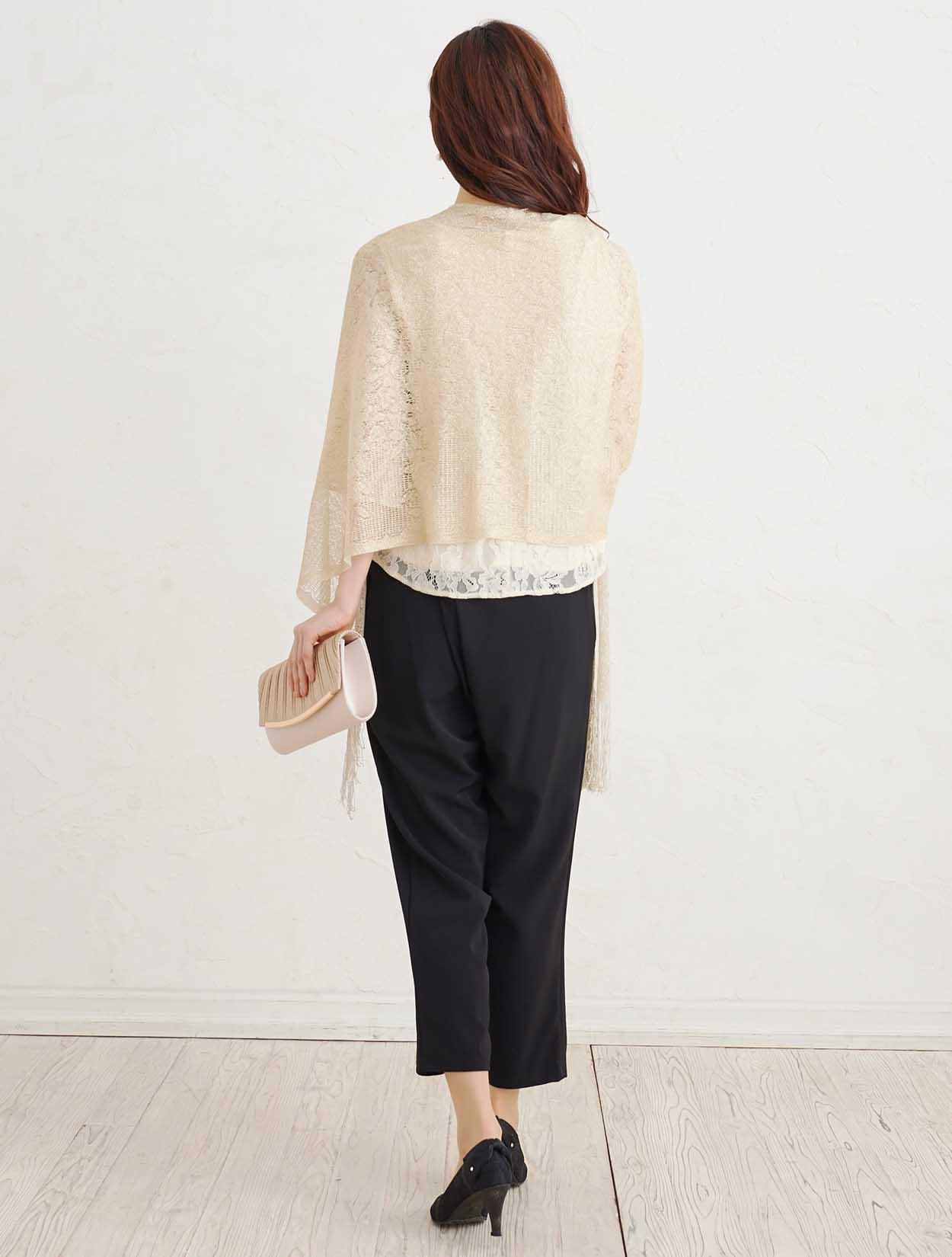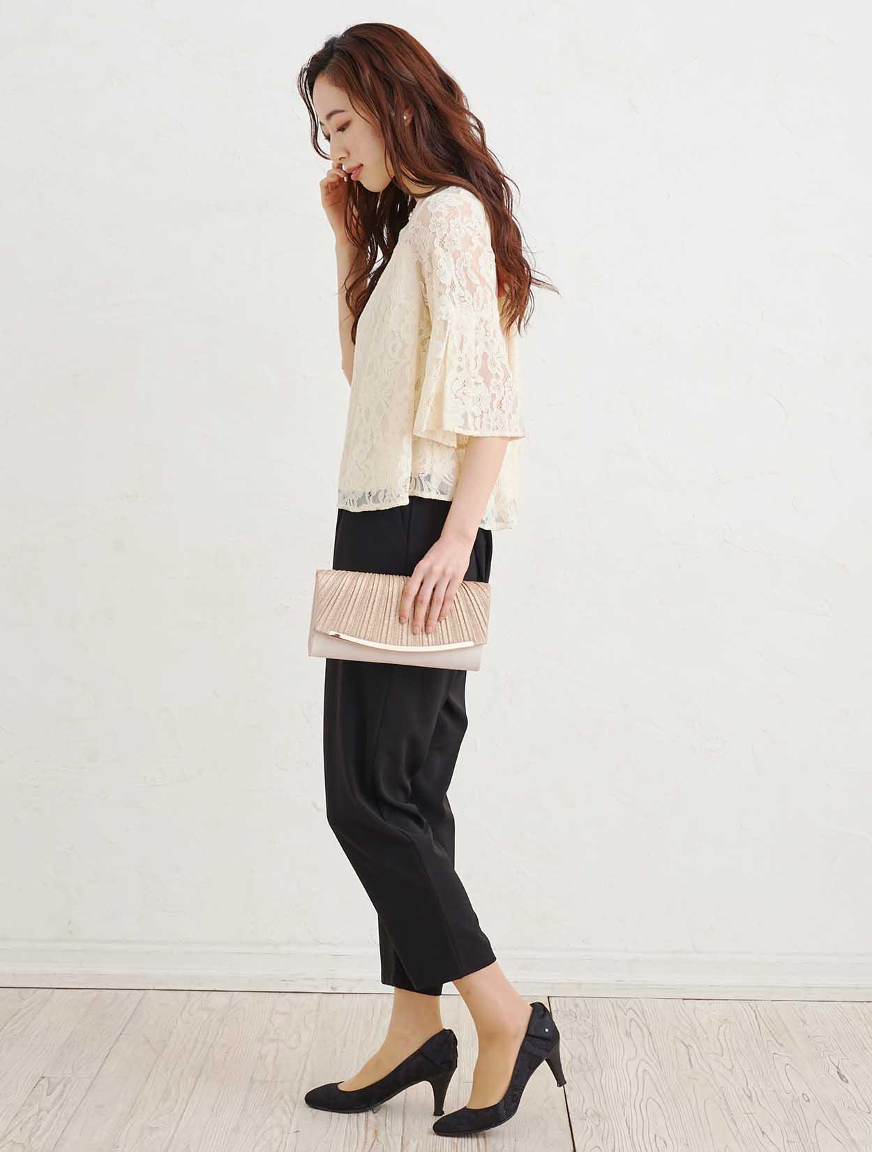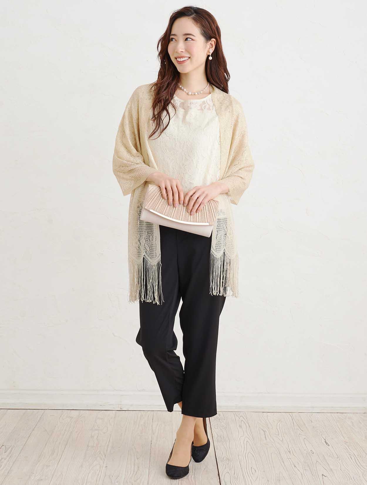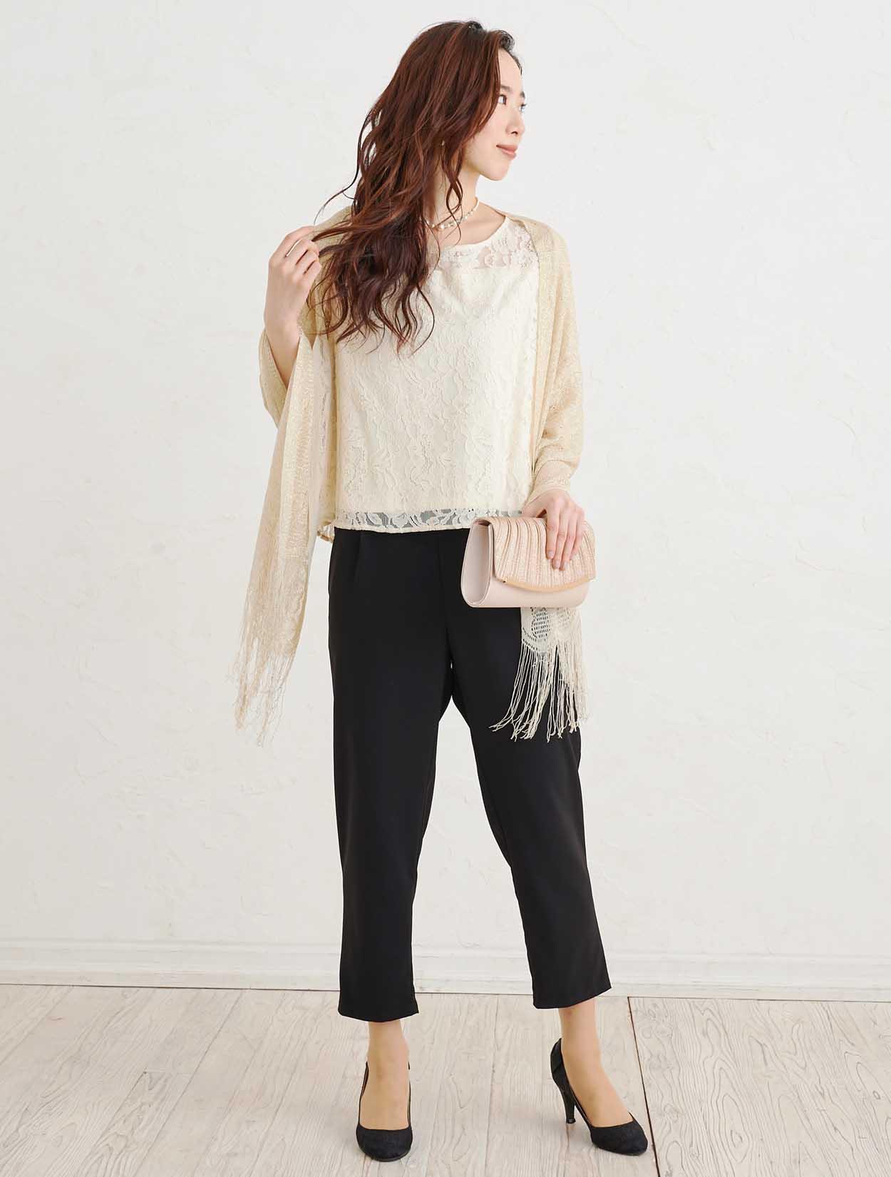 ■上品なベージュのレーストップスと黒のスラックスで作る洗練されたセットアップスタイル。