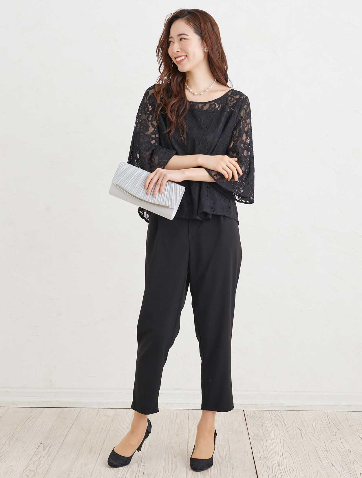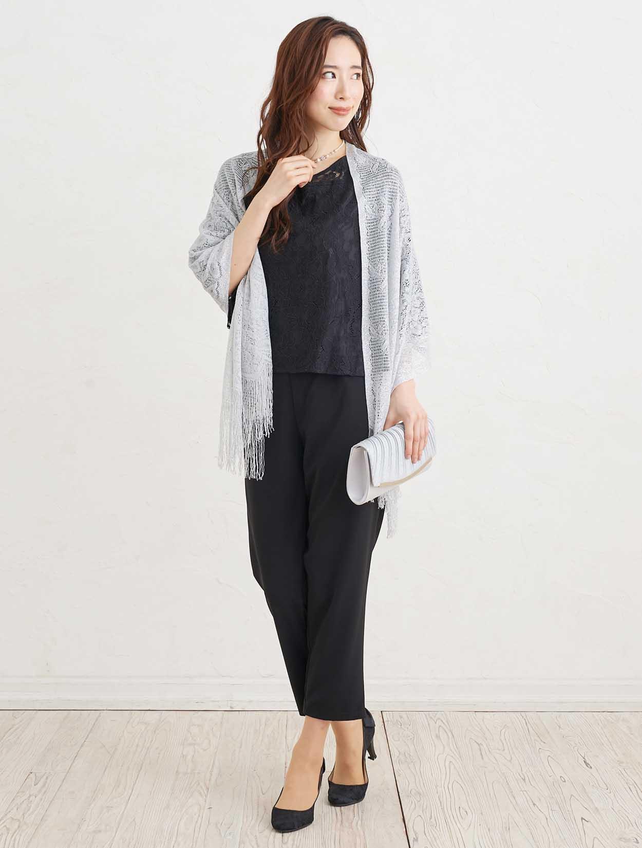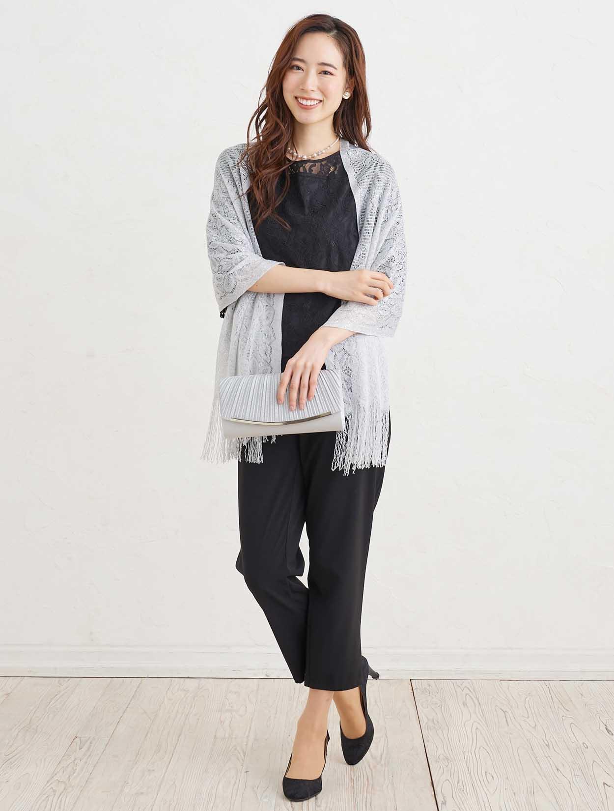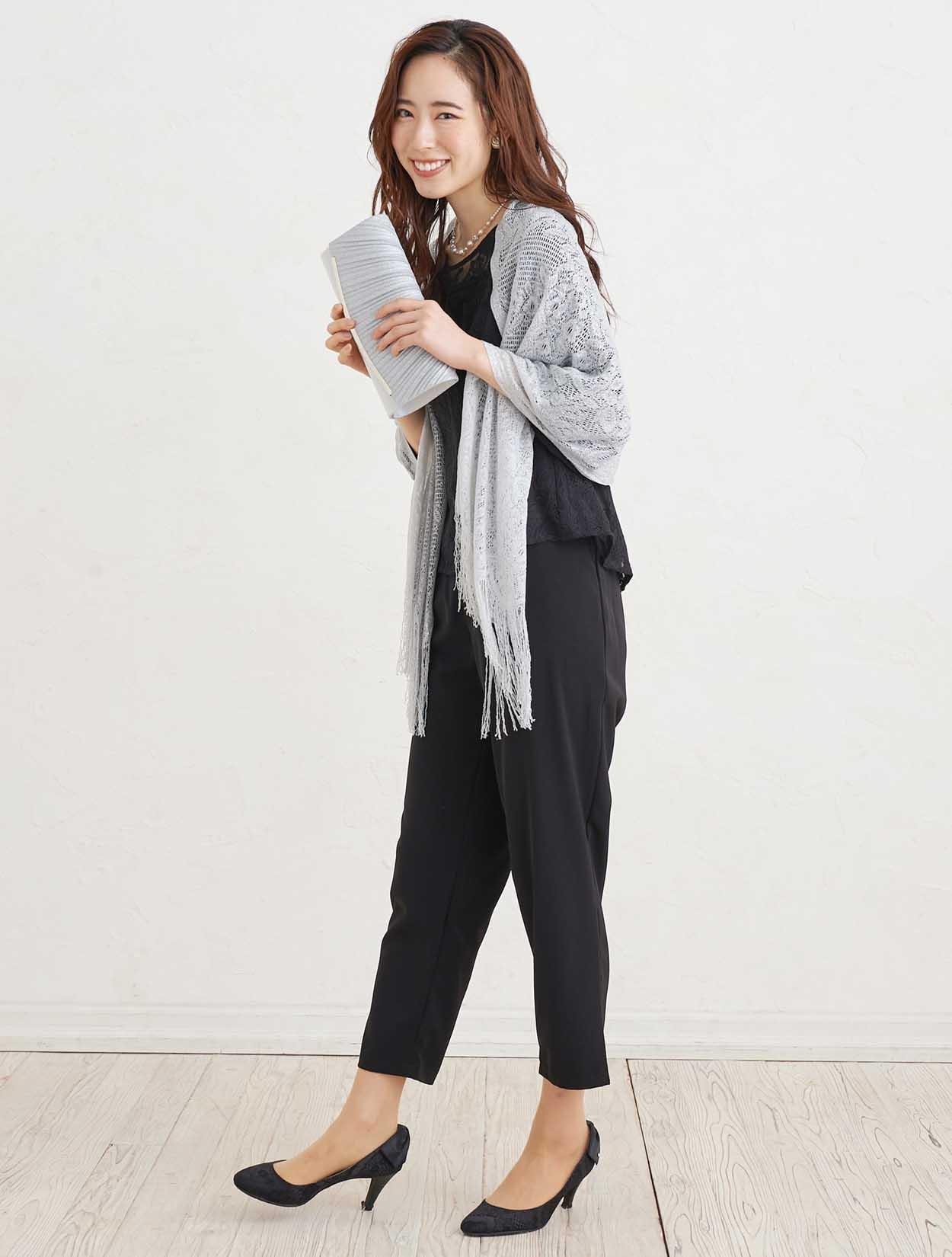 ■トップスに透け感のあるブラックカラーのパンツドレスにシルバーのストールが映え特別感を充分に引き出してくれるコーディネート。