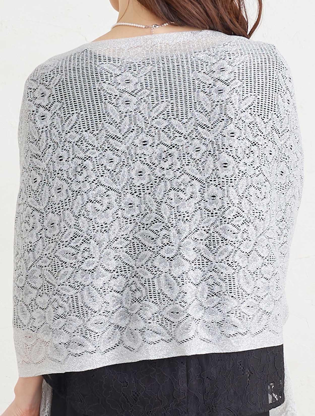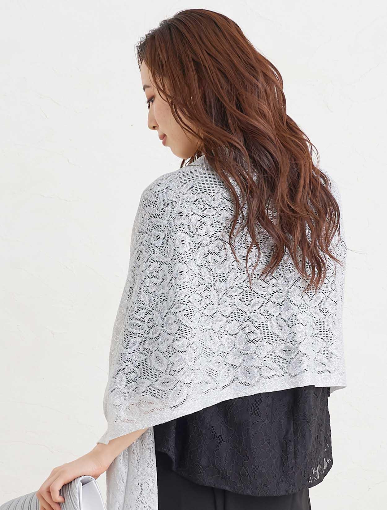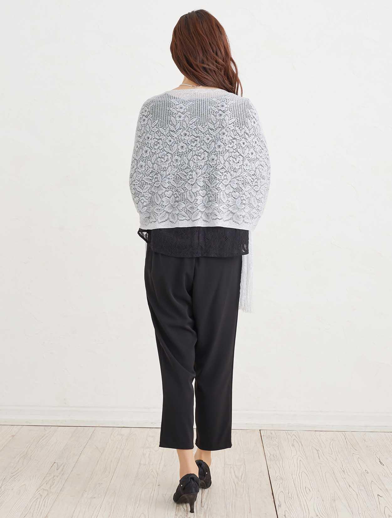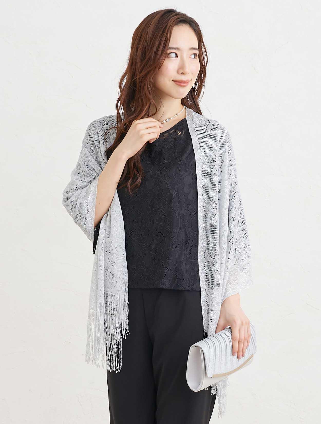 ■トップスに透け感のあるブラックカラーのパンツドレスにシルバーのストールが映え特別感を充分に引き出してくれるコーディネート。