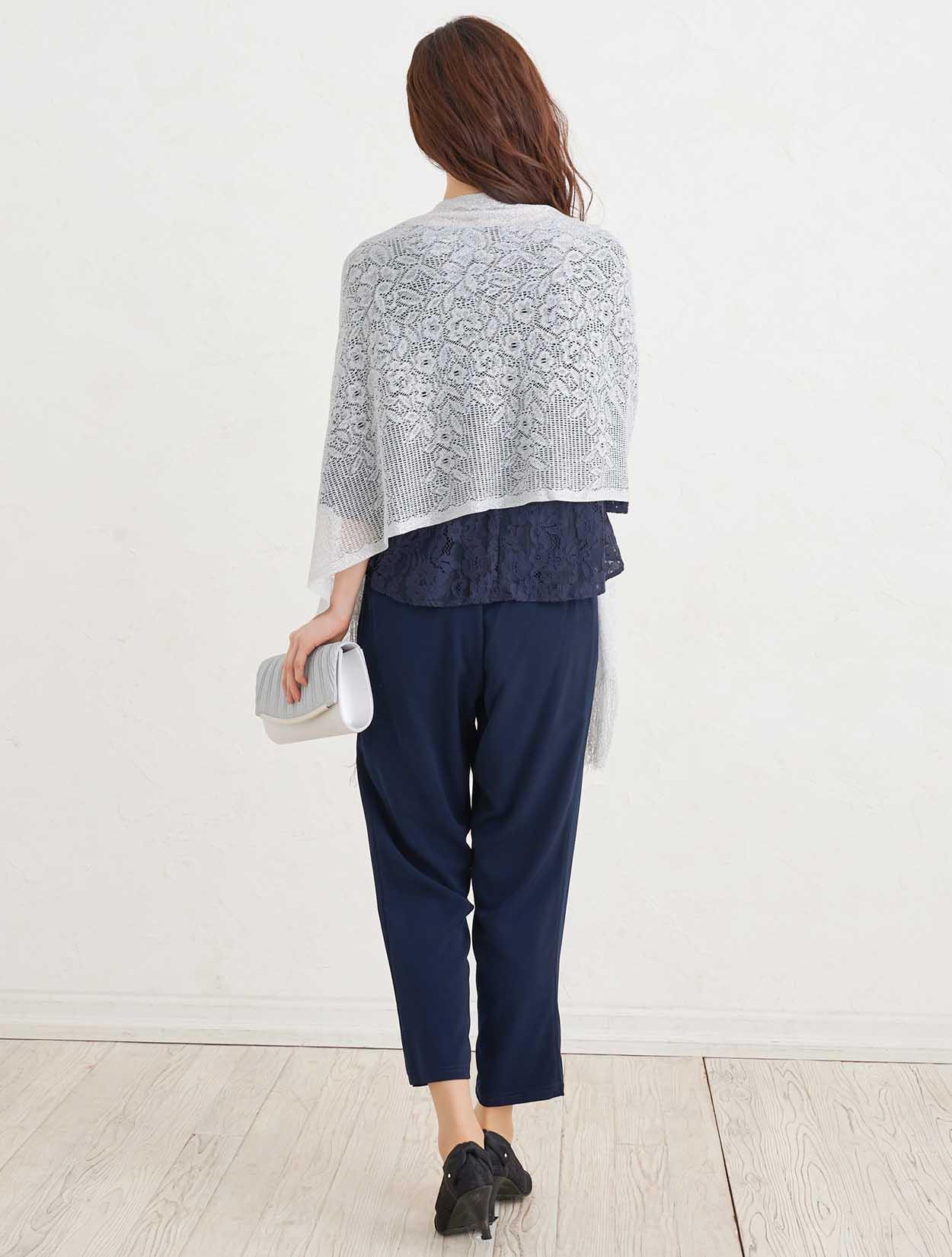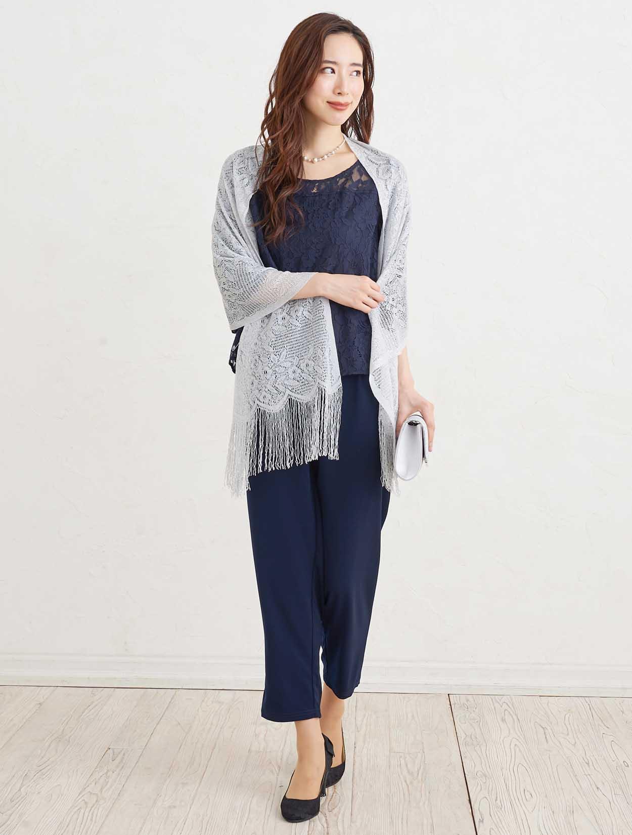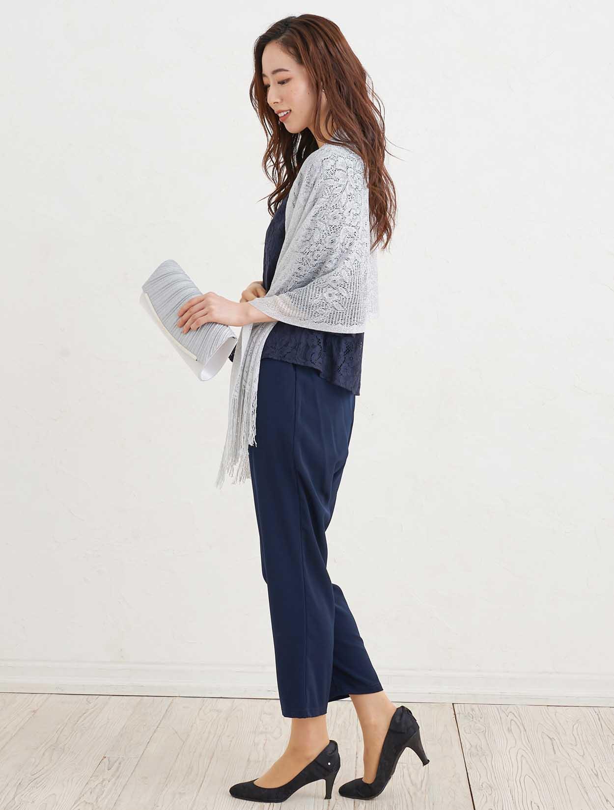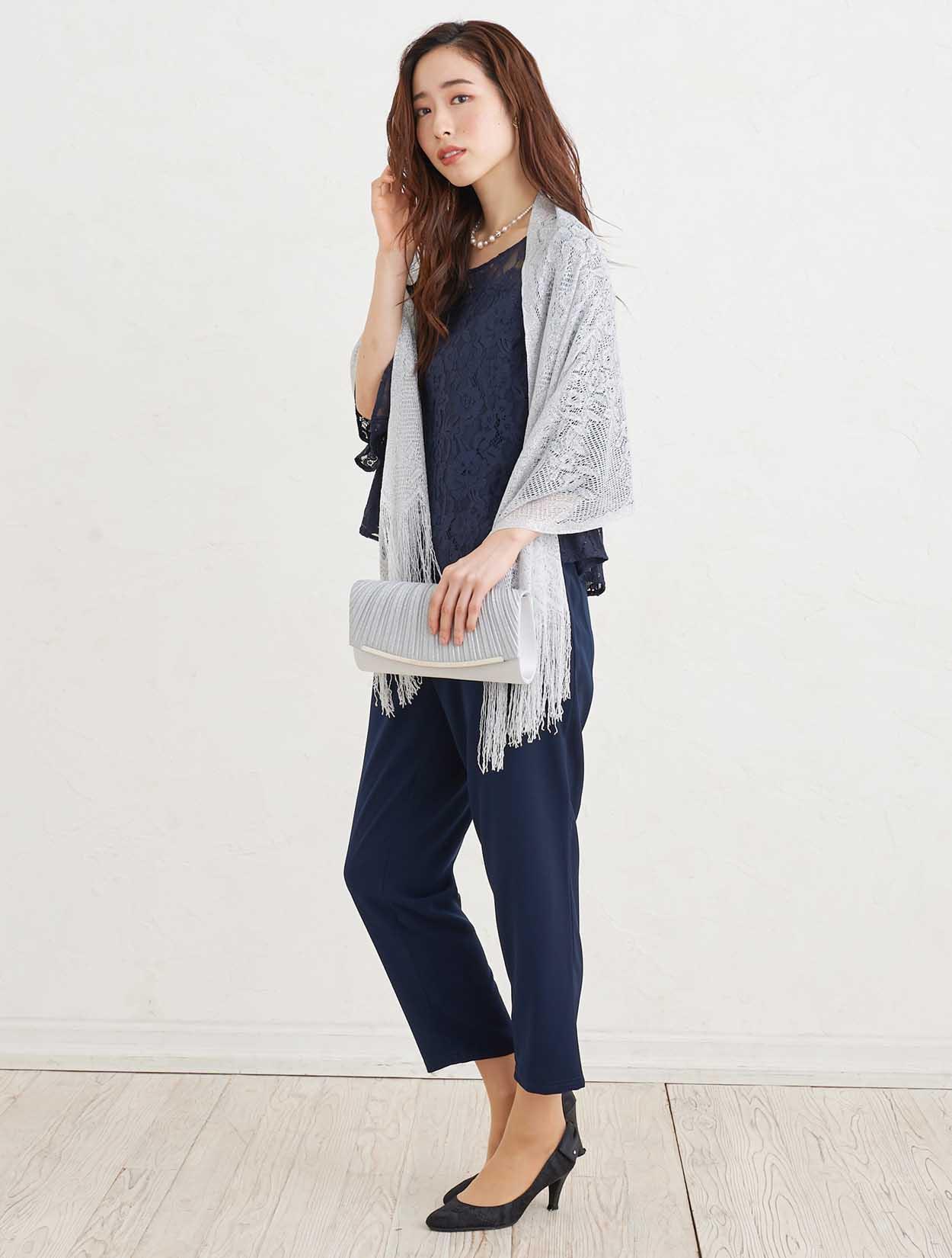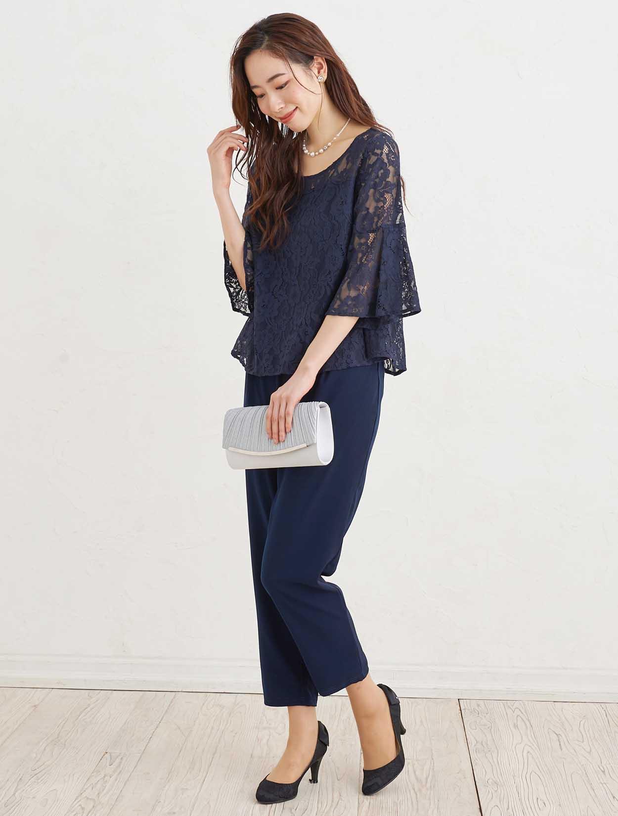 ■シンプルながら柔らかい雰囲気の出るネイビーのパンツドレスにシルバーの小物を合わせシックな印象のコーディネート。